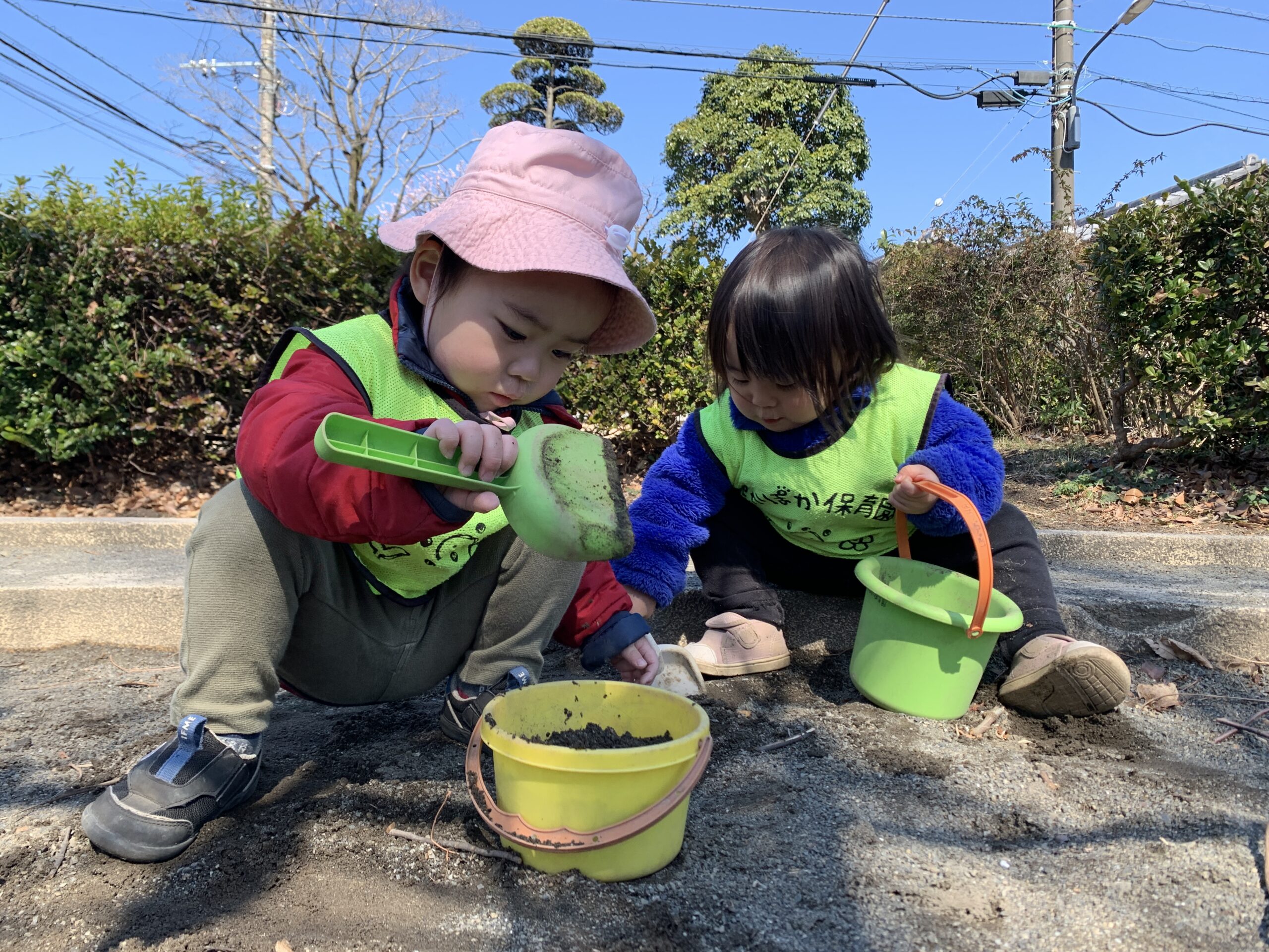 その後、お砂場にいっぱい移動して、バケツに砂をのせてトントンと遊んで、石や枝を飾って楽しかった♪ その表情はとても今日、本気で楽しんでいるのが面白かったです♡ お砂場遊びは、想像力や手先の器用を育む素晴らしい遊びです!