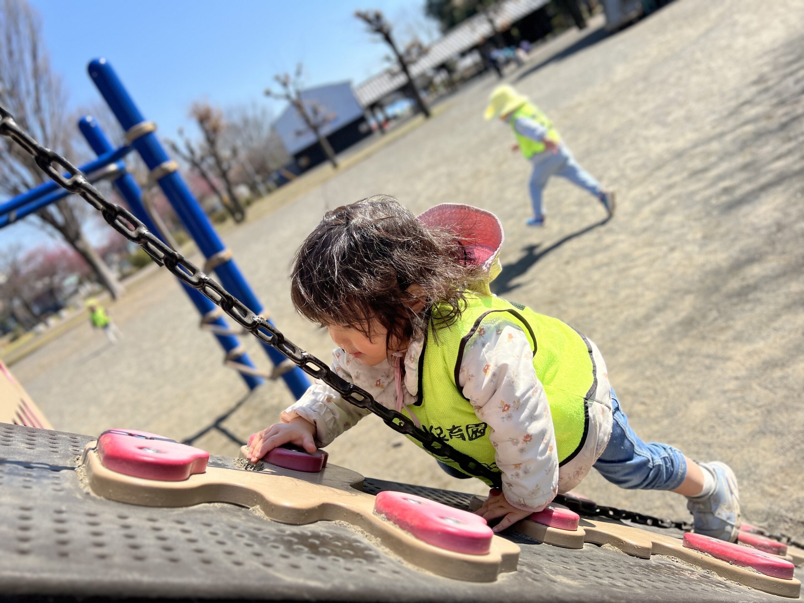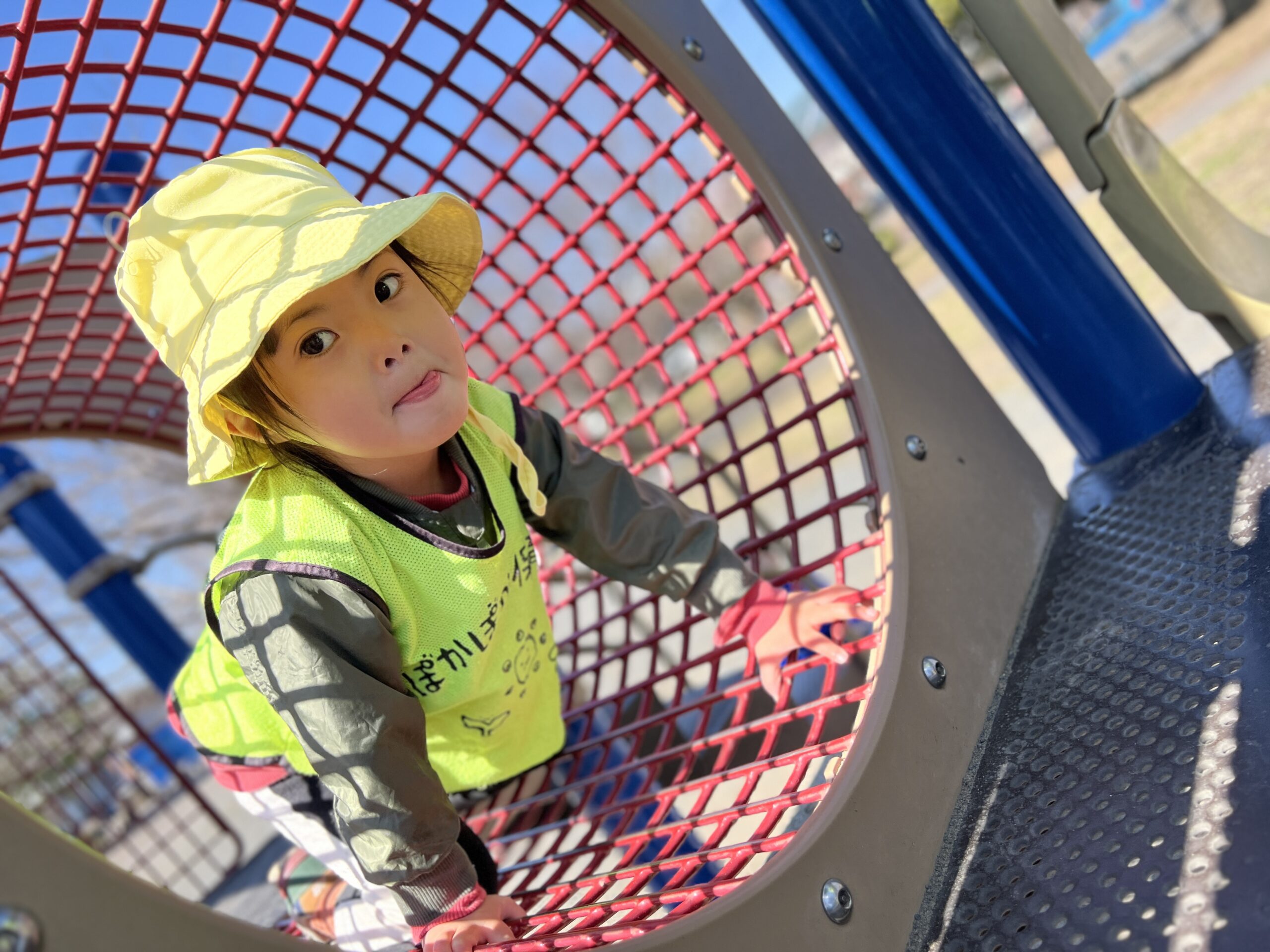 公園では、砂場で泥団子を作ったり、滑り台を滑ったりして、たくさん体を動かして遊びました♪ 遊具の網を身体を使ってぐるぐる遊びでは、みんな「できた!」と何度も挑戦してました! みんなで遊んで、お友達と協力や社会性も自然に育てています☆