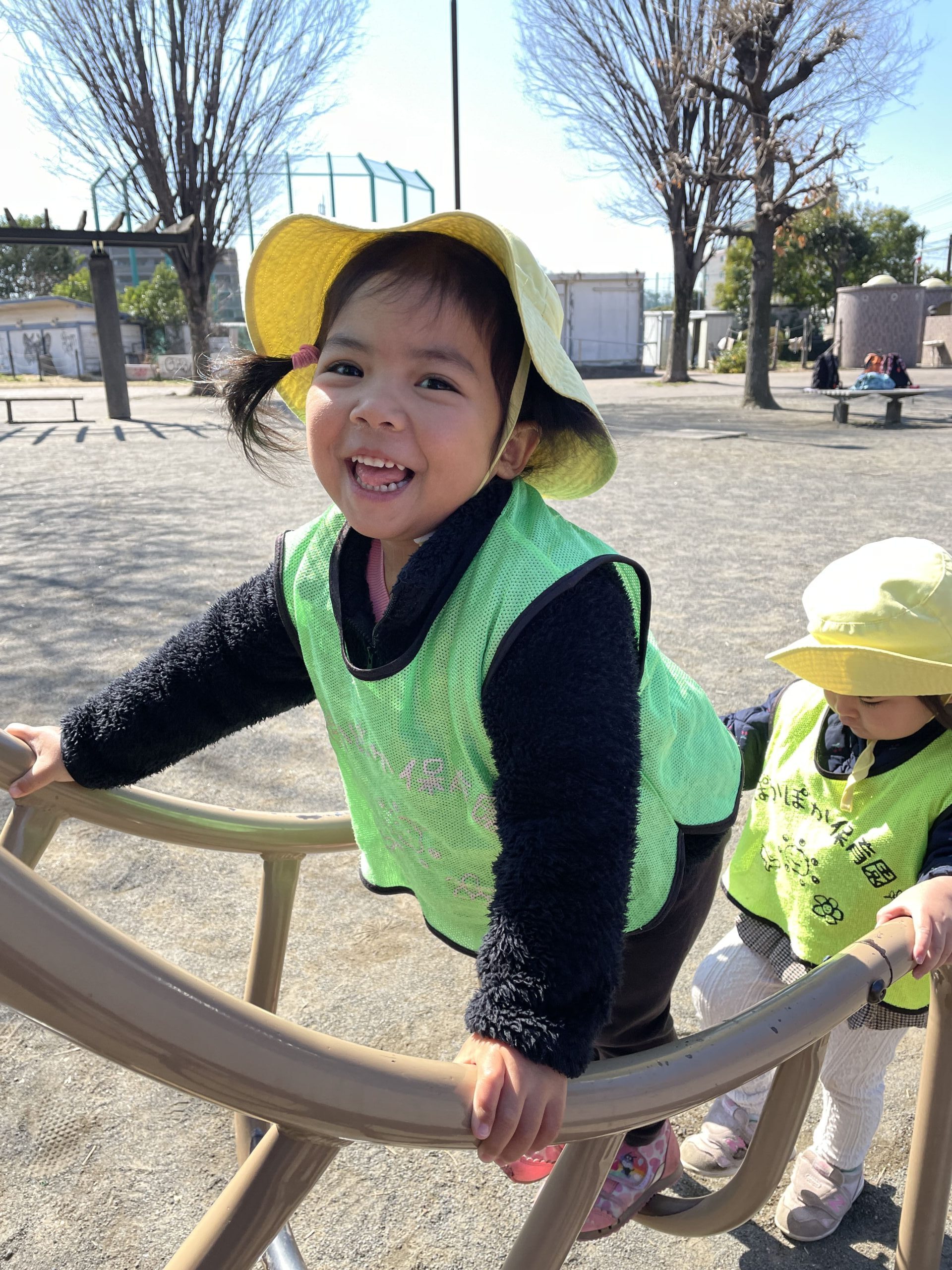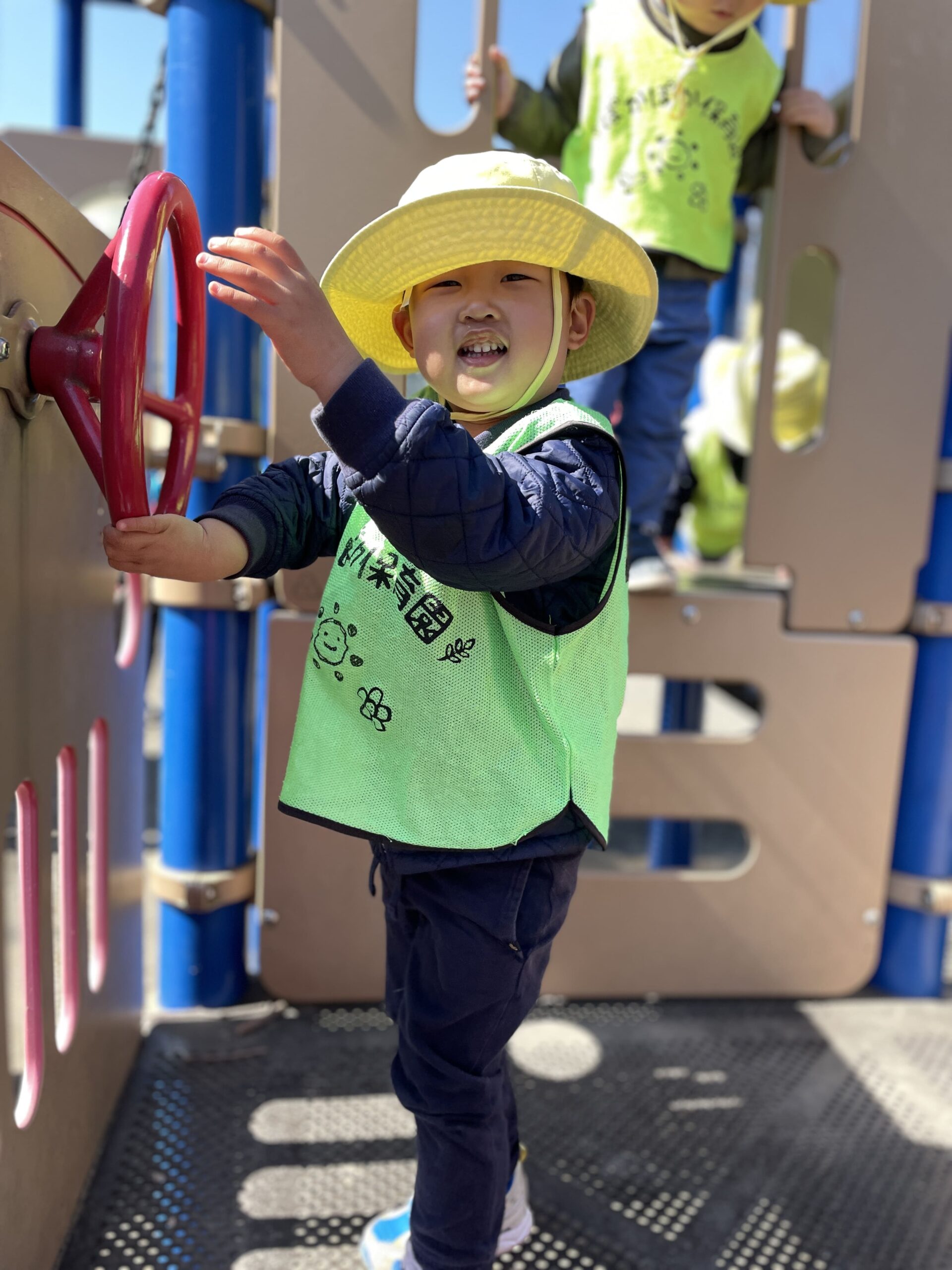 次に、2歳の「バスのお出かけ楽しいね!」と大きな声で言いながら、みんなワクワクした様子。公園では、草むらがあったり、大きな遊具があったりしてお友だちともたくさん体を動かして楽しみました。