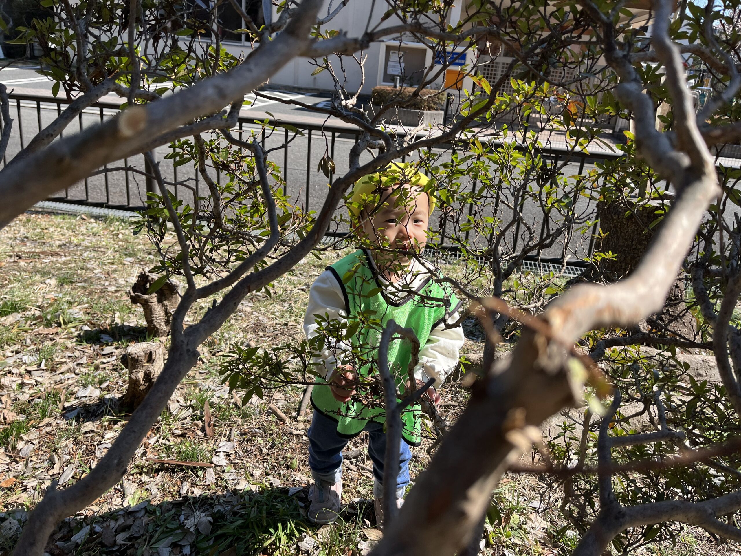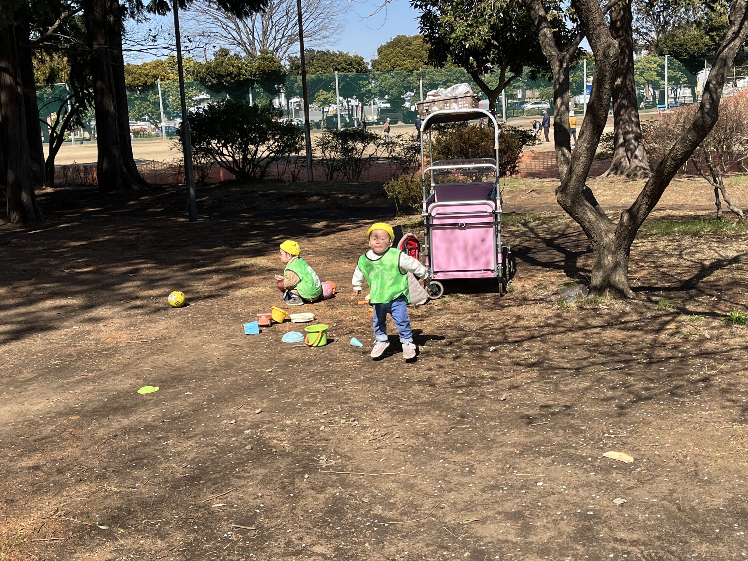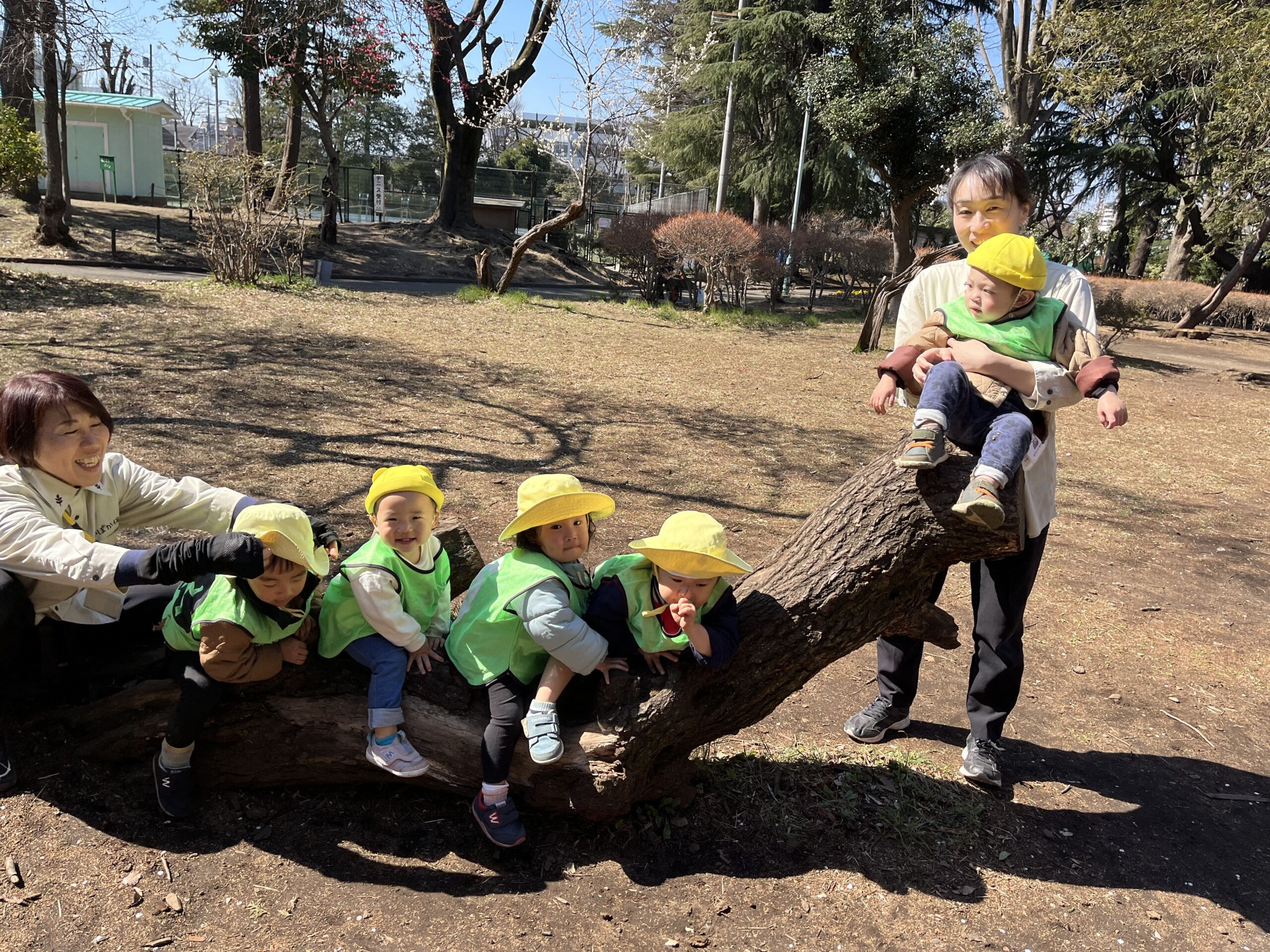 0,1歳児さんたちは避難訓練の後、公園で遊びました。広場には大きい木があり、かくれんぼにも最適です。切り株の穴を見つけてみたり、倒木にまたがってバスごっこも「ぼく、運転手さん!」と張り切ったお友だちもいました。