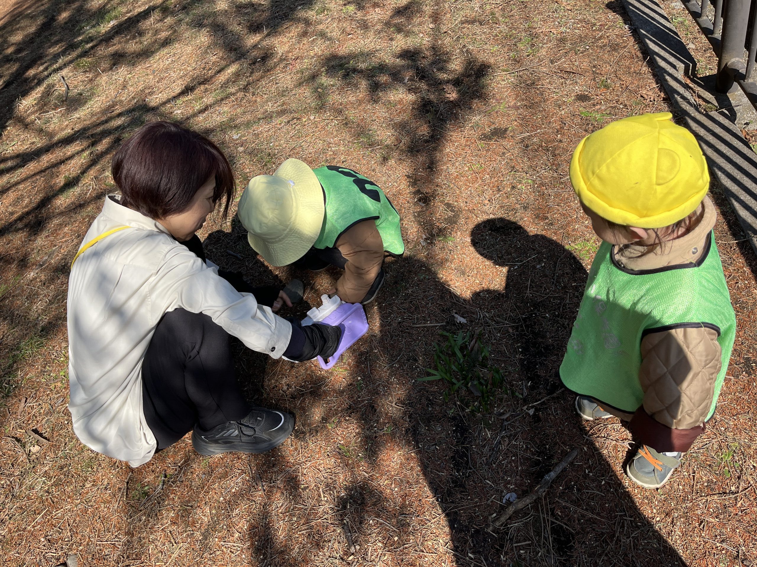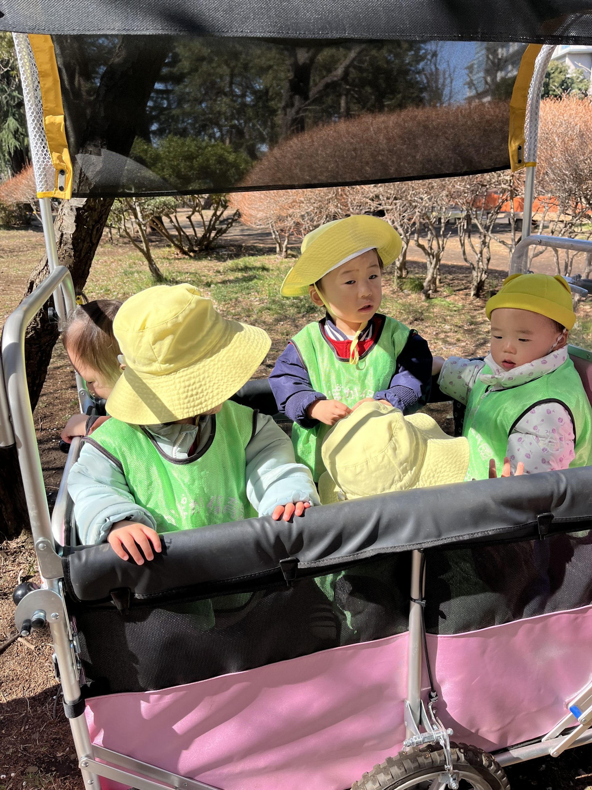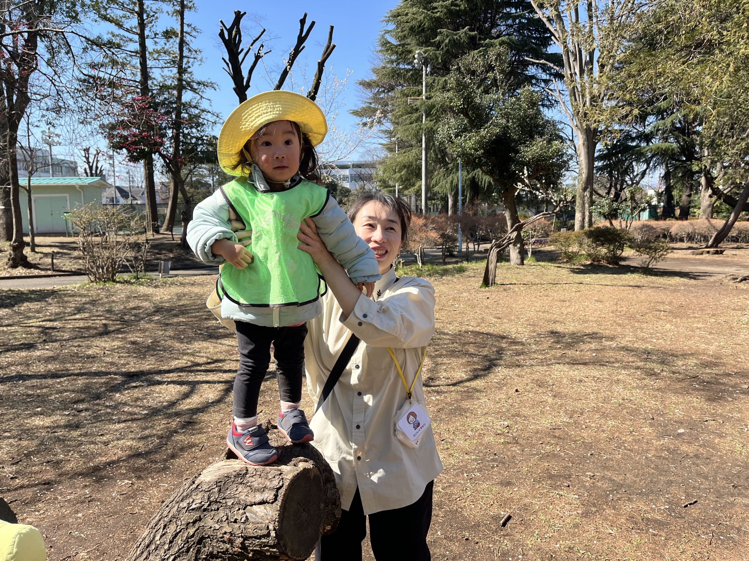 0,1歳児さんたちは避難訓練の後、公園で遊びました。広場には大きい木があり、かくれんぼにも最適です。切り株の穴を見つけてみたり、倒木にまたがってバスごっこも「ぼく、運転手さん!」と張り切ったお友だちもいました。