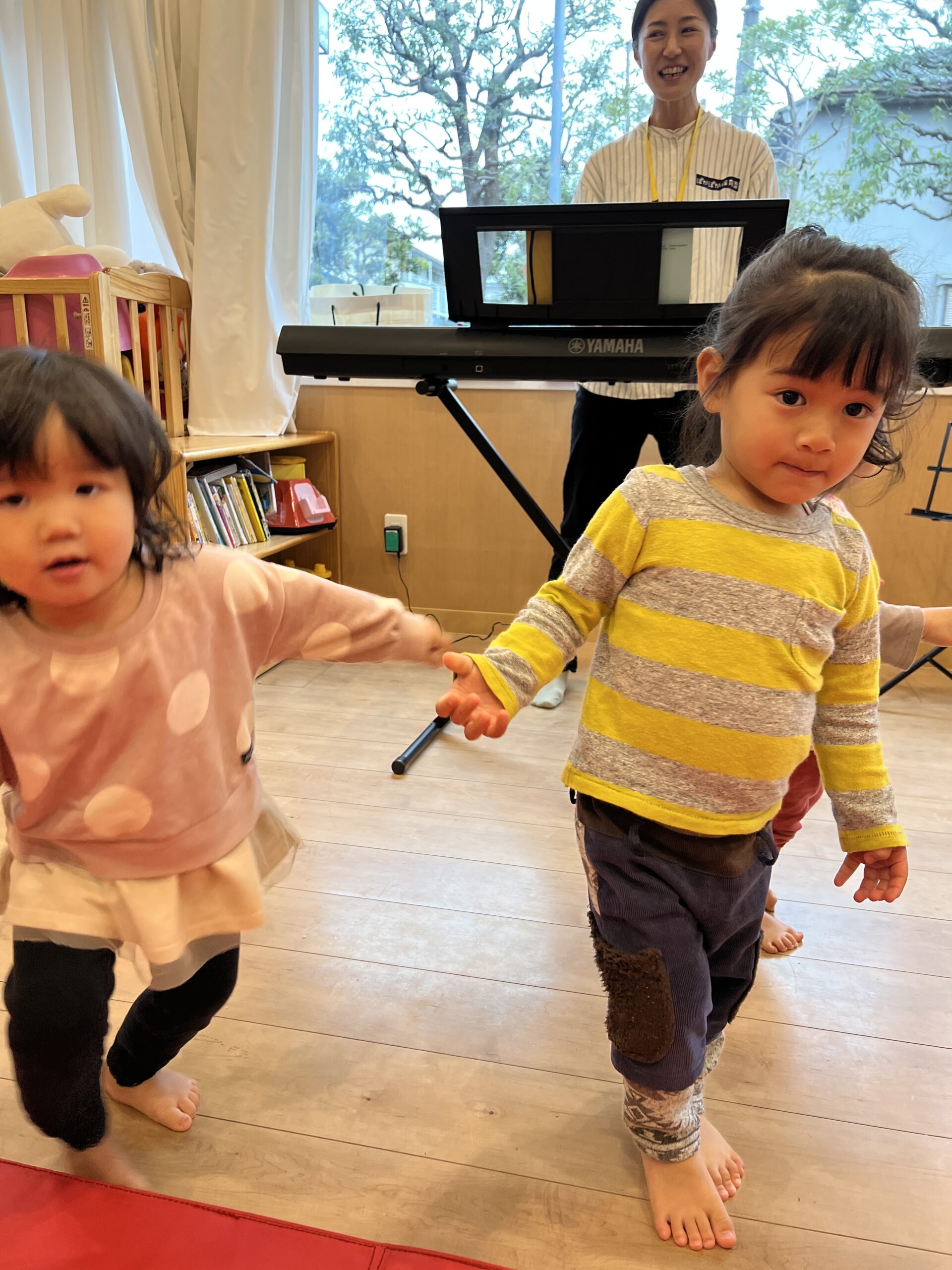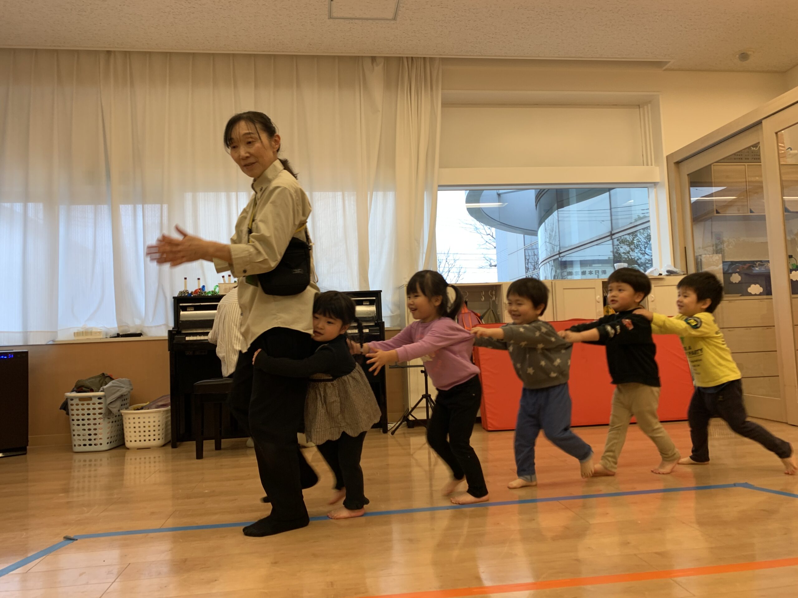 その後、マットの周りをピアノに合わせてお散歩をしました!「よーい、どん!」という掛け声とともに、子どもたちが電車のようにつながって歩く姿はとてもかわいらしかったです♪ 小さいお友だち(0、1歳)も、先生と手を繋いでリズムに合わせてよちよち歩きながら、楽しそうにお散歩していました☆ 歩きながらリズムを感じることで、体の動きが自然に整い、楽しさがさらに広がっていきましたね♡