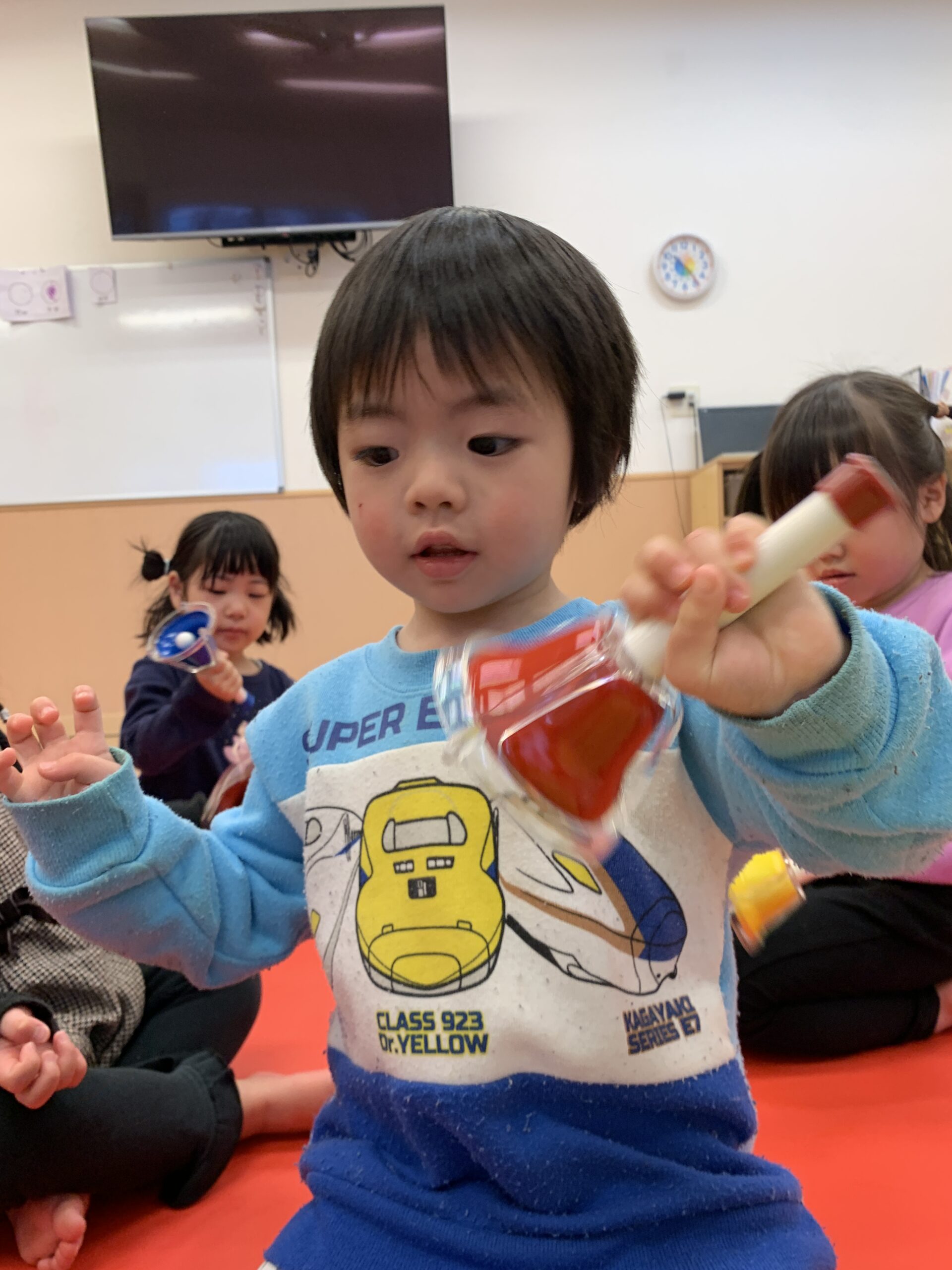 音楽の先生が「おもいっきり振るんだよ!」と教えてくれると、子どもたちはベルを大きく振って、素敵な音が鳴るのを楽しんでいました☆ その音を聞いて、みんなの顔がパッと明るくなり、笑顔が溢れていました♡ 音楽を通じて、リズム感や身体の動きも自然に育んでいますね!先生と一緒に「もっと大きく振ってみよう!」と声を掛け合いながら、音楽の世界にどんどん引き込まれていく姿が印象的でした♪