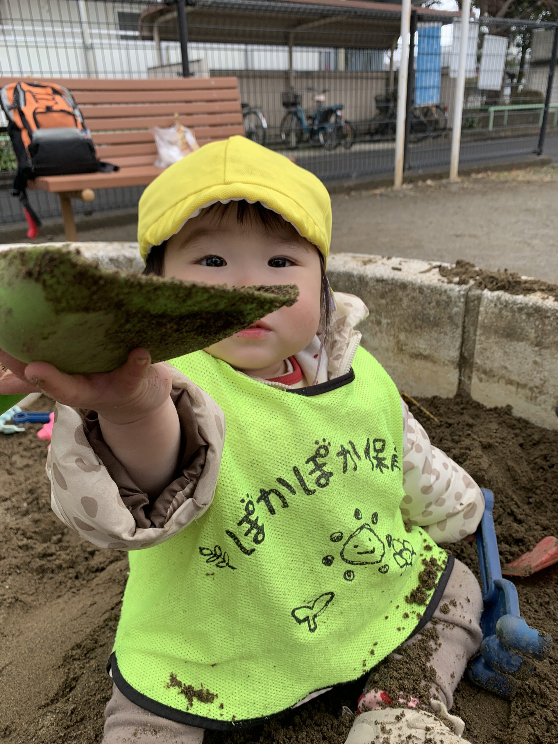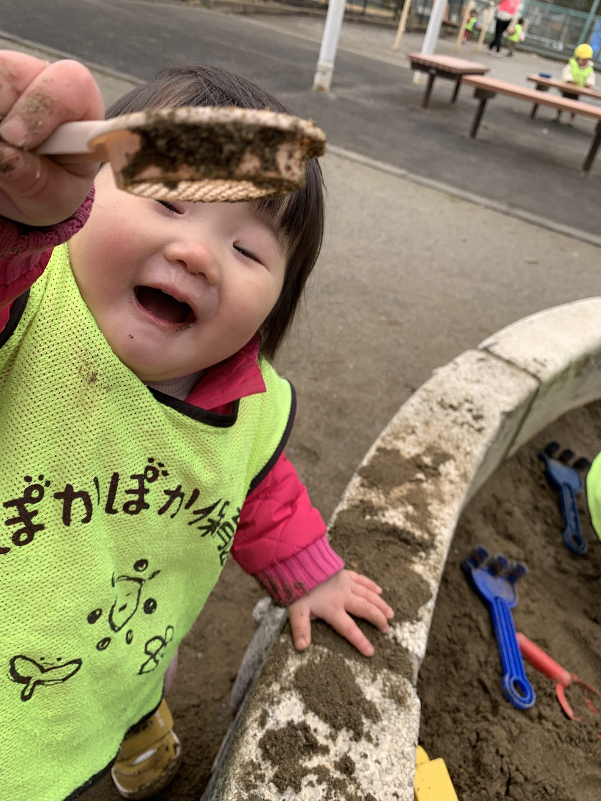そして、待ちに待ったお外遊びの時間!雨がやんで外に出ると、みんな大喜び♪ 久しぶりのお外で、砂をたくさん掘って砂遊びを楽しみました☆「ここにお城を作ろう!」とお友だち同士で協力しながら、大きな山を作ったり、砂をお皿に見立てて料理ごっこをしたりして、思いっきり遊びました!外遊びでは、自由に遊ぶ中でお友だちとの関わりや想像力を育むことができます♡