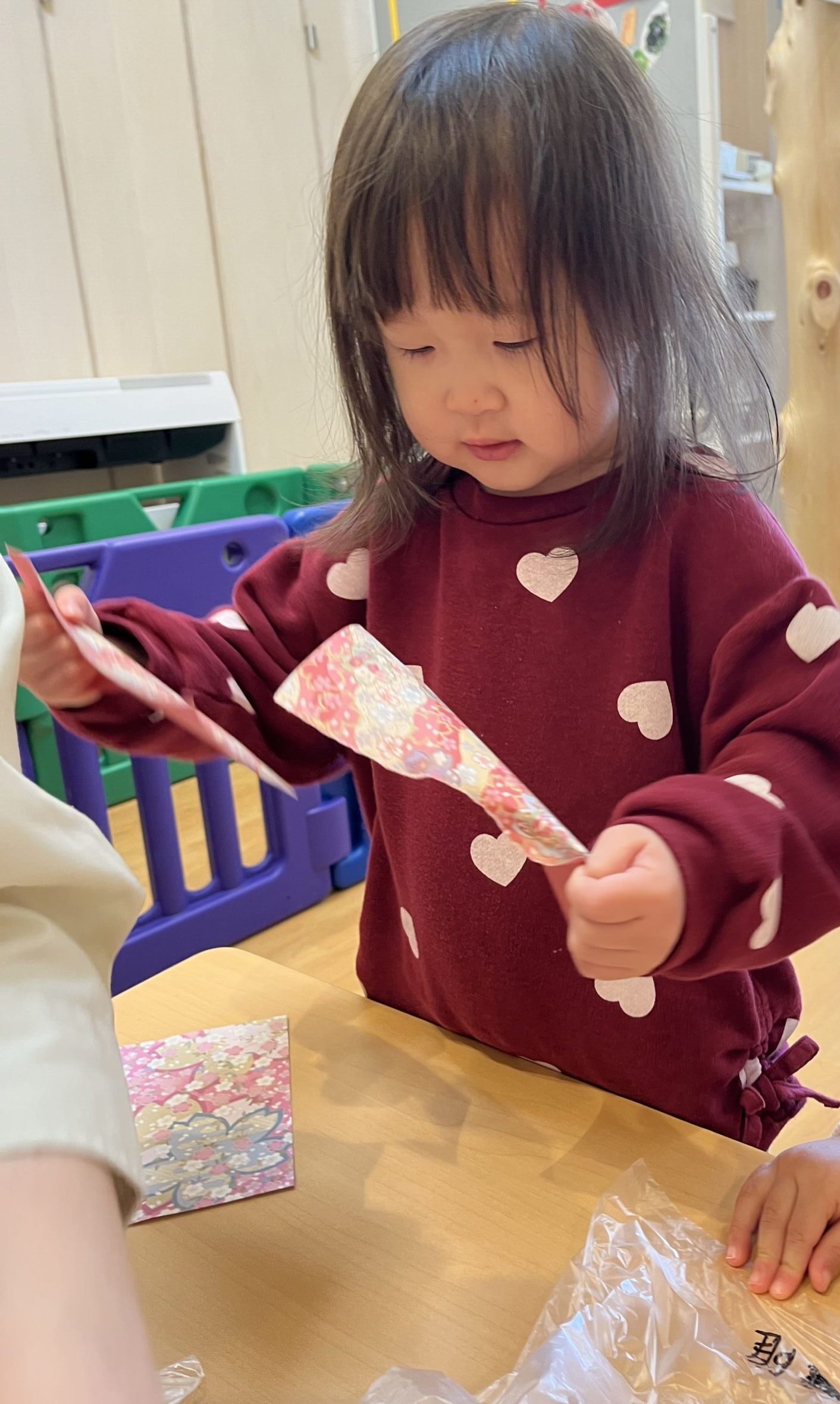0歳児さんも頑張って折り紙をちぎります。