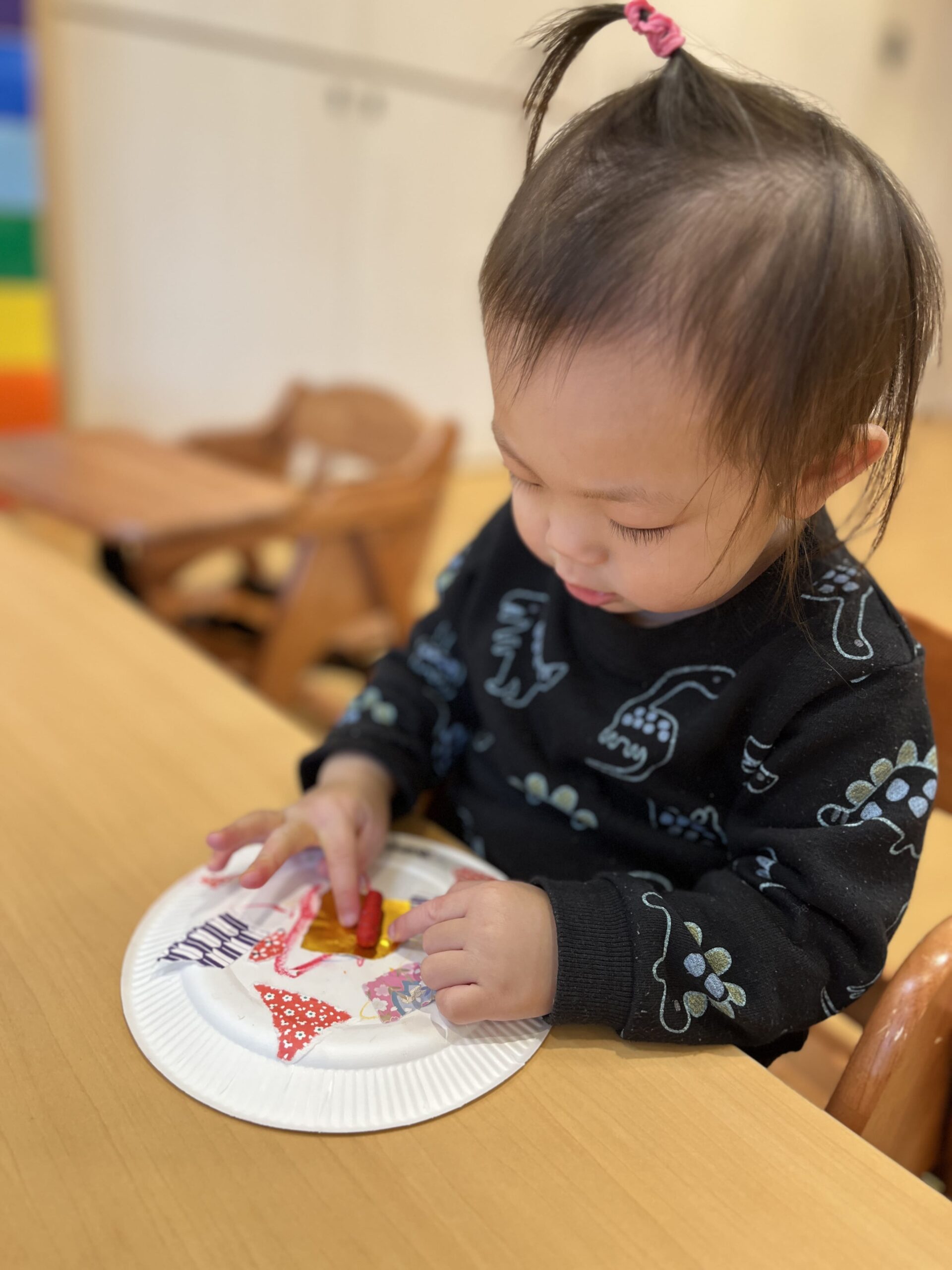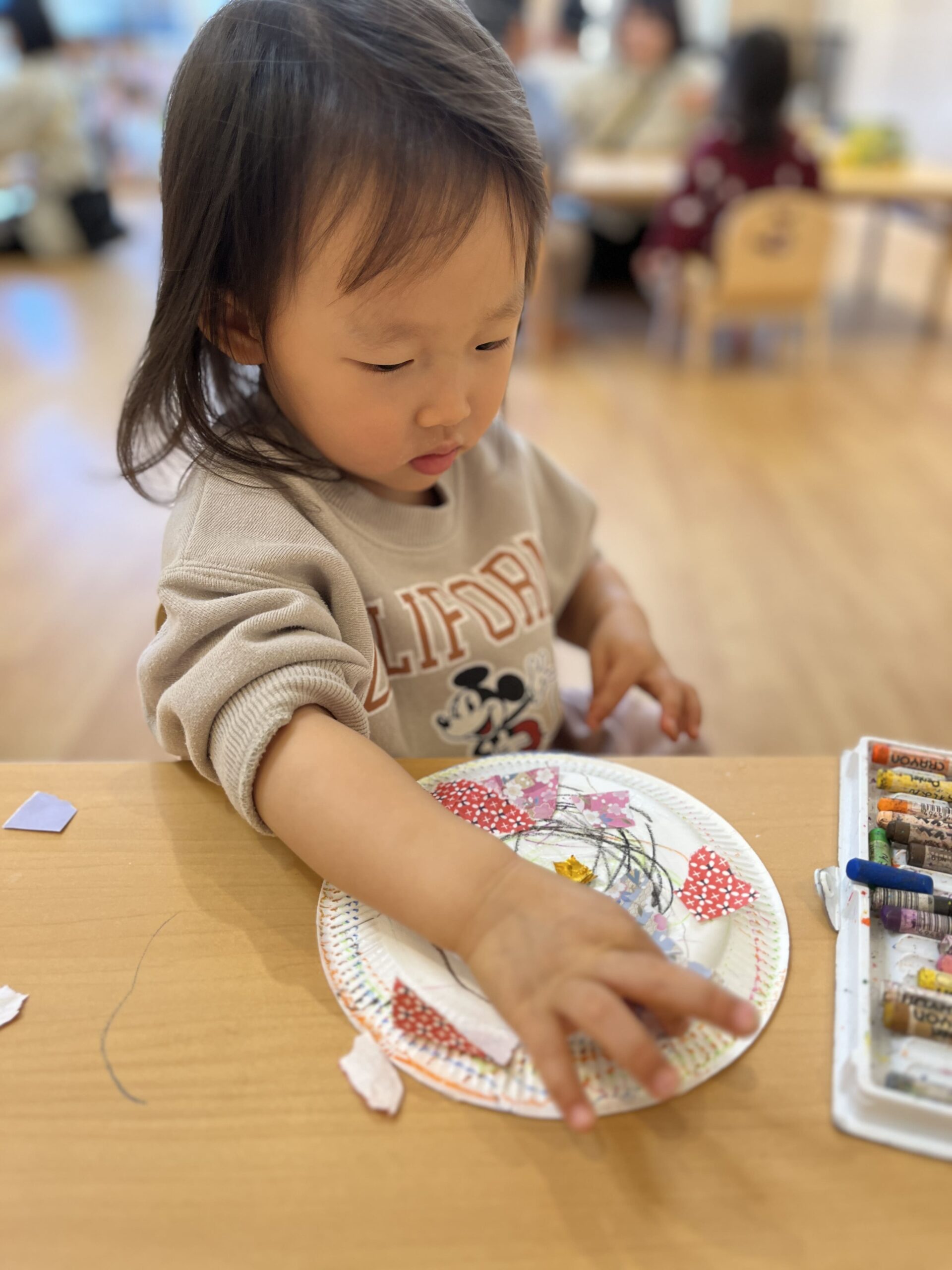 クレヨンで模様を描いて、好きな折り紙を選んでちぎって、丁寧に糊で貼って…