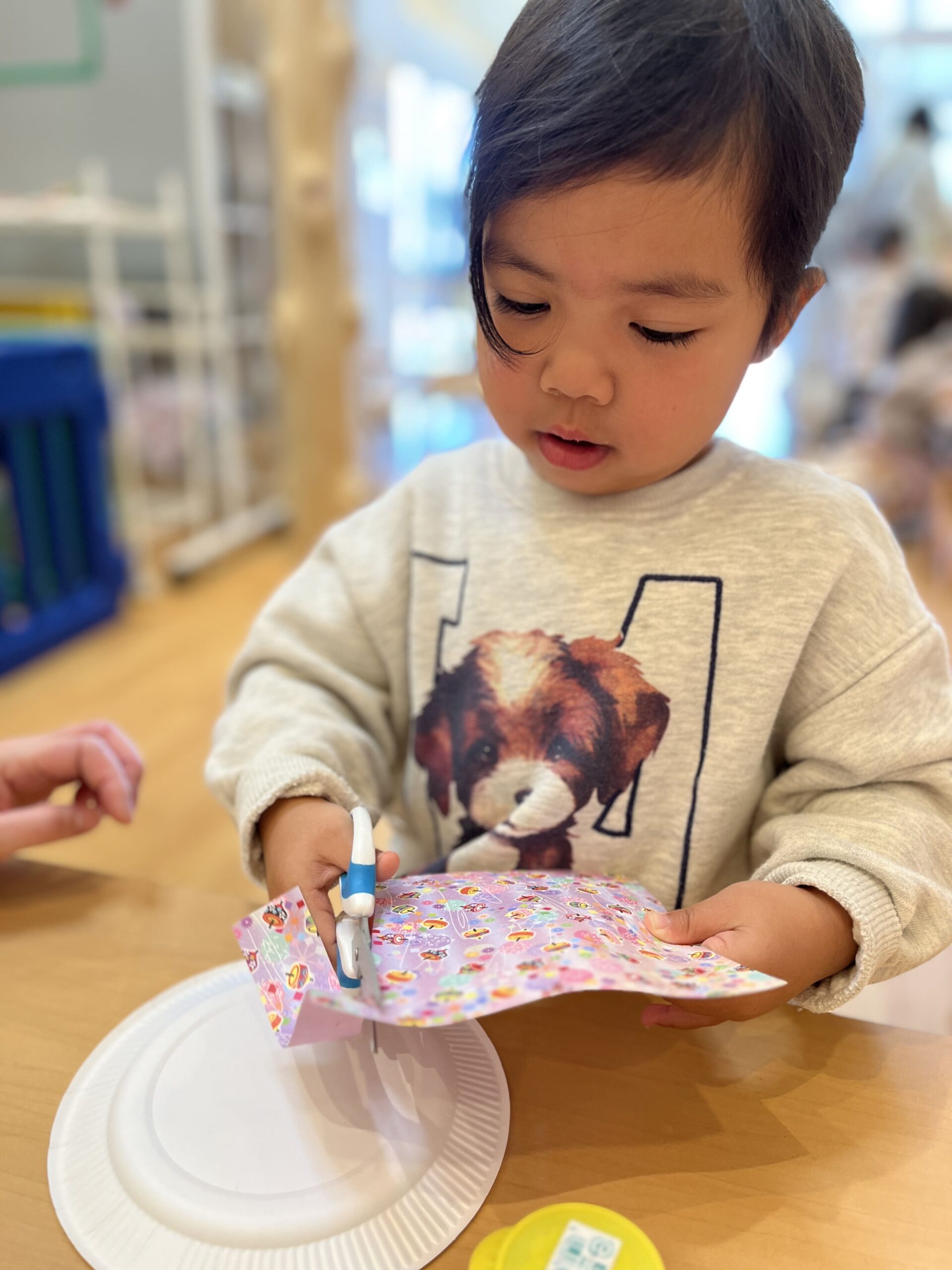 「手を切らないようにきをつけて、しっかり自分のおててを見るんだよ」と先生に見守られながら、2歳児さんはハサミも上手に使えるようにまりました。