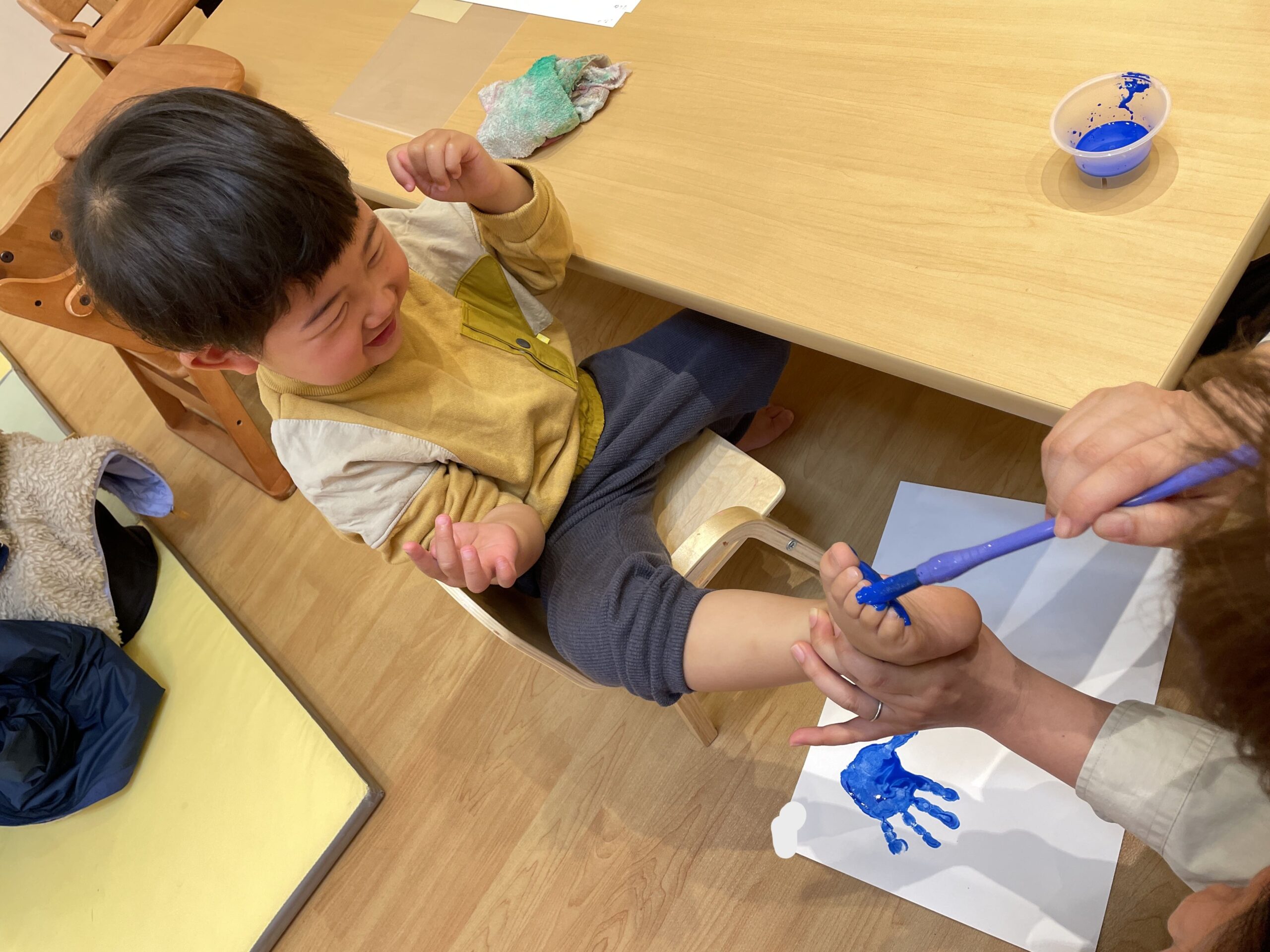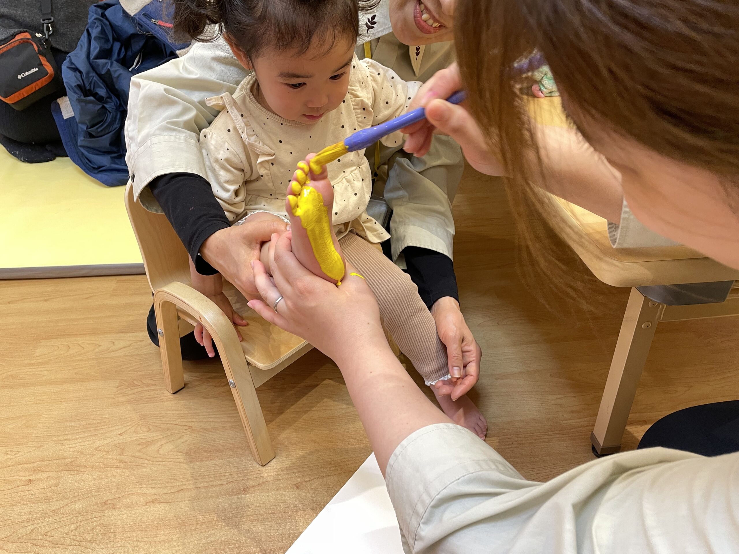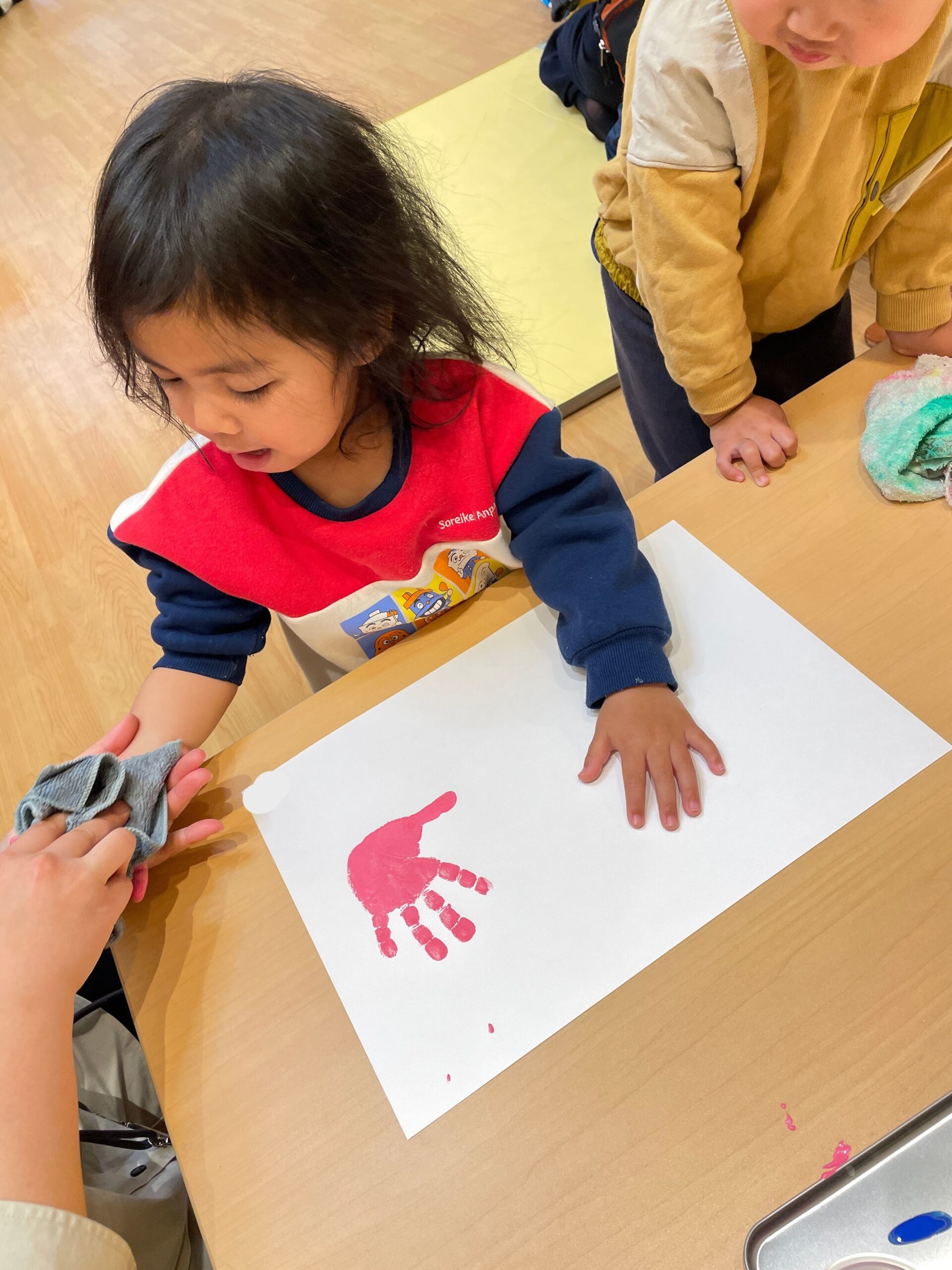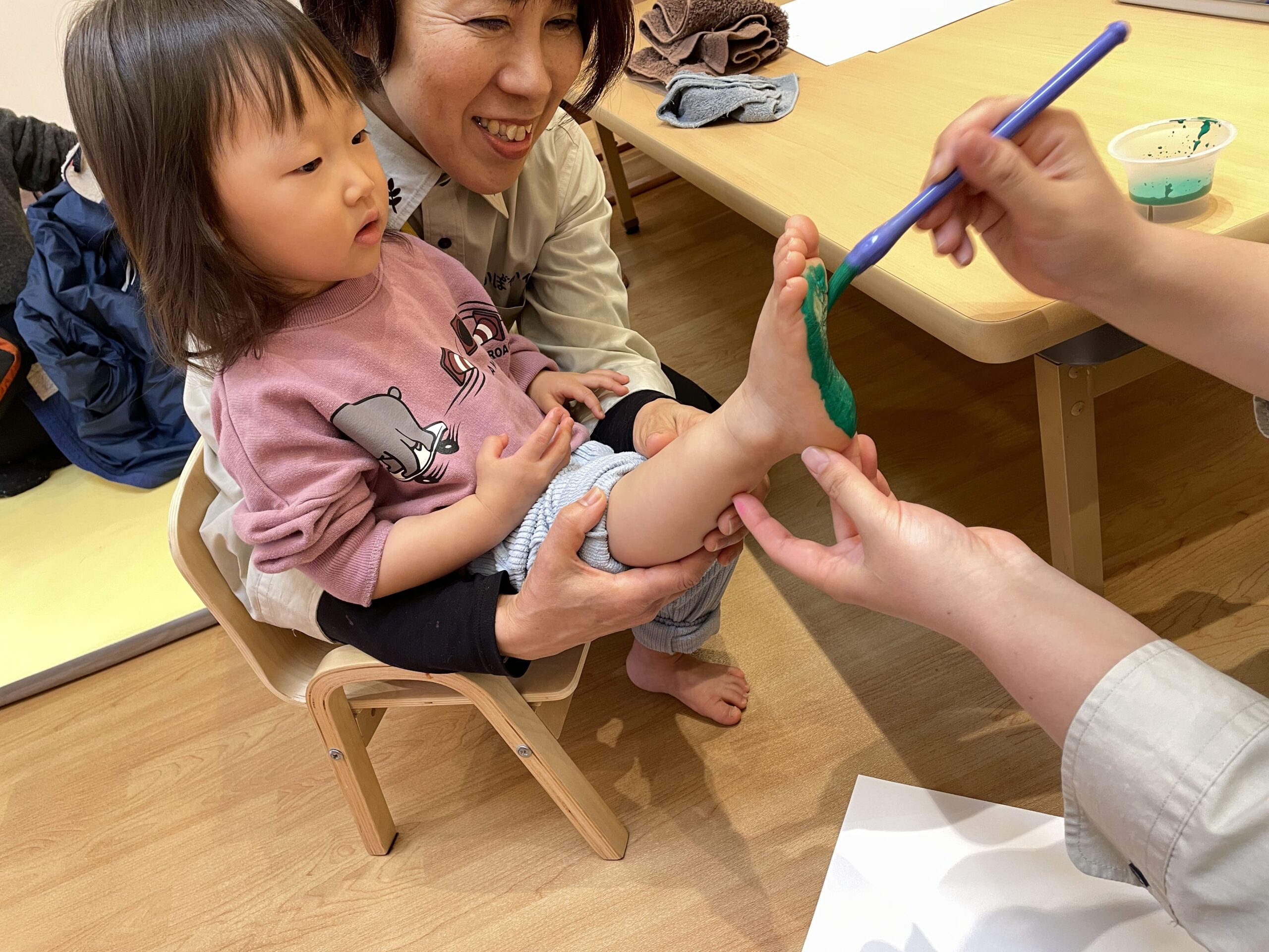 手形足形アートでは、好きな色を自分で選んでペタペタ。まだ言葉がうまく出ない子も、しっかり指差しでお気に入りの色を伝えてくれました。筆で手に絵の具を塗ると「くすぐったい!」と笑う子、4月から何度も経験している子は慣れた様子で「上手にできるよ!」と堂々と押していました。白い画用紙の上に、カラフルな花が咲いたように仕上がりました。