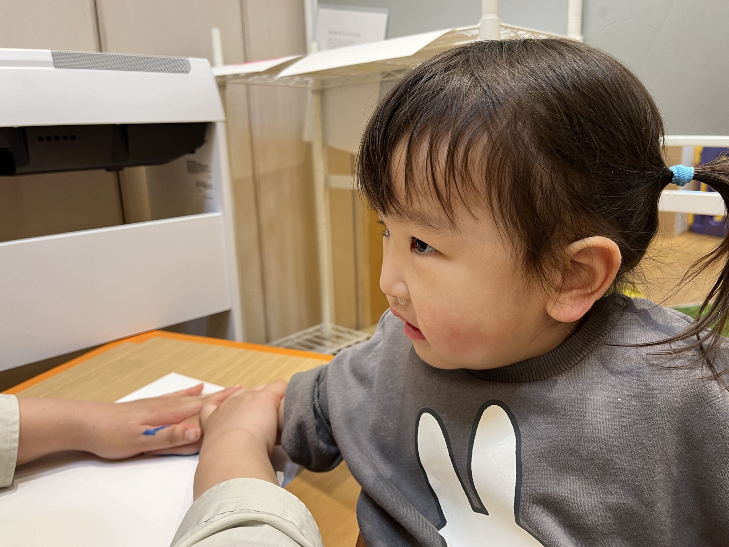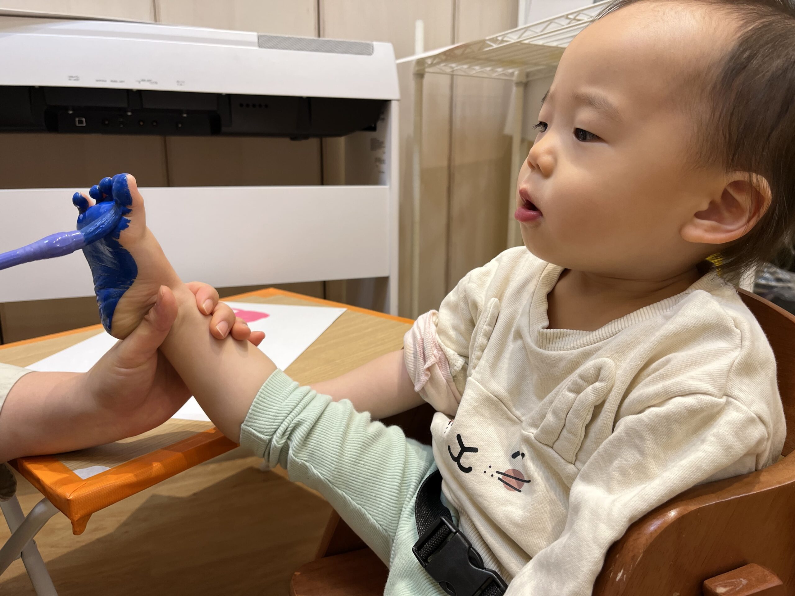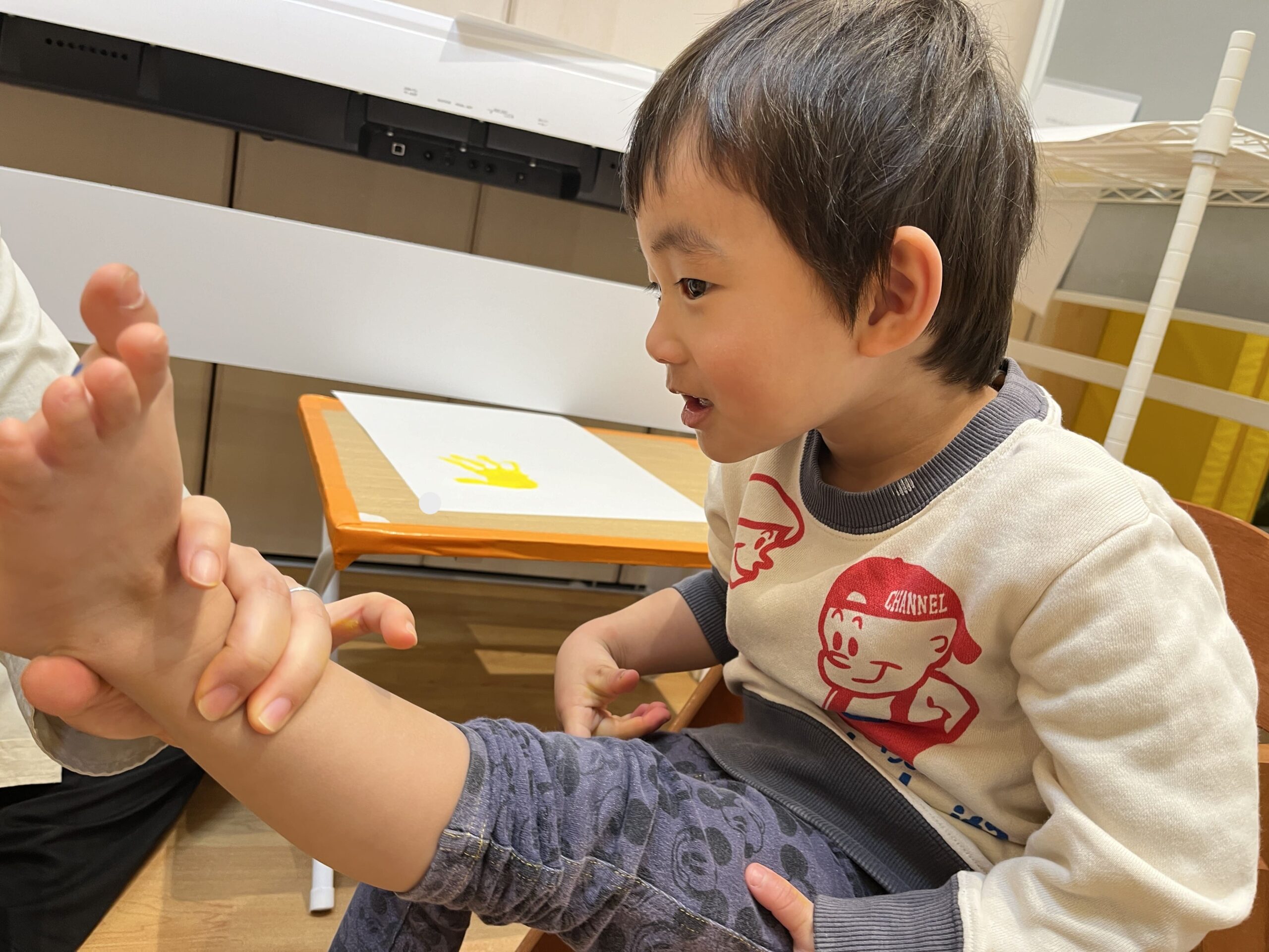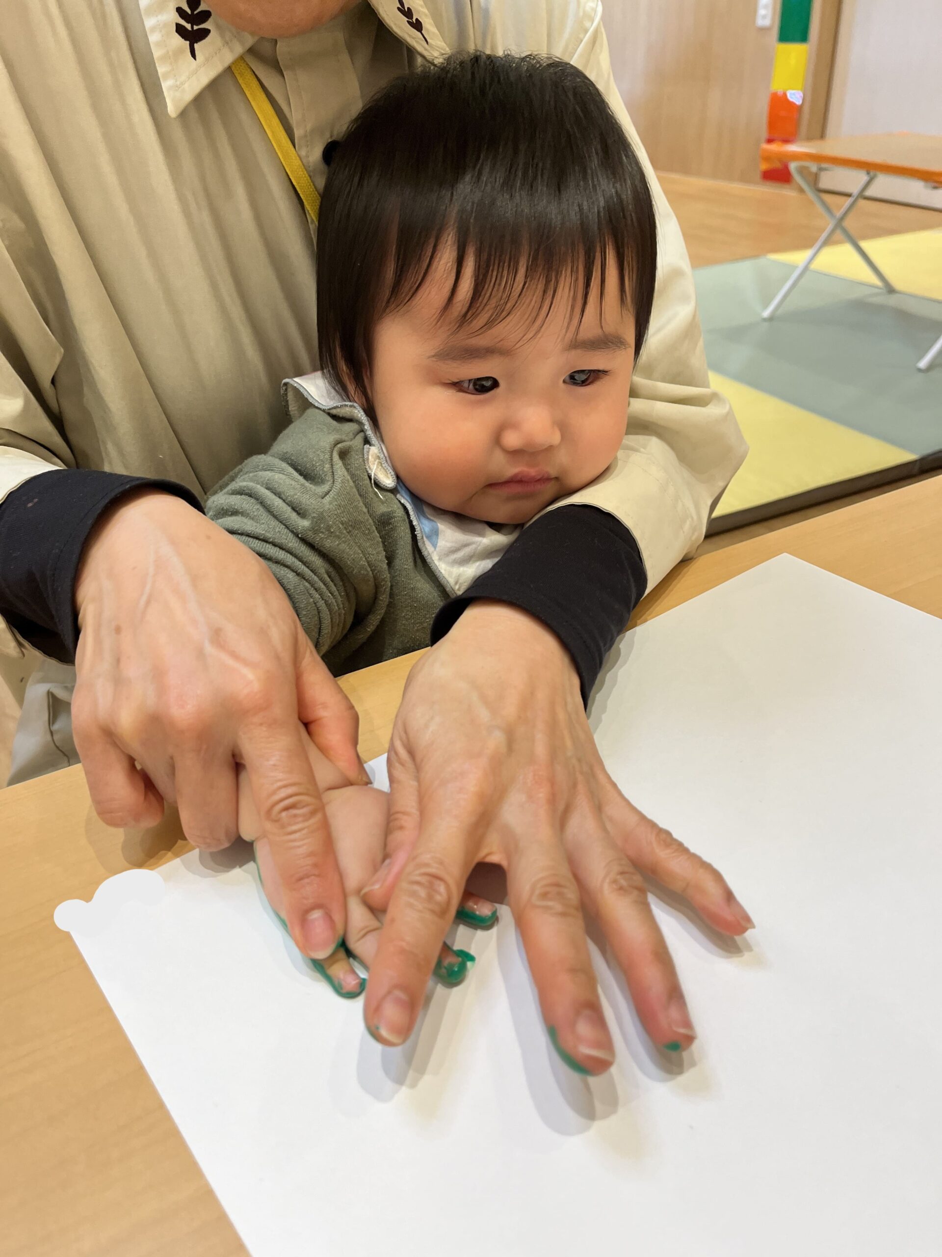 手形足形アートでは、好きな色を自分で選んでペタペタ。まだ言葉がうまく出ない子も、しっかり指差しでお気に入りの色を伝えてくれました。筆で手に絵の具を塗ると「くすぐったい!」と笑う子、4月から何度も経験している子は慣れた様子で「上手にできるよ!」と堂々と押していました。白い画用紙の上に、カラフルな花が咲いたように仕上がりました。