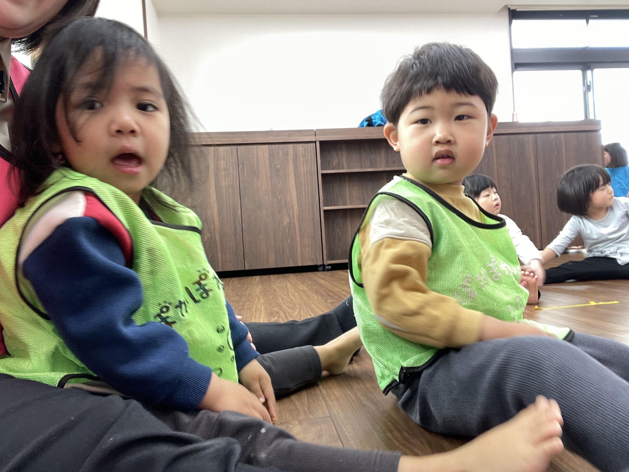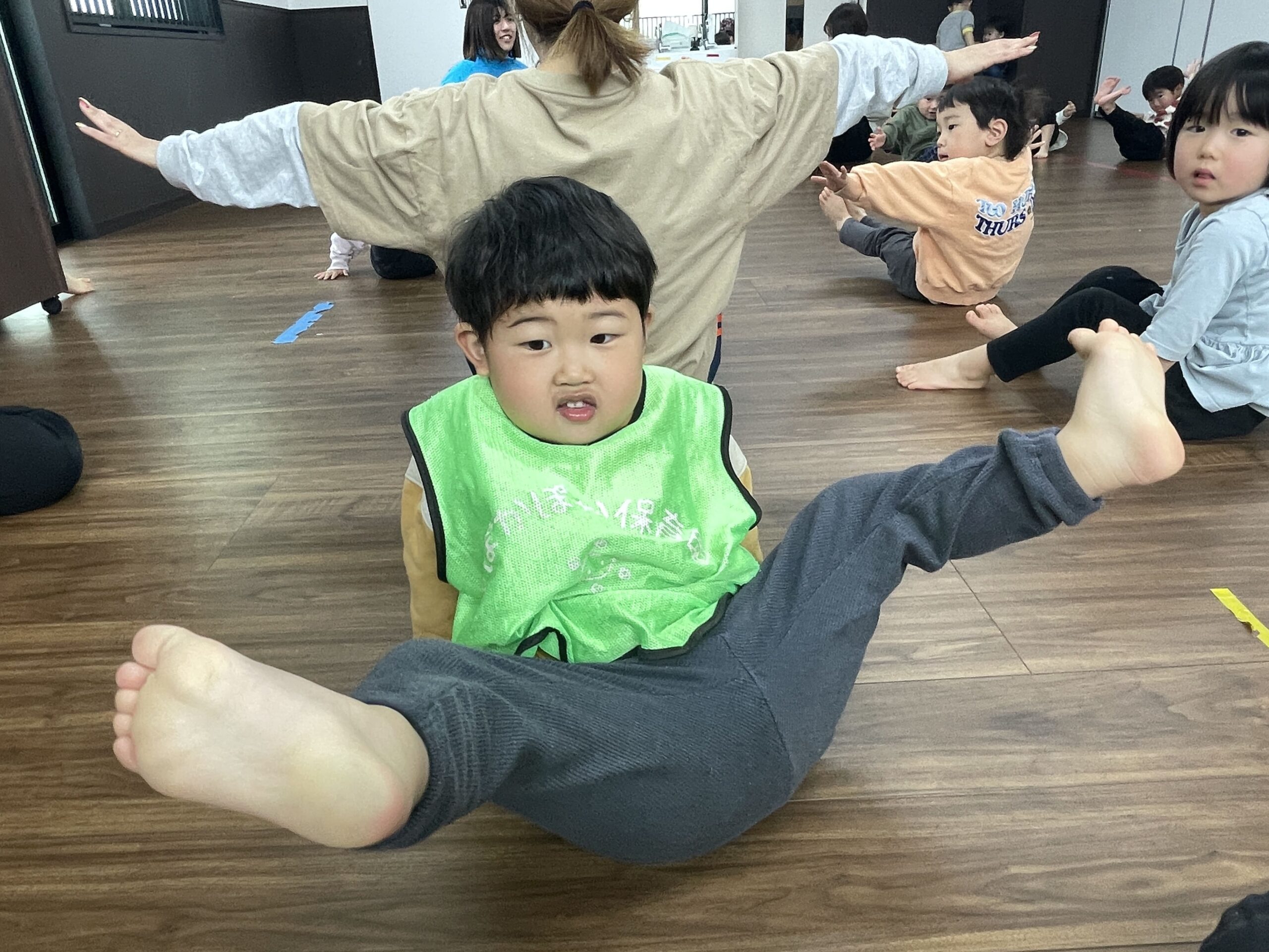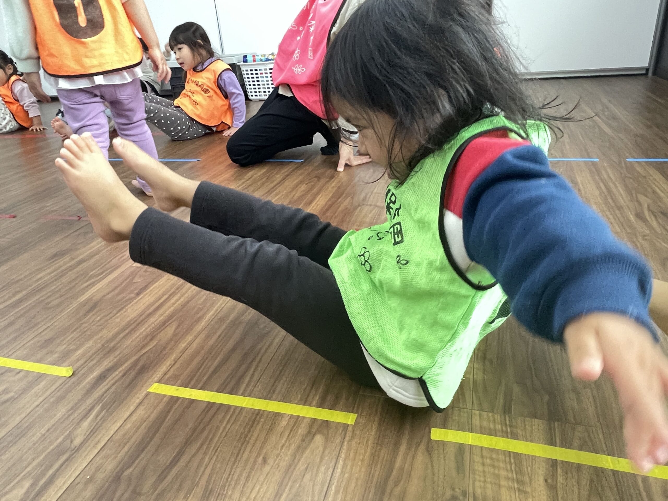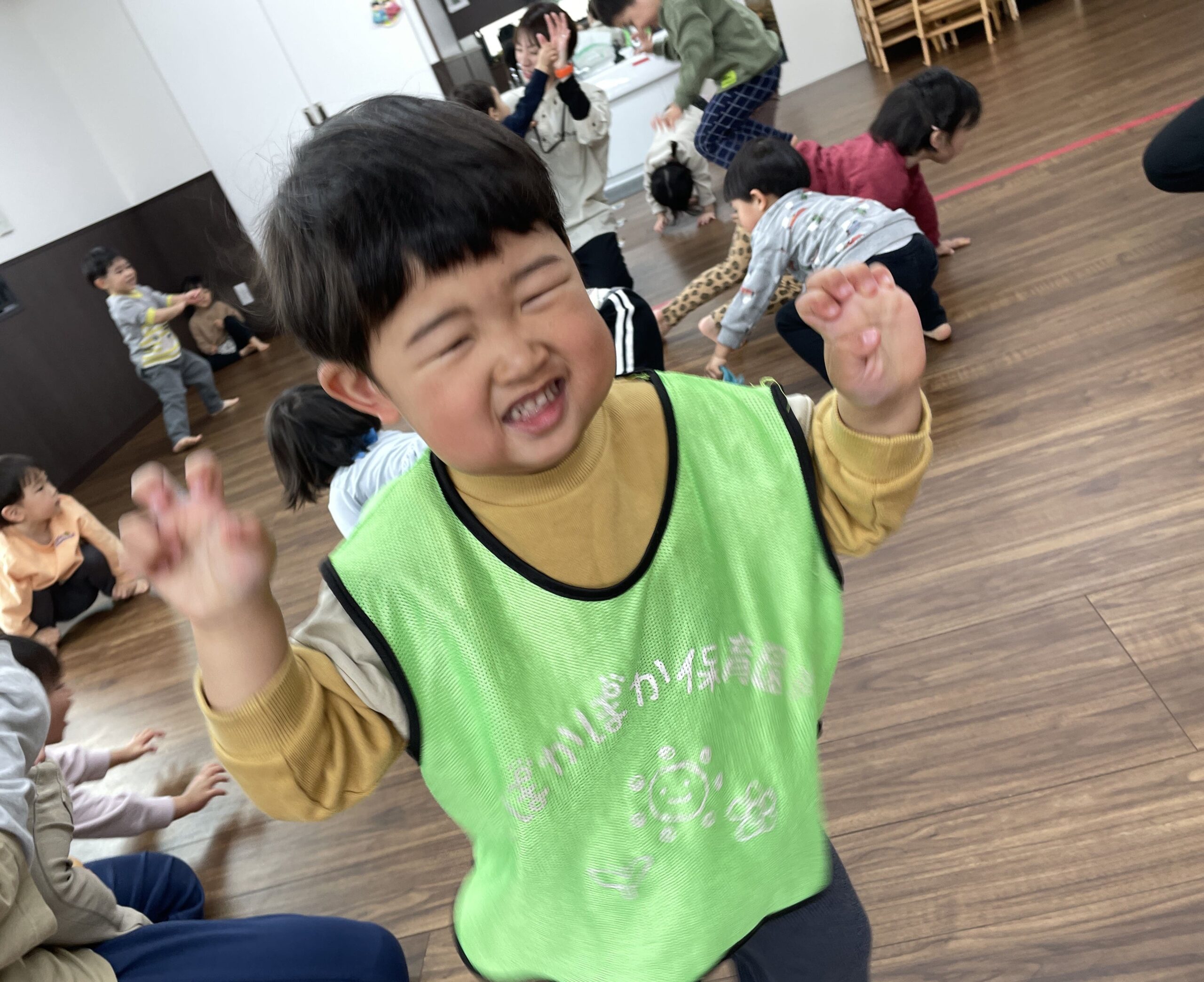 今日は曇り空の下、子どもたちは室内やテラス、ダンス活動など、さまざまな遊びを楽しみました。