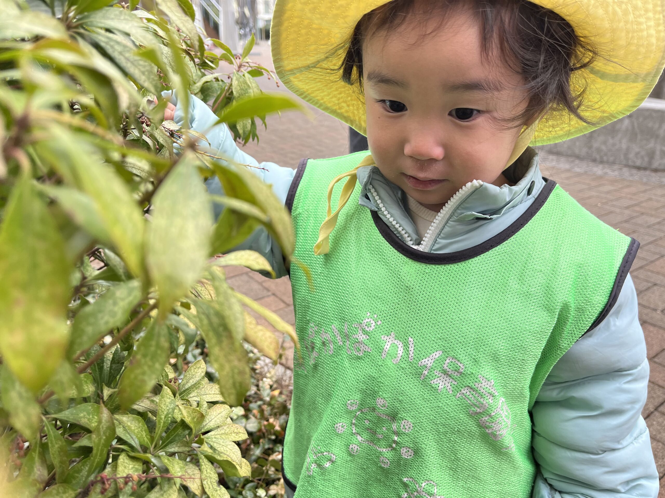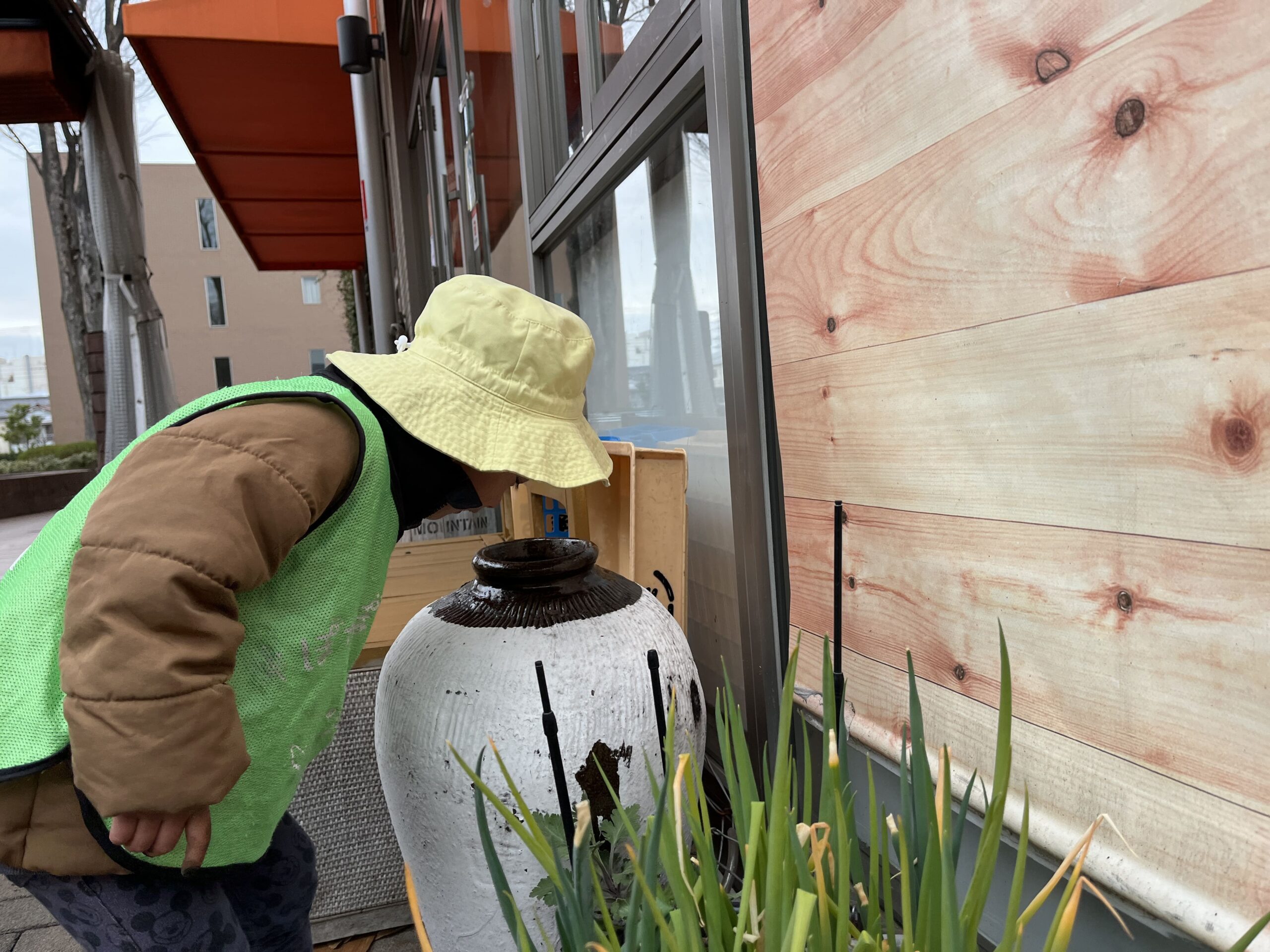 0~1歳児さんはテラスで自然を満喫。石や枝、土をじっくり観察したり、拾った石をお友だちと見せ合ったり。中には「これ、なんだろう?」と壺を覗き込む子もいて、好奇心いっぱい。身近な環境から新しい発見ができるのは、小規模保育事業ならではの手厚い保育の魅力です。