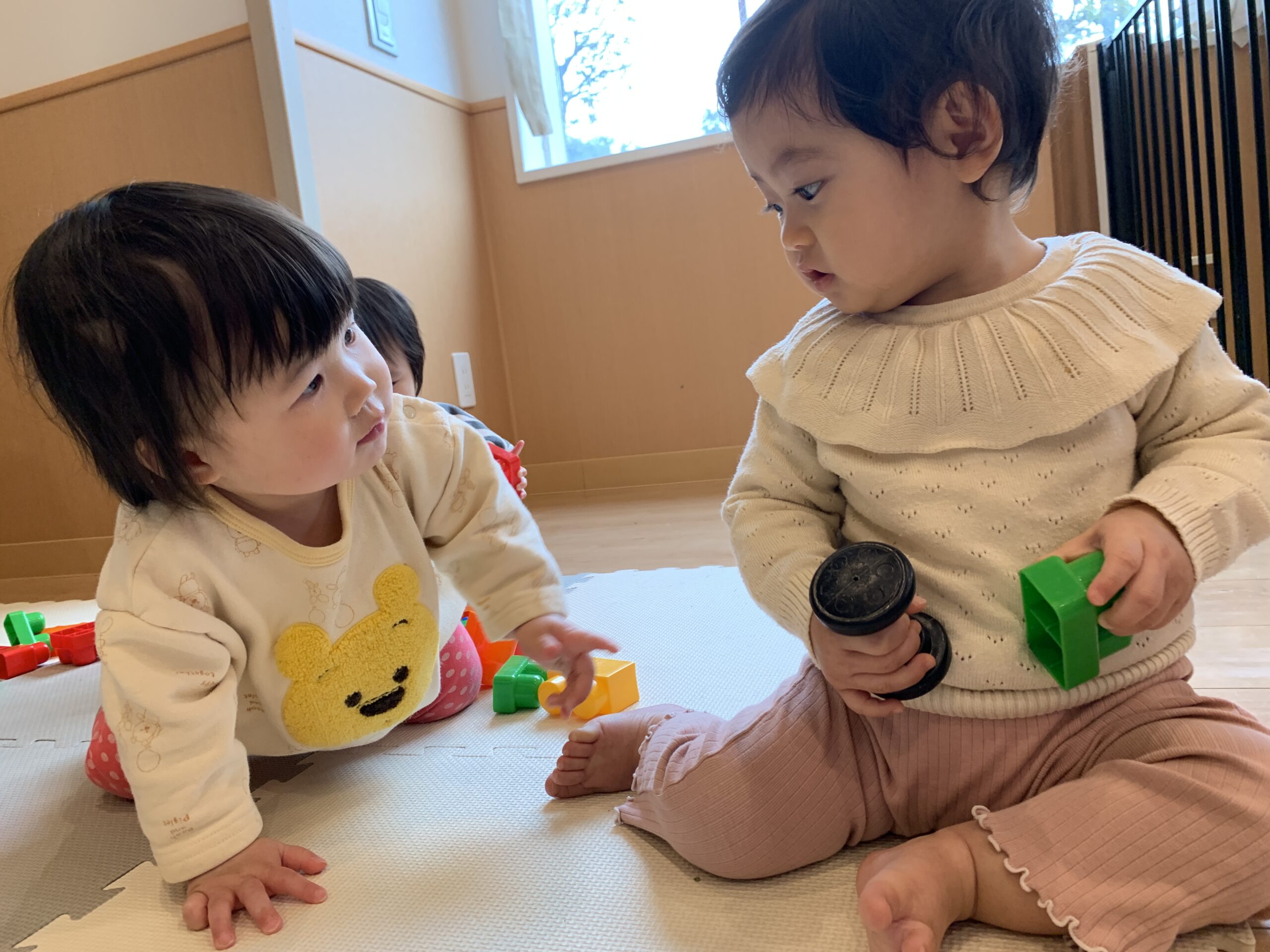 まず、小さいお友だちはお部屋でゆっくり遊びました。おもちゃを手に取り、じっくり遊びながら、みんなの表情がとっても楽しそう♡ ゆっくりとしたペースで、興味のある遊びを見つけて、じっくり集中して遊んでいる姿が印象的でした。お部屋遊びは、子どもたちが自分のペースで楽しみながら成長できる大切な時間です☆