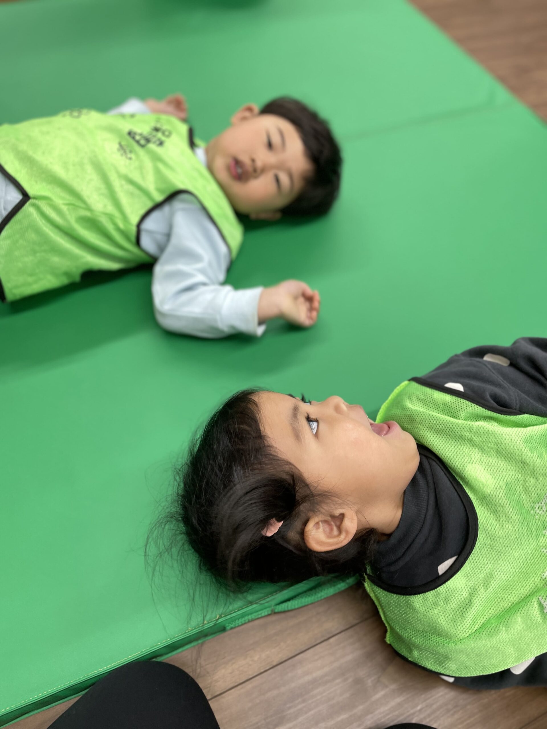 マットに寝転んで体を動かしています!勢いが良くてマットから飛び出ちゃいそう~!!