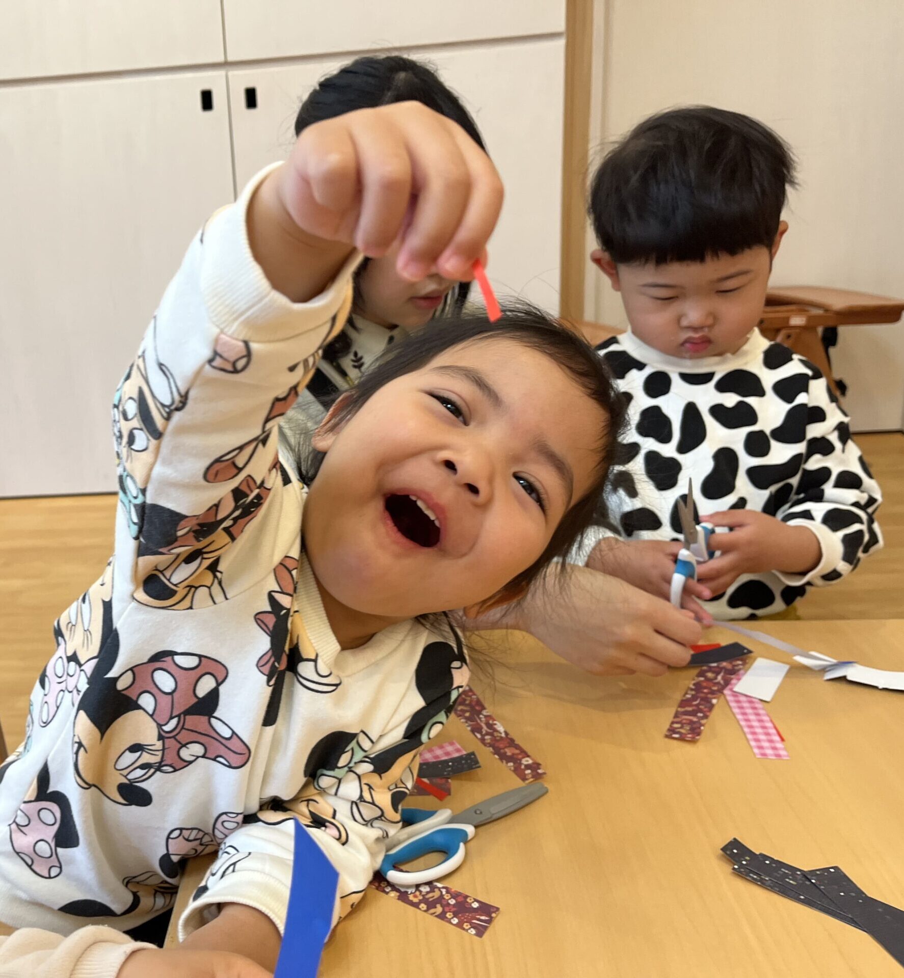 お制作では大きいお友だちはハサミに挑戦したり、小さいお友だちも髪を千切ってみたりと、指先や腕の動かし方を工夫しないとできない事です!みんな小さい手で頑張って取り組んでいました☆