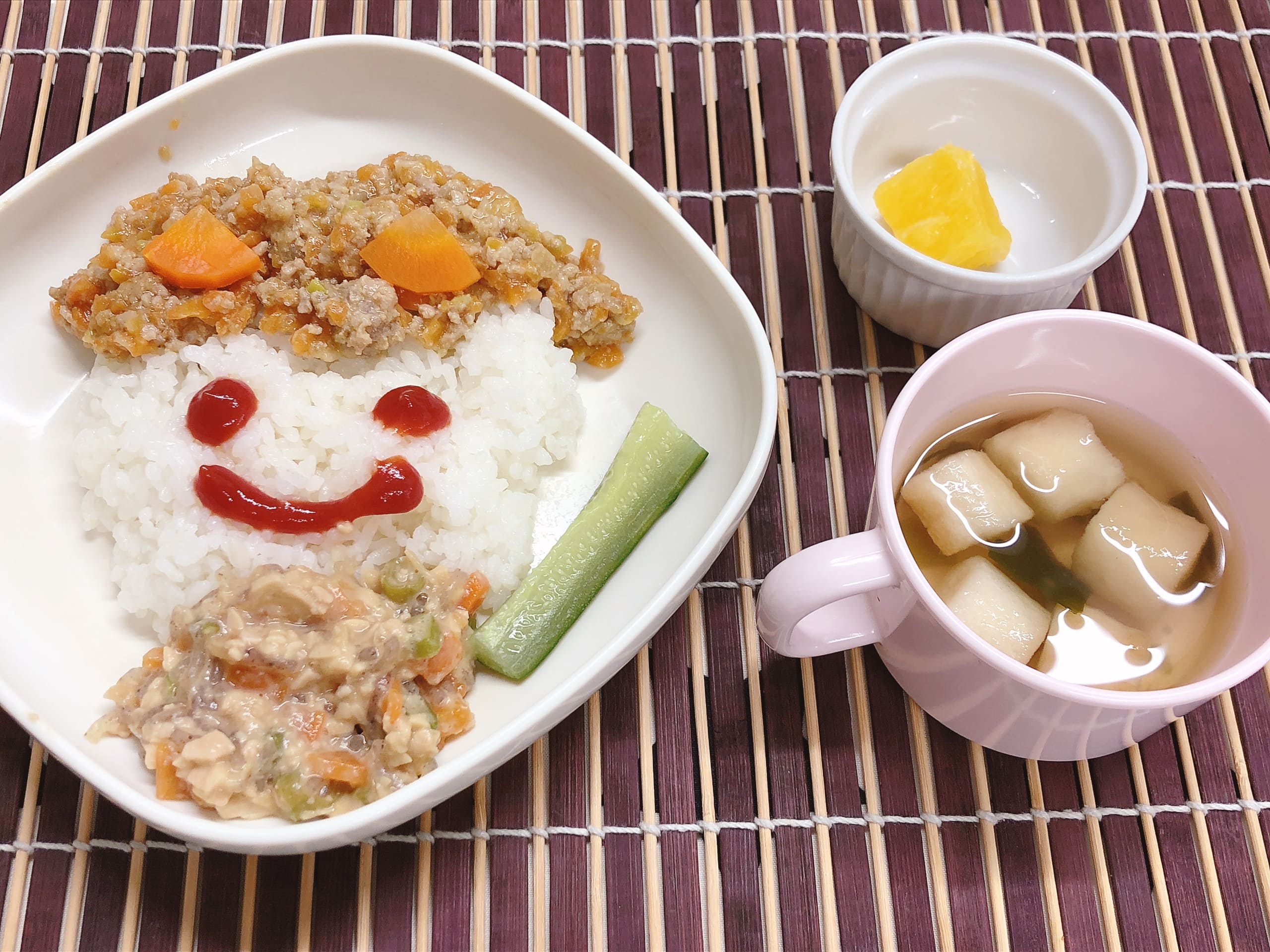 肉みそごはんは子どもたちにとても人気で、特に今日はおかわりをたくさんしていました。 「美味しい!」と「かわいい!」と喜びながら、楽しく食べる姿が見られました。