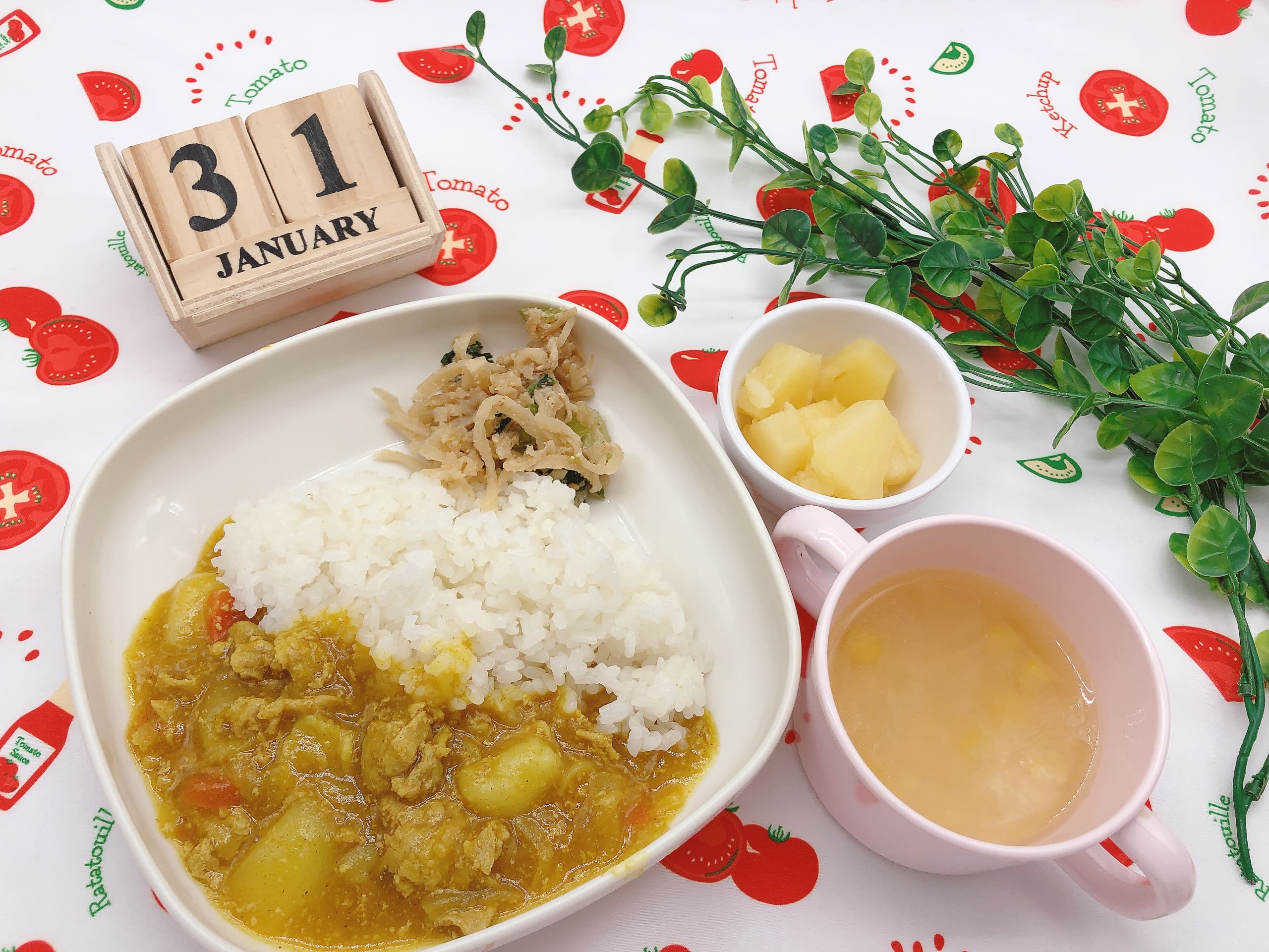 - 本日のカレーは具だくさんで、様々な野菜と肉をバランスよく使用しました。子どもたちが野菜を楽しく食べられるように工夫しています。
