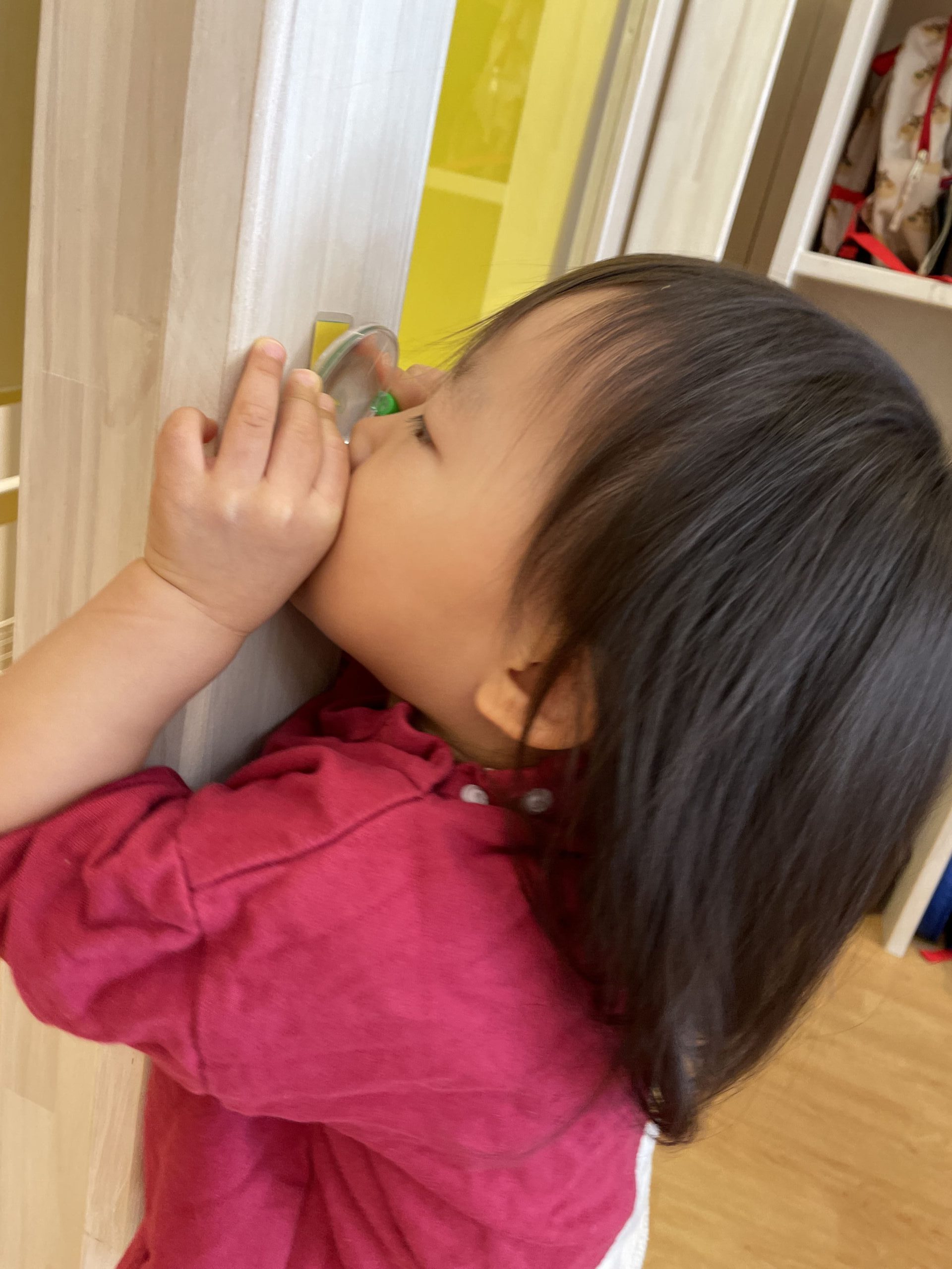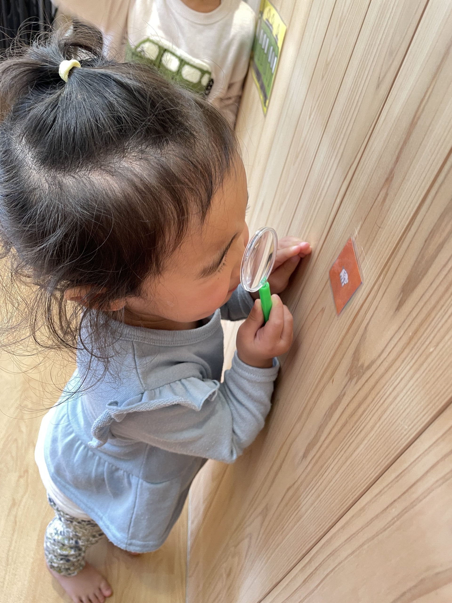保育室に貼ってある小さいイラストを覗いてみると、「うわー!大きくなってる!」「なんか近く感じる!」と驚きの声があがりました。ルーペをくるくる動かしながら、「こっちは小さく見えるよ」「遠くのものも大きくなる!」と発見がいっぱい!初めての体験に、子どもたちは夢中になっていました。