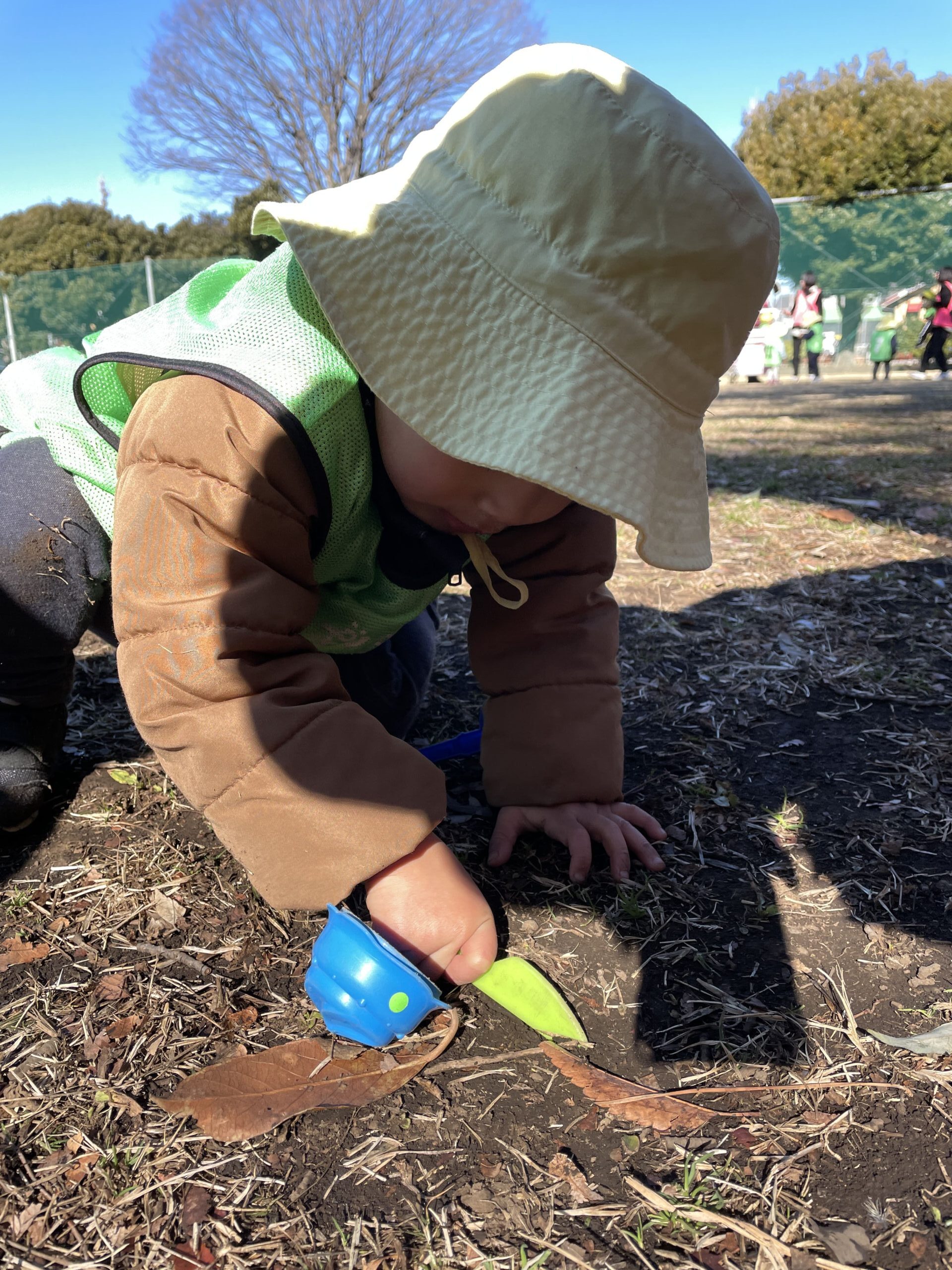 その後は、公園の広場へ。今日はお砂場セットを持っていきました。広場にはお砂場はありませんが、多摩平の子どもたち砂場がなくても、広場の地面におちていたドングリをバケツにいれたり、芝生をアイスの型に詰めてみたりと、発想力豊かに遊んでいました。「ここが砂場みたいになるよ!」と、まるで本物のお砂場のように遊びが広がっていきます。