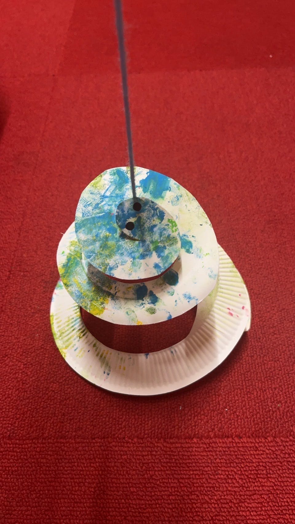おともだちが一生懸命に絵具で表現した紙皿を、先生がぐるぐるチョキチョキすると、、、!!!