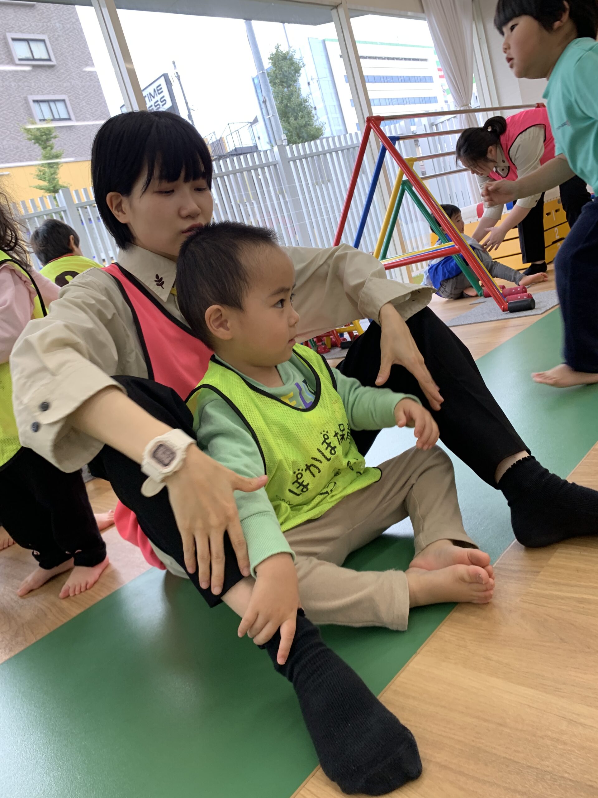 「〇〇くん、蛇さんみたいにニョロニョロしてるね!」「先生の後ろについてきてくれてありがとう!」と声をかけながら身体を動かすことの楽しさをみんなで分かち合いました!