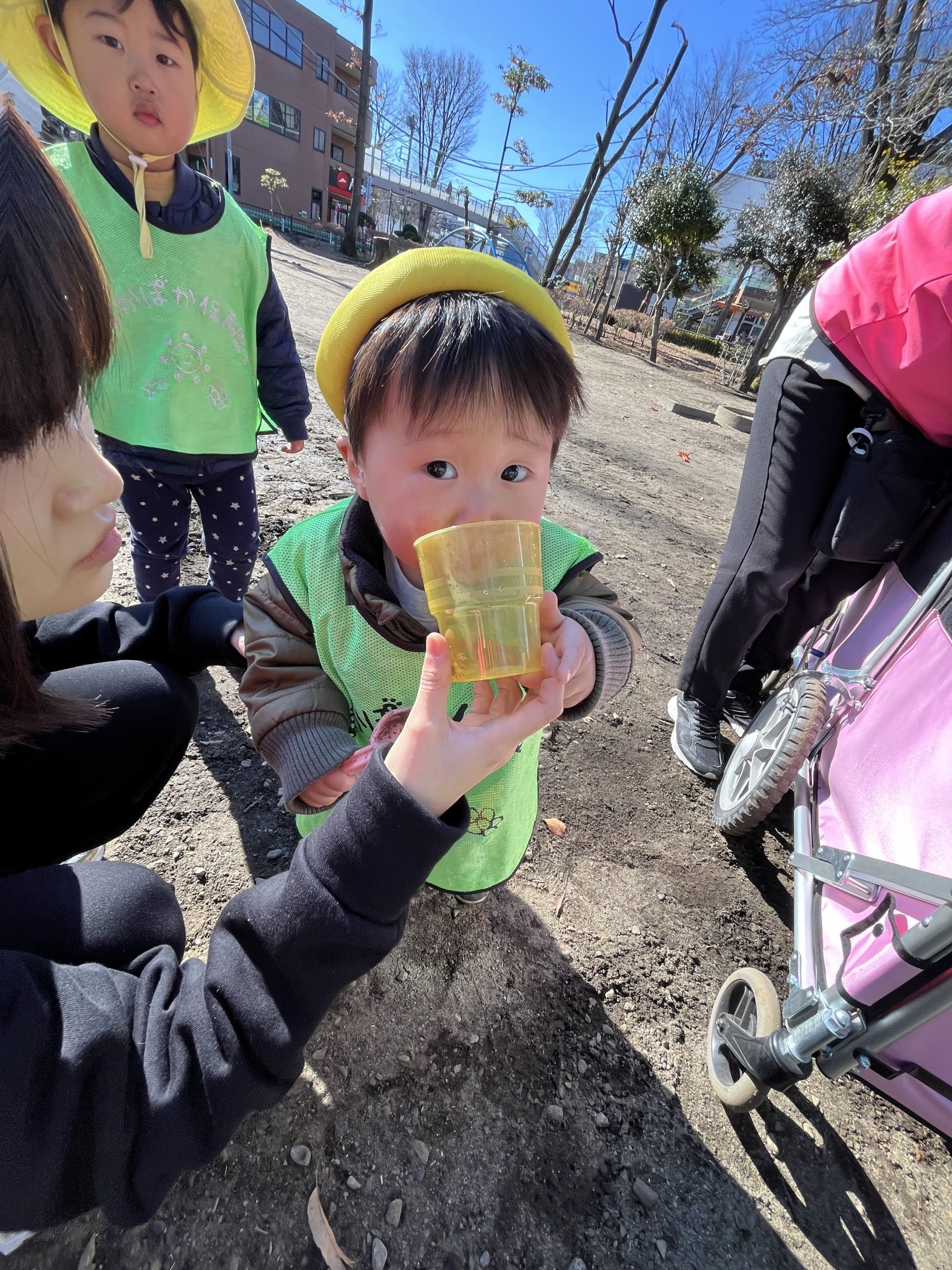 水分補給も全力!「のどがカラカラ!」と一気に飲み干す姿は、本当にたくさん遊んだ証拠です。お友だち同士で「楽しかったね!」と話しながら、リラックスタイムを過ごしました。