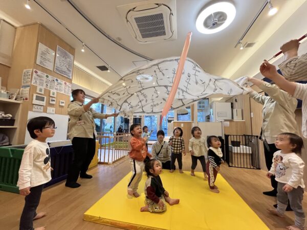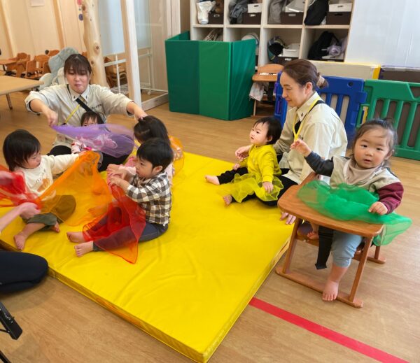 大判スカーフを使った活動ではふわっとした動きを視覚から味わったり、実際に自分達でひらひらさせてお友だちと協力してケーキ作りに取り組みました♪