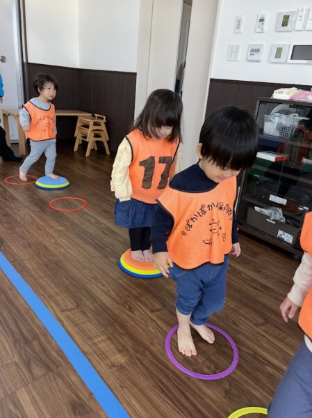 リトミックではフラフープや音マットの道を熱中しながら歩いていました!
