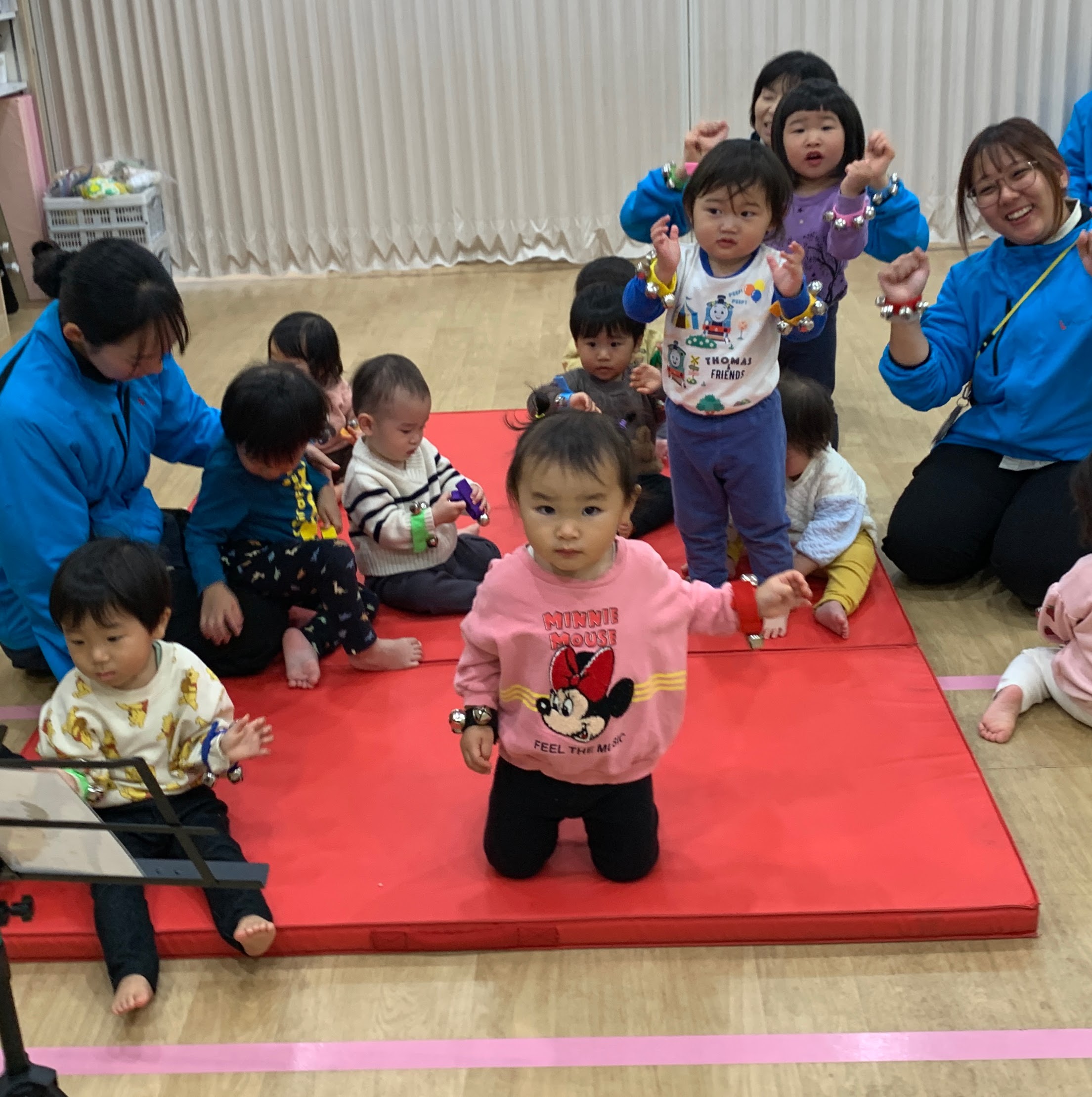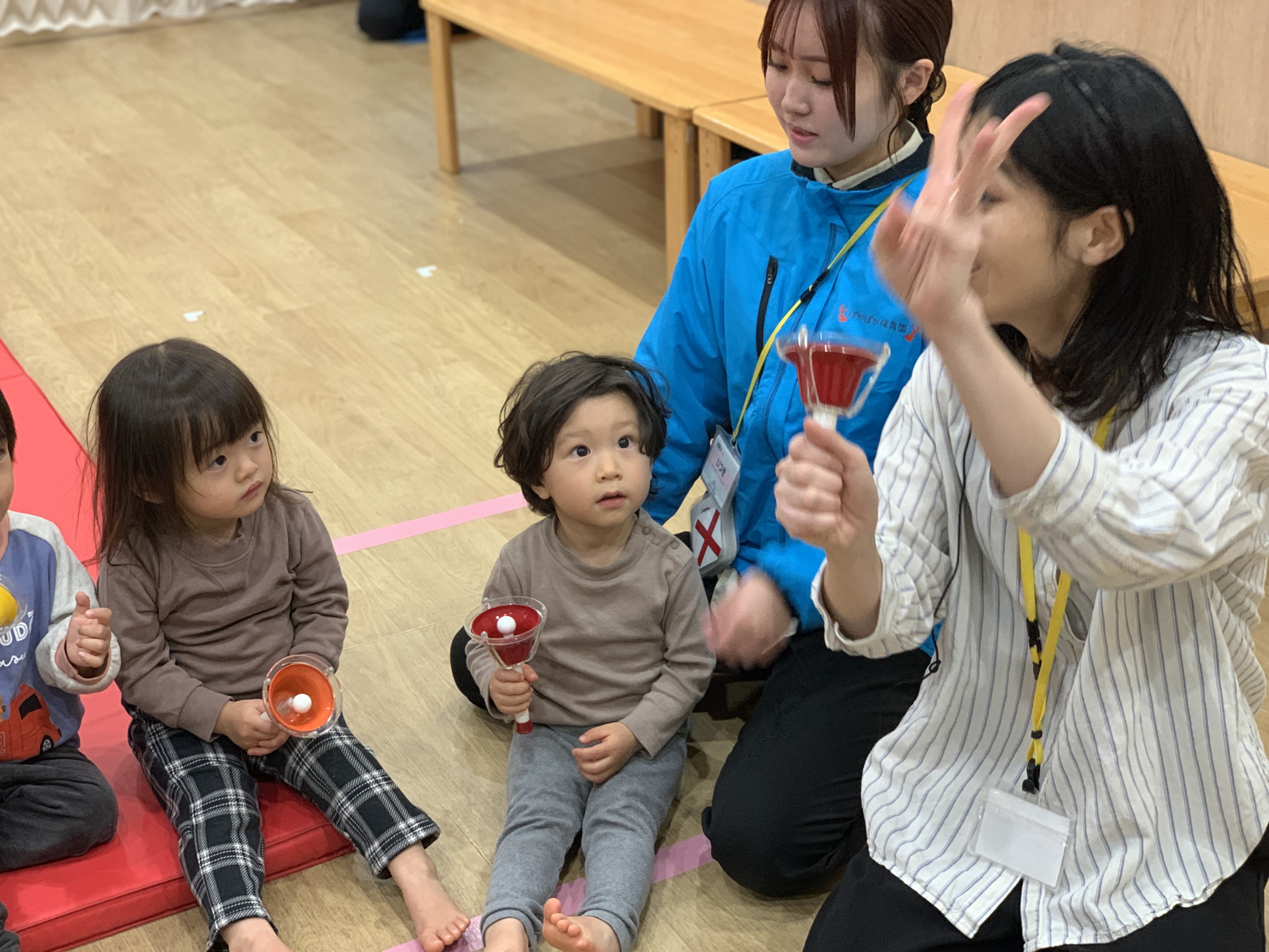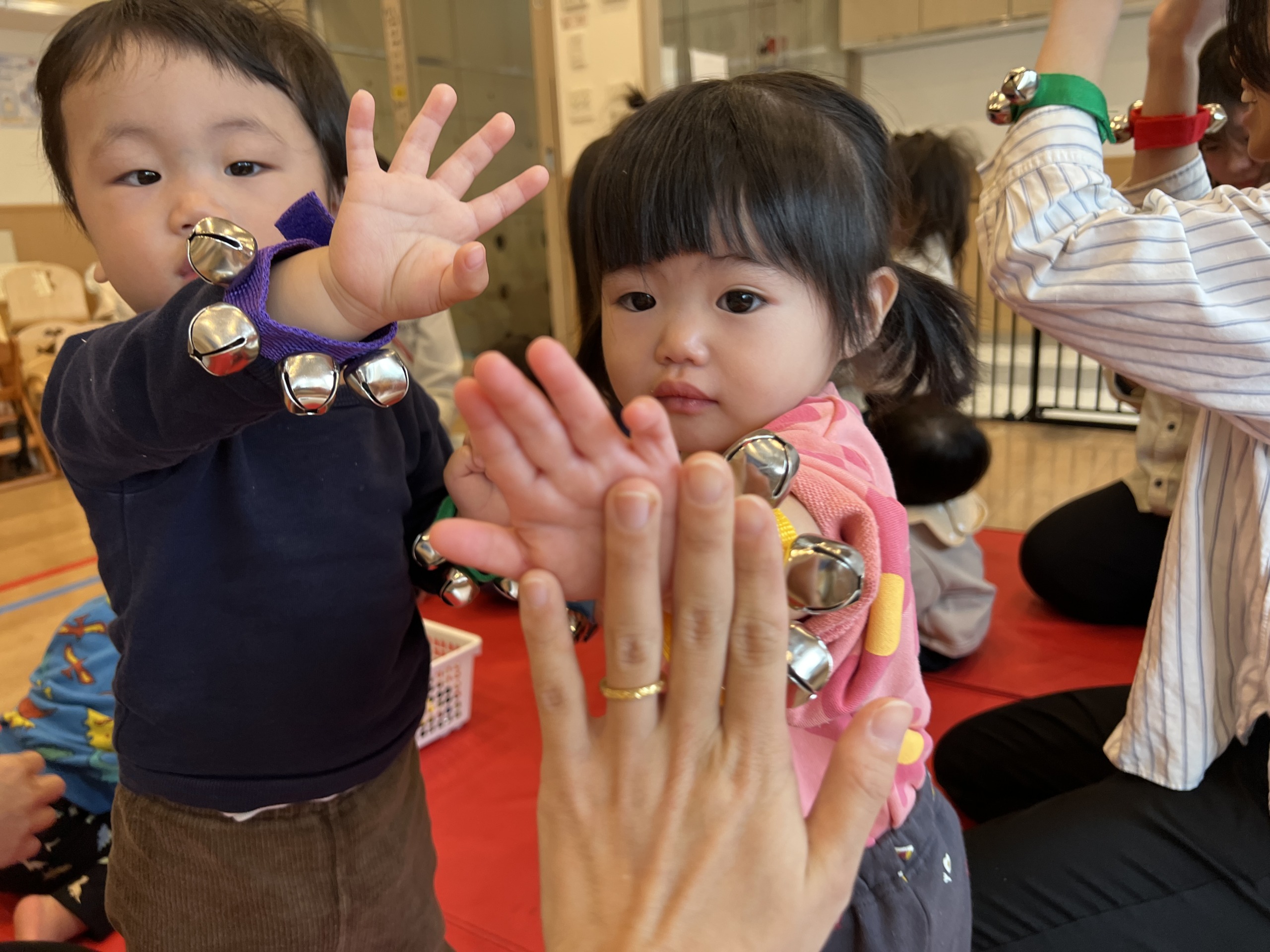 青空組さんでは、手首につけて楽しむリングベルを使用しながら、先生とタッチして奏でたり、