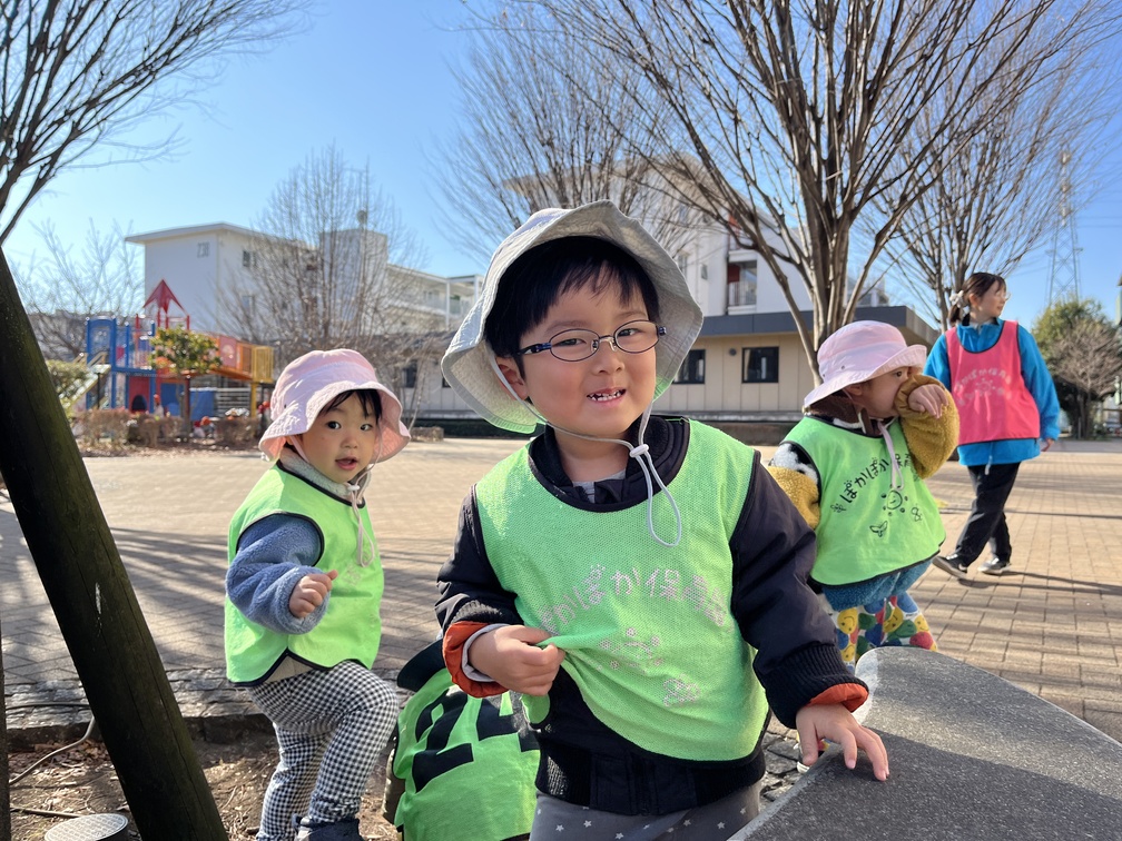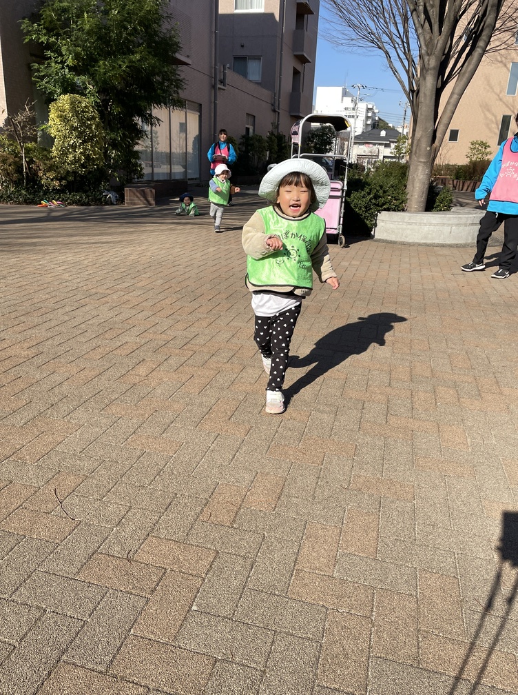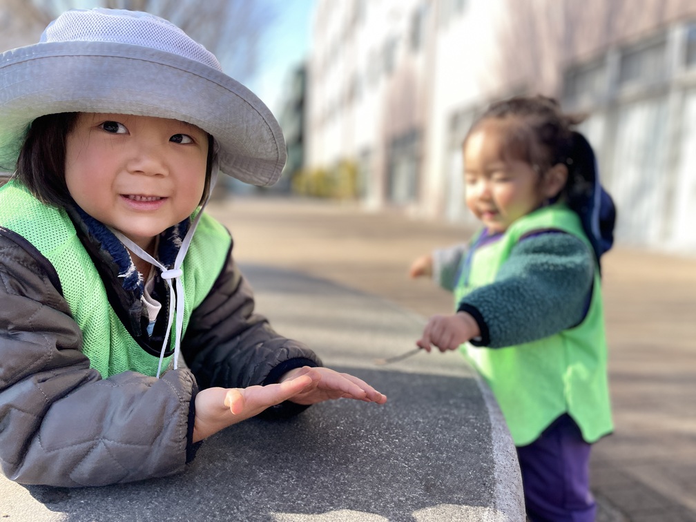 音楽遊びの後は合同でテラスへ。「こわいこわい!」と言いながらも笑顔で逃げる追いかけっこ、細い枝を見つけて「チックンしよう」と注射に見立てる遊びへ広がる時間になりました。また、葉っぱを並べるお店屋さんごっこ、ポールをぐるぐる、看板の裏に隠れて「ばあ!」の後に笑い転げる姿が元気いっぱいです。0歳児さんはご機嫌で高速はいはい、先生を目で追いながら環境へ向かって探索しました。気持ちよくなって眠る場面もあり、刺激と休息の切り替えが自然に整っていく時間です。