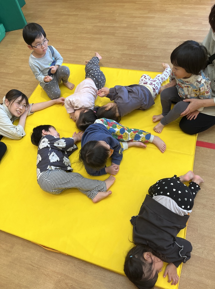 みんなで輪になって歌う場面では、マットにごろんと横になり、余韻を味わうような一休みの様子も見られます。