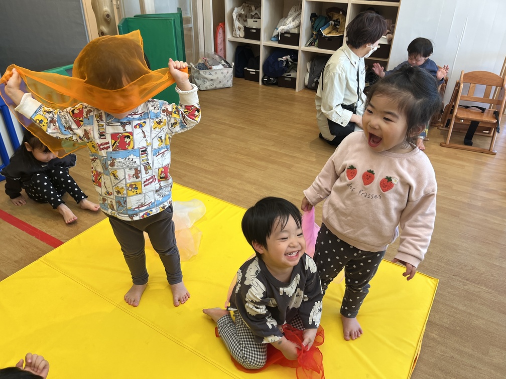 2歳児さんは、黄色のマットの周りをぐるりと回りながら、飛行機・クマ・ウサギ・忍者になりきる遊びに取り組む姿が中心に見られました。先生が「飛行機になれるかな?」と声をかけると、子ども「できる!」と両手を伸ばしてしっかりまねる姿も。楽器ではトライアングルに意欲的に向かい、先生「順番こね」と伝えると、子ども「うん!」と待つ姿が育っています。