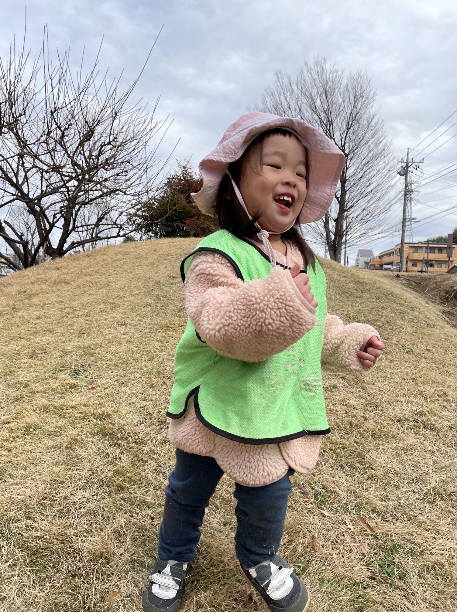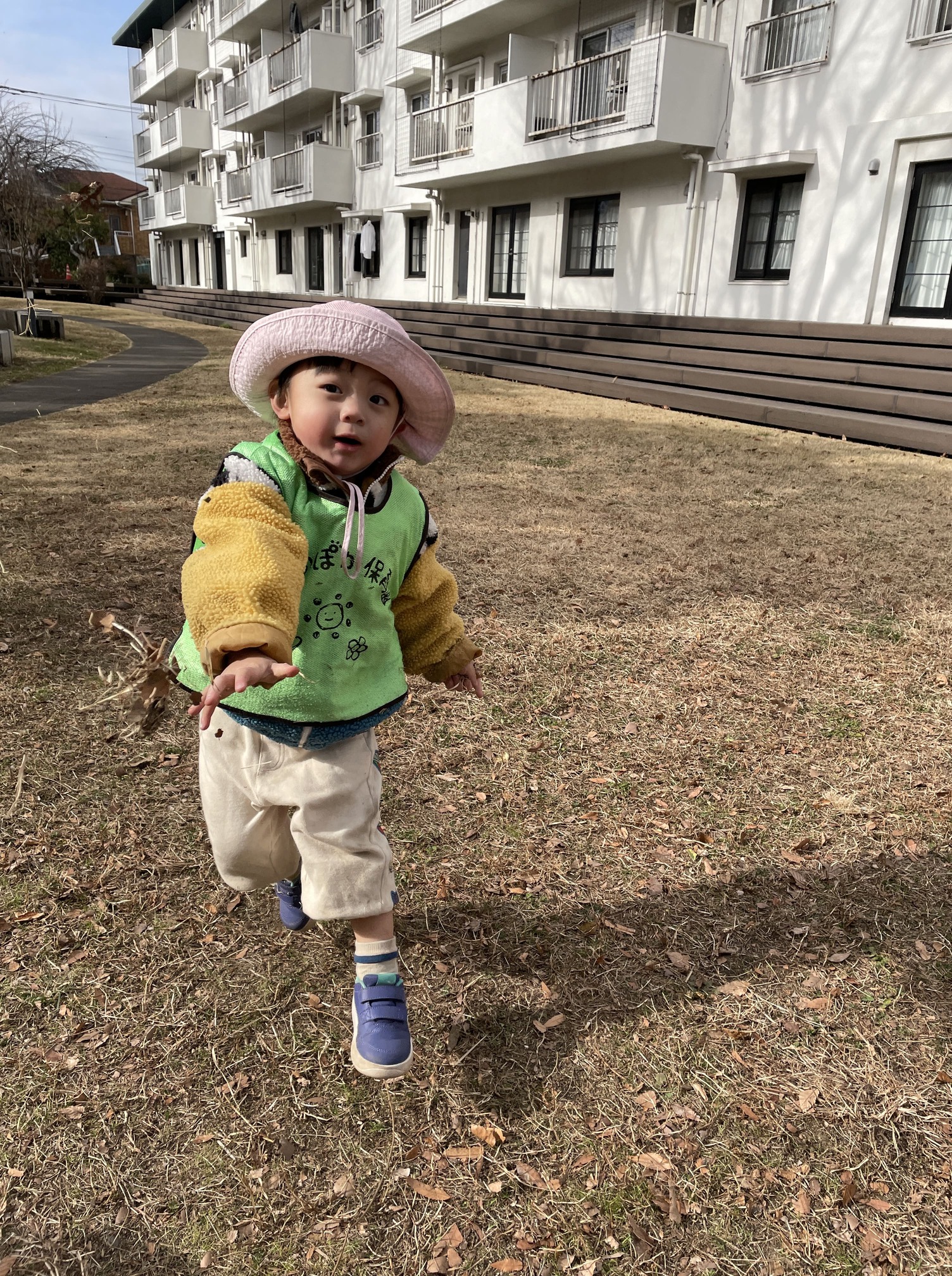 角度が急で滑りやすい枯れ芝の感触を確かめつつ、手のつき方を変えて前進していく元気なお友だちたち。
