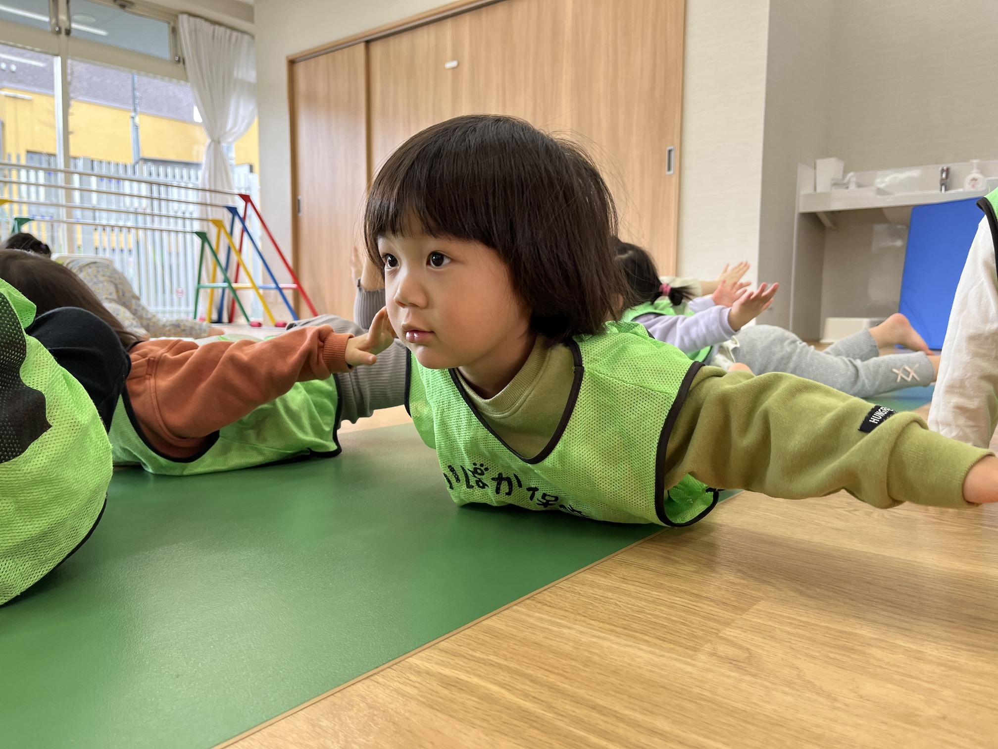 1歳児さんは、登る・降りるの連続運動で足の踏ん張りと重心移動が整い、景色や素材への視線移動が増えています。