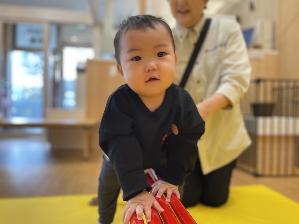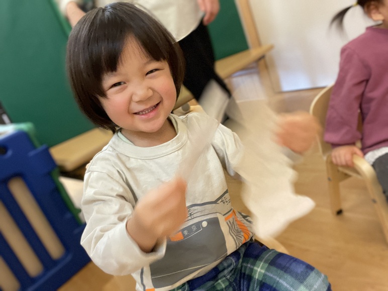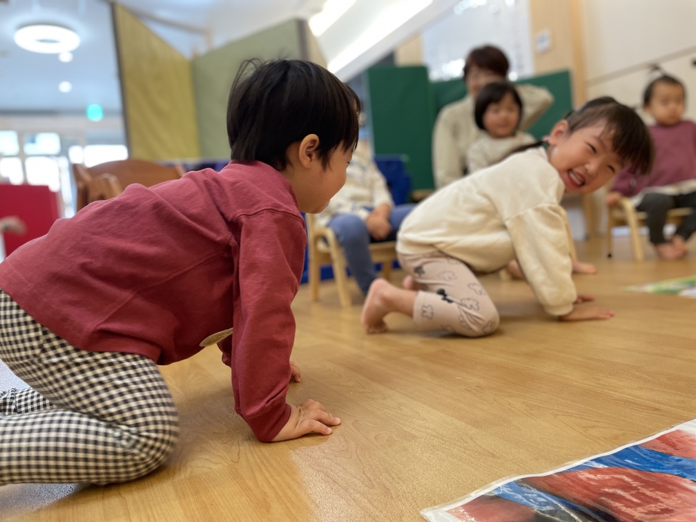 - 0歳児さんは音や抑揚、目と目の合わせ方を楽しむところから。先生が「コツン」と指先タッチで合図すると、にっこり笑って手を伸ばし、ハイタッチ。言葉の理解だけでなく、人と通じ合う楽しさを感じる時間になりました。