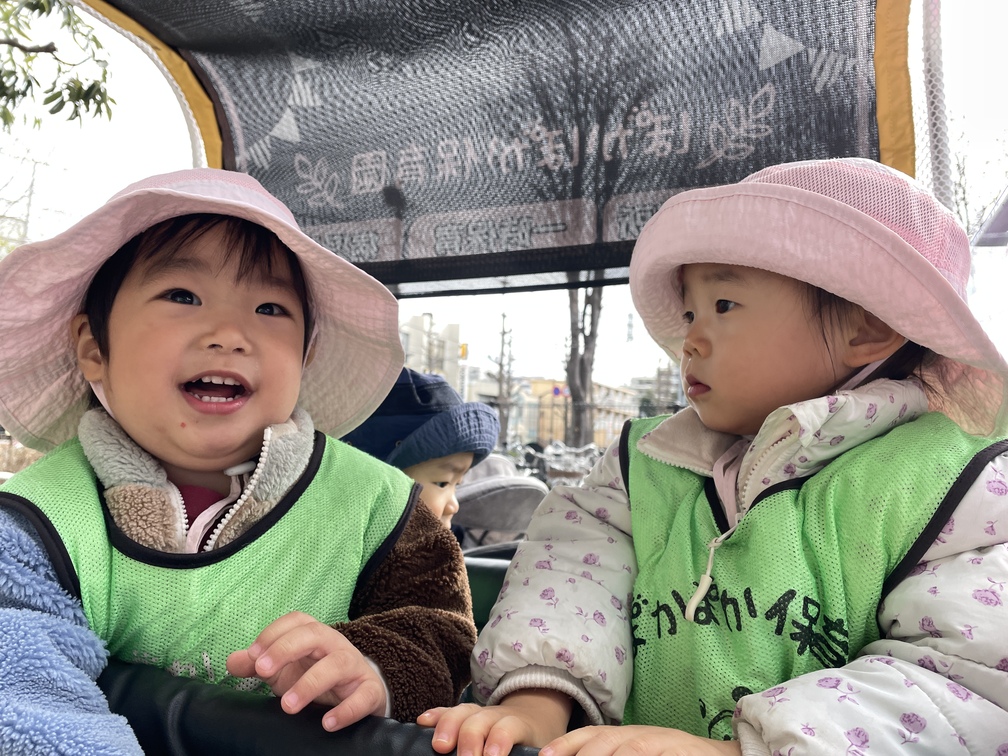 曇り空で寒さが増していたので短時間でしたが、園周辺を散歩して外気と季節を感じました。道端に落ちている藤の種を見て1歳児さんが「おまめ、かたくなってる!」と指差し。いつも前を通るお店の犬のポスターに、2歳児さんが手をひらひら。0歳児さんはベビーカーやバギーの上で風の香りを吸い込みながら、通りすがりの人の素敵な帽子に視線を釘付け。保育室だけでは出会えない町の風景が、言葉やジェスチャーのきっかけになります。