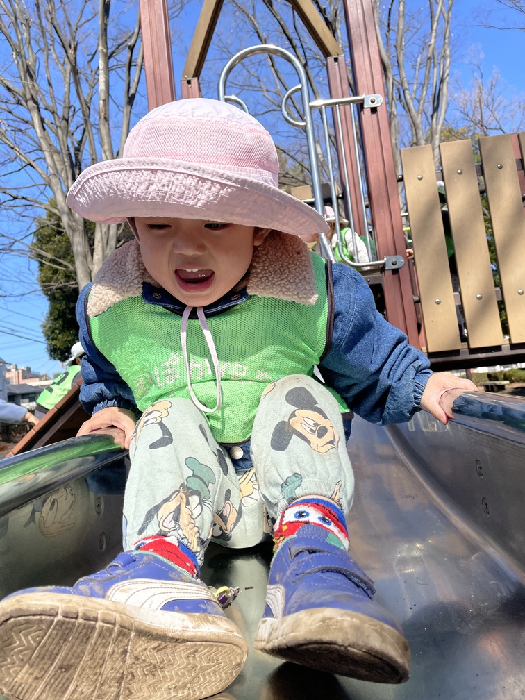 公園では、まずは滑り台へ。上から「ばいばい~!」と手を振ってくれたり、駆けだしたあとに声をかけると全力ダッシュで戻ってきて、ぎゅっとハグをしてくれたり、やりとりの楽しさがどんどん広がっています。