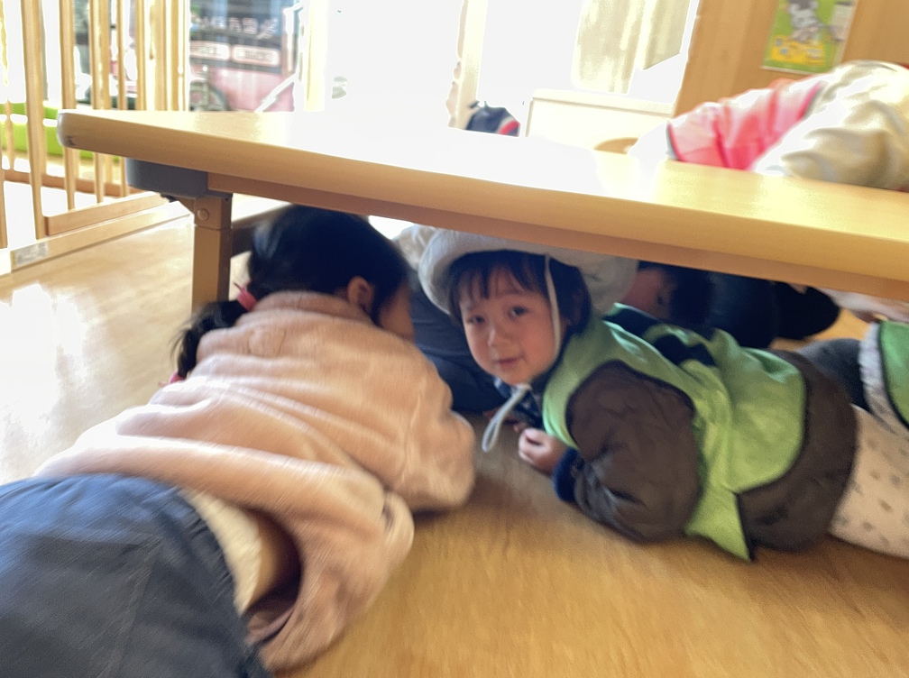 避難訓練では、驚きながらも泣かずに机の下へ。前回より落ち着いて行動でき、繰り返しの大切さを感じました。
