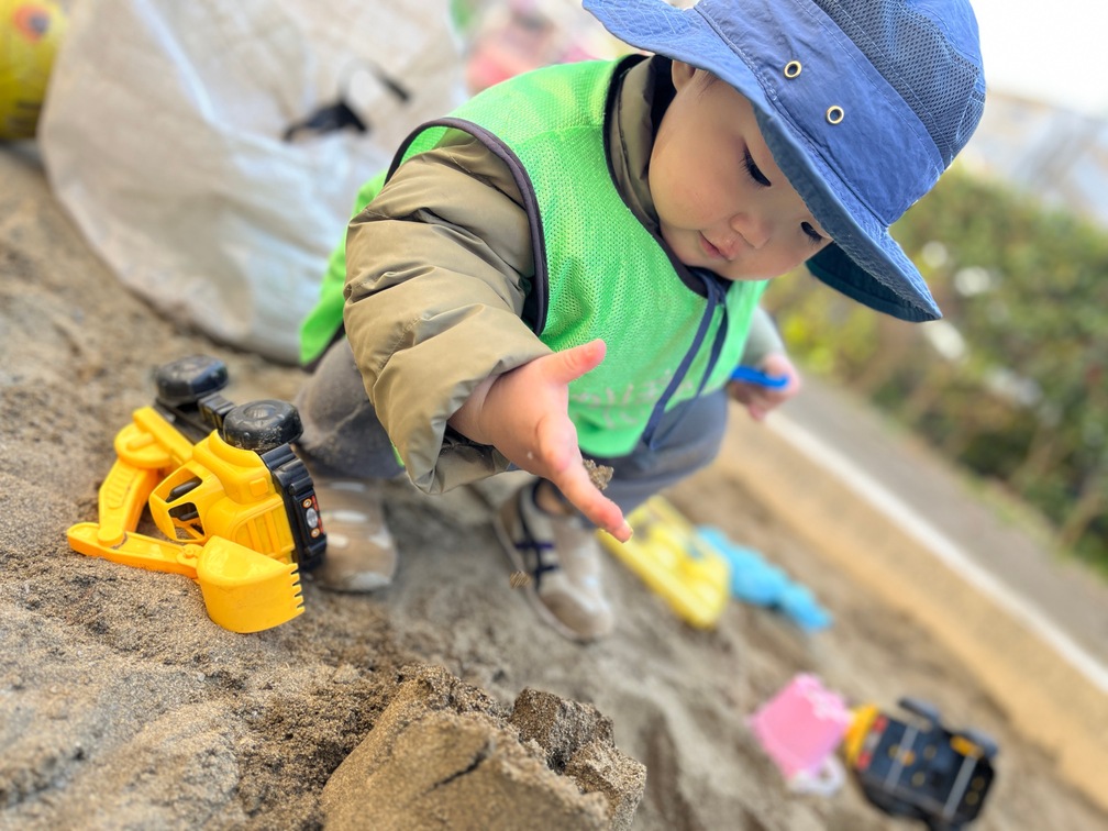 砂場セットの袋から「どれにしようかな」と道具を探す様子や、ハイハイでお友だちのところへ見に行く姿も可愛らしく、集中と探索が交互に続いていました。砂を口に入れそうになった時には、先生の声掛けでぴたっと止まり、二人の先生の顔を見比べて考える様子が印象的でした。