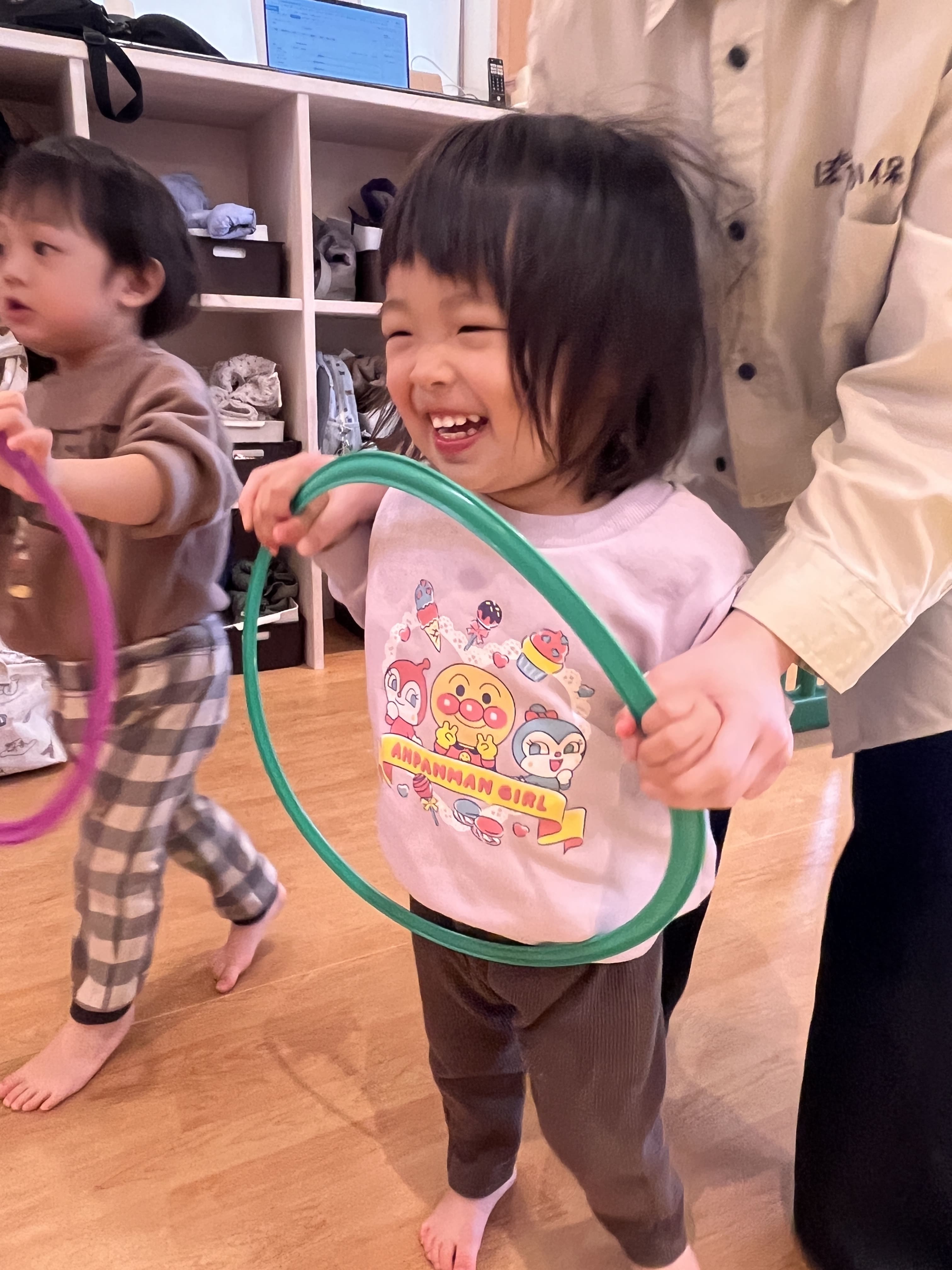 音楽遊びが始まると、呼ばれたお名前に「はぁ〜い!」と元気いっぱいのお返事が響き、場が一気に明るくなりました。フラフープをバスのハンドルに見立てて、マットのまわりをぐるりと運転ごっこ。「出発進行~!」と楽しそうに歩き、ハープのテンポが速くなると、それに合わせてダッシュする姿も見られました。音に合わせて体を動かす心地よさを、存分に味わっていたようです。