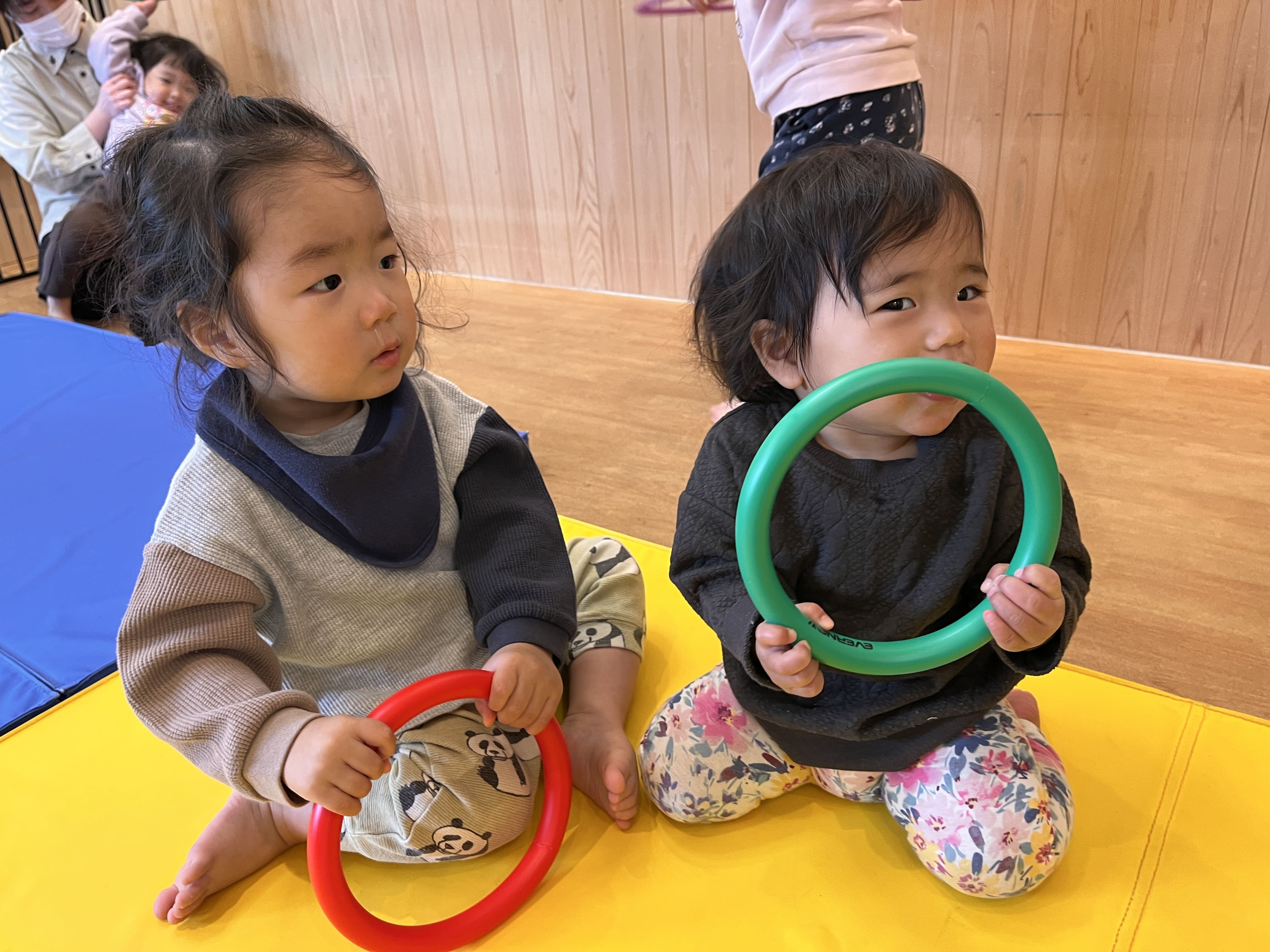 今日は2歳児さんが親子遠足に行っているので、0,1歳児さん合同で音楽遊びと戸外遊びを楽しみました。