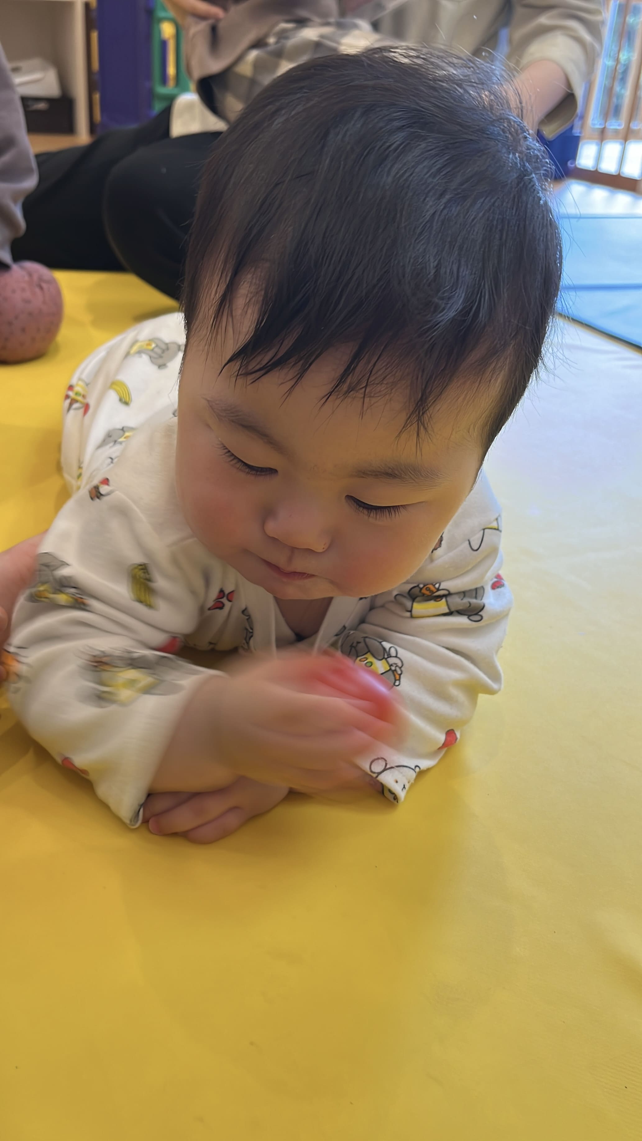 音楽遊びが始めるので「マットの上に座るよ」と伝えると、いつもの黄色いマットにしっかり座って、音楽の先生のお話をじっと聞く姿に成長を感じました。エッグシェイカーを使ったリズム遊びではシェイカーをにぎって、シャカシャカと心地よい音を楽しみながら、体もリズムに合わせてゆったり動かしていました。