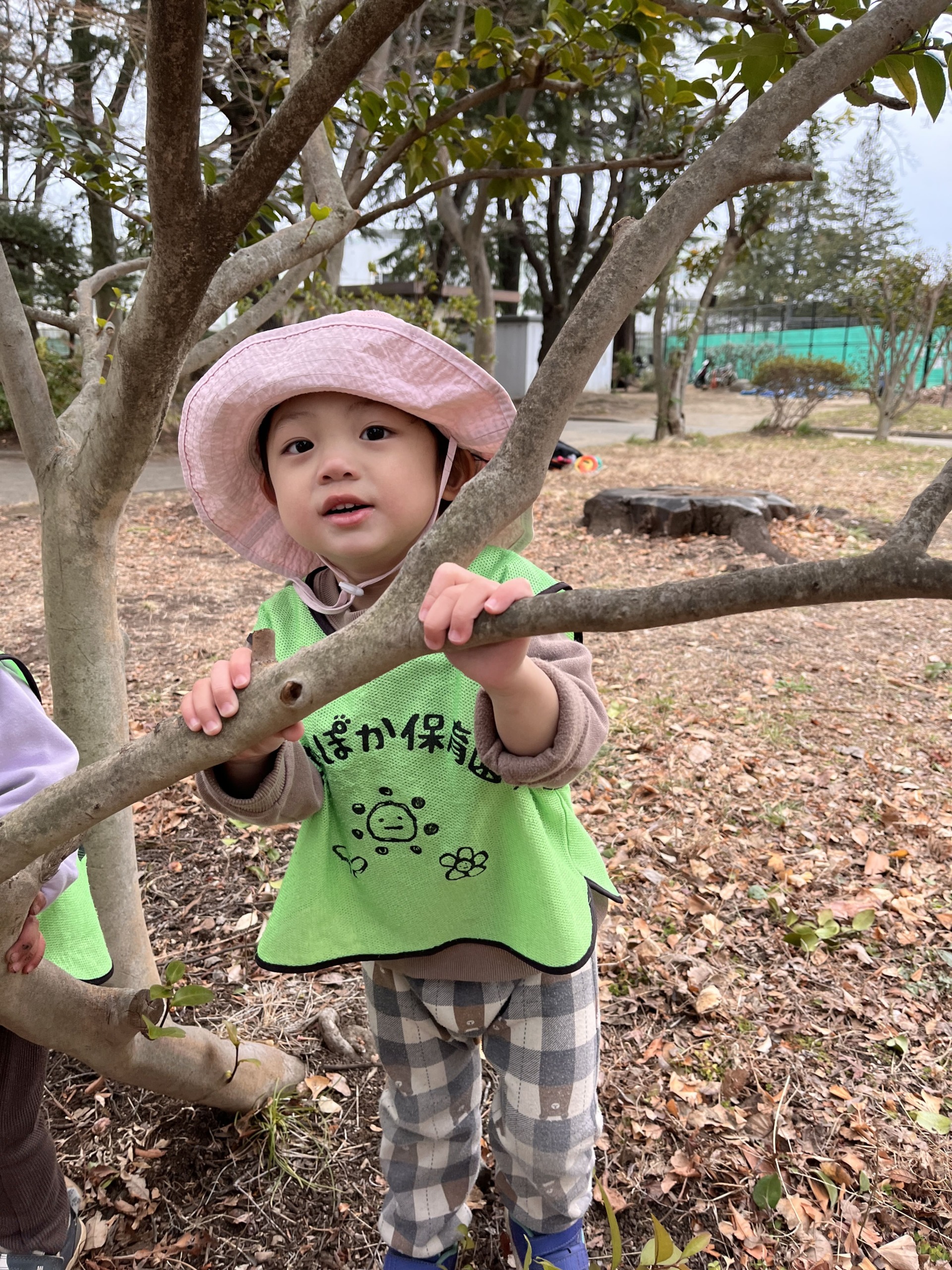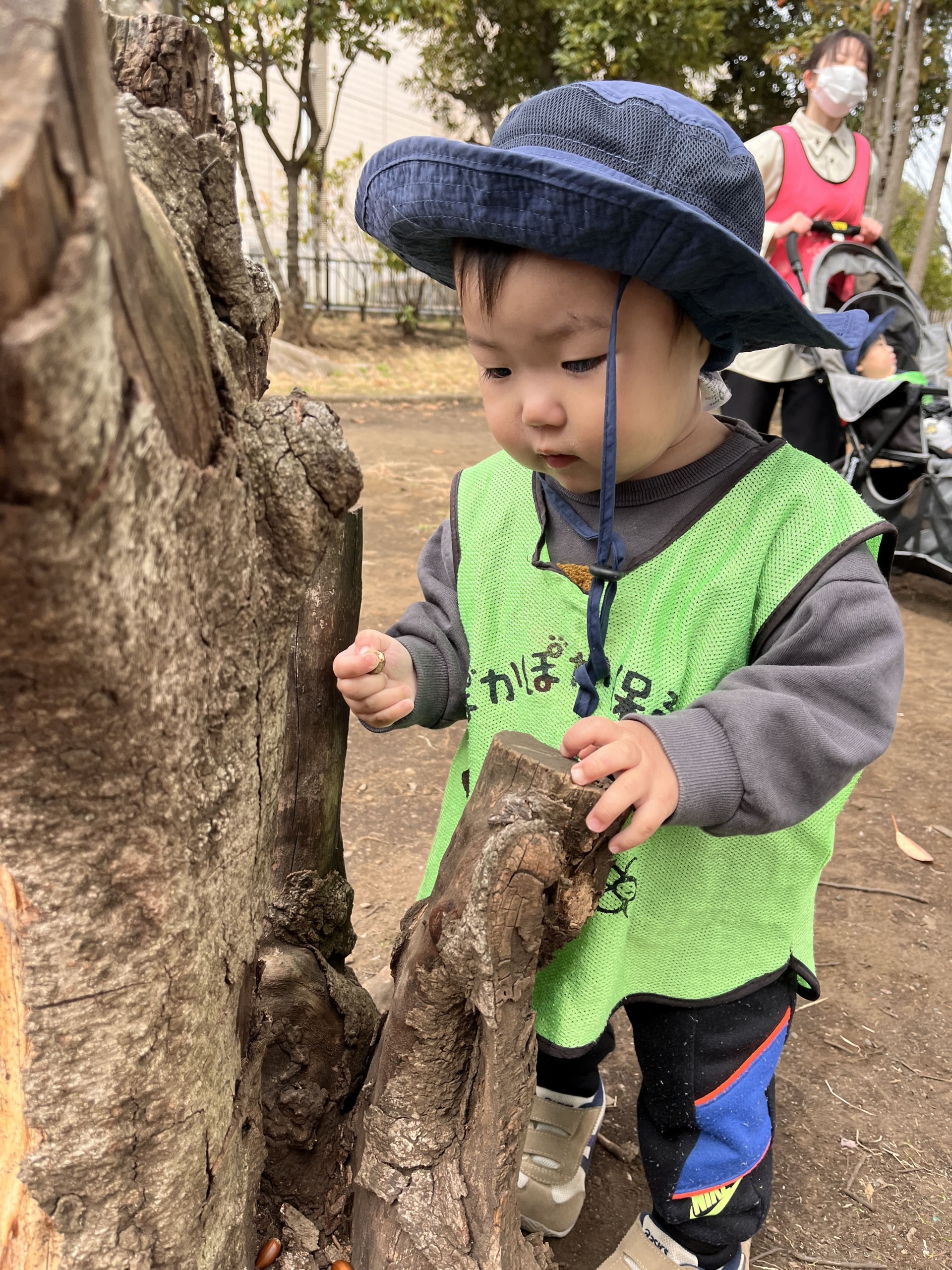 その後の戸外あそびでは、1歳児さんが切り株で遊んでいる様子に興味津々で近づき、一緒に手で触れてみたり、並んで座ってみたりと、関わりが自然と生まれていました。乳児保育ならではの、まねっこから広がる豊かな体験が積み重なっています。