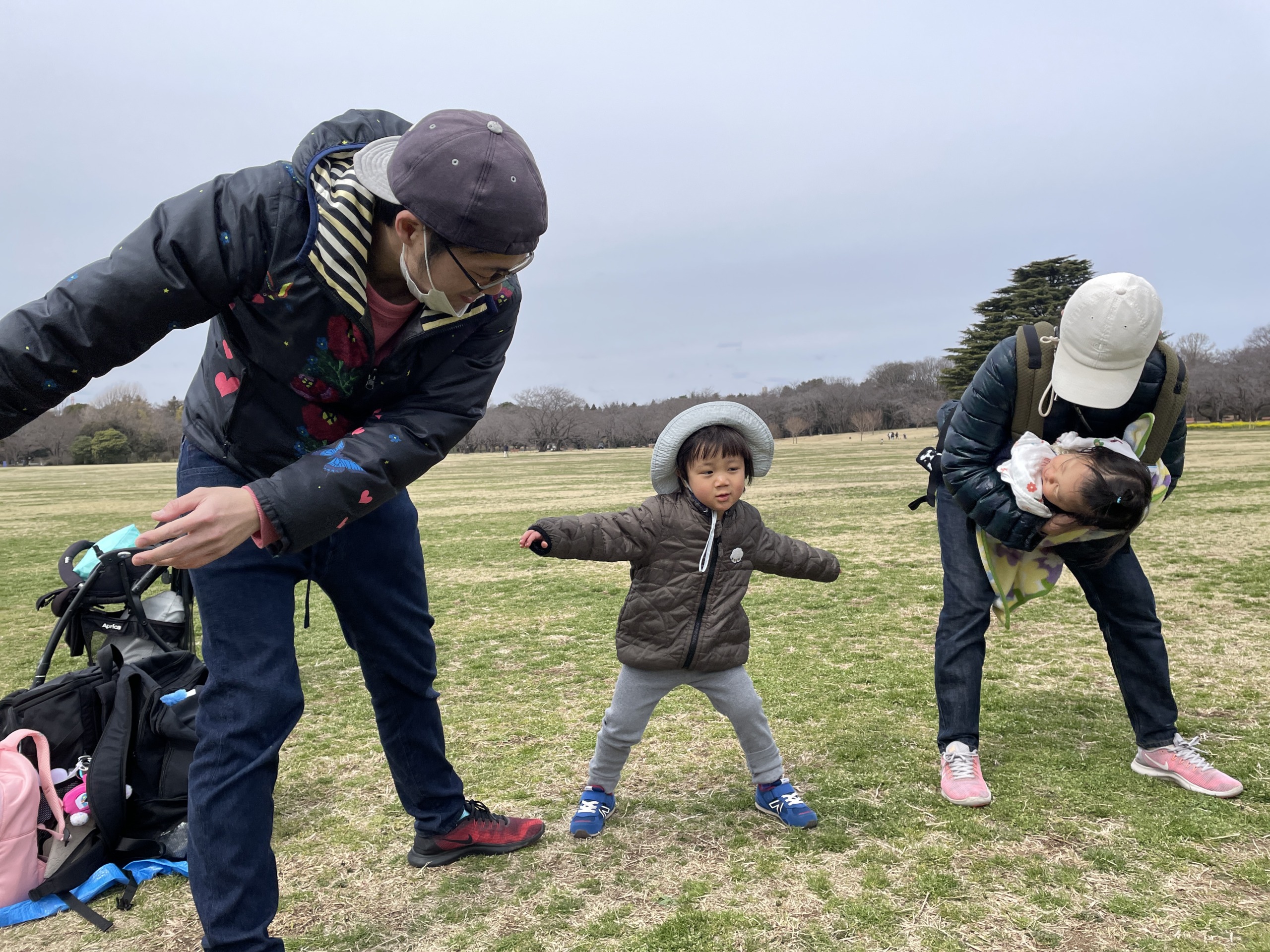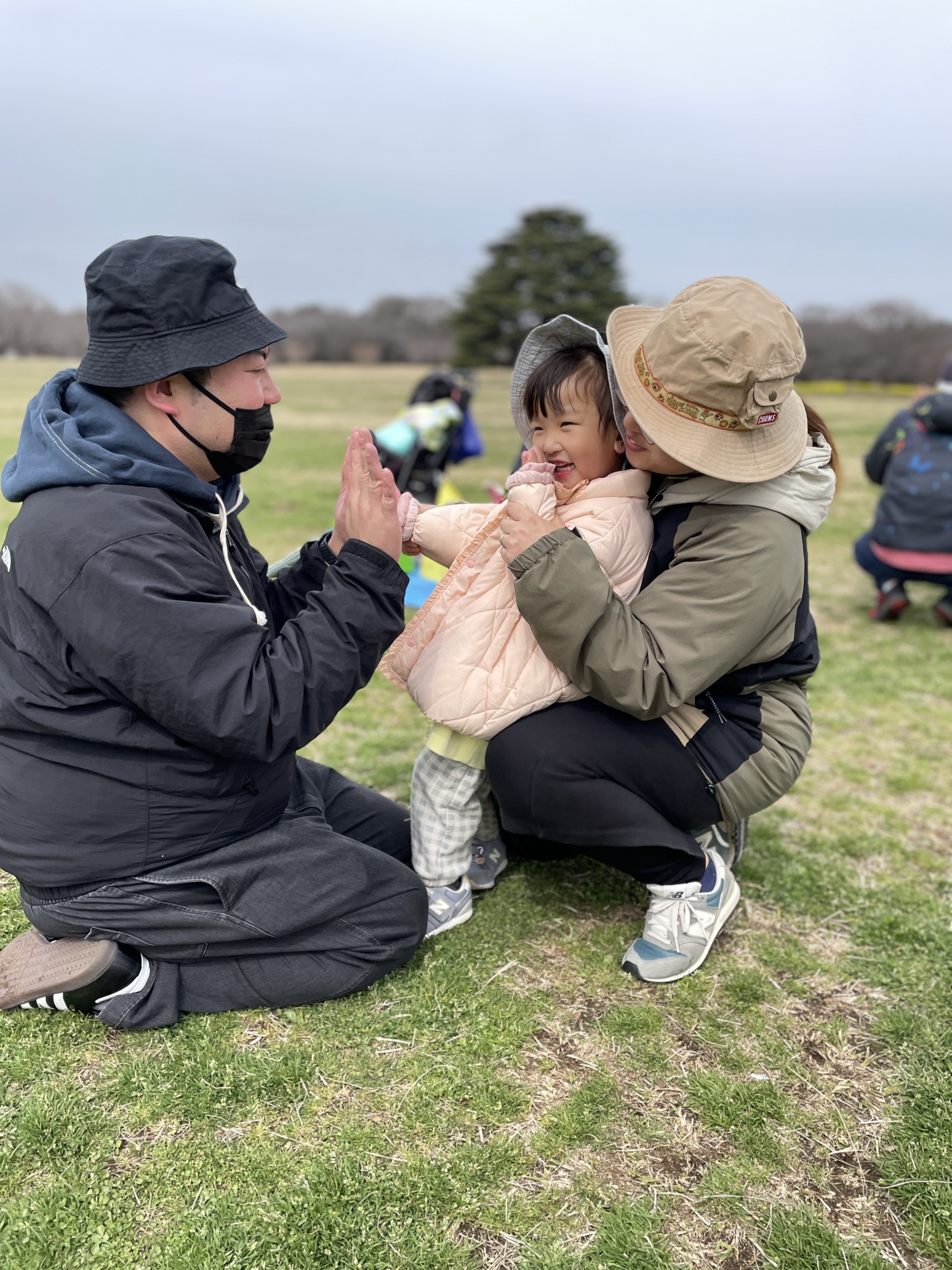 目的地の大きな広場では、ぽかぽか保育園で普段から取り入れている安田式体育遊びを行いました。園では幼児教育の一環として日々楽しんでいる活動ですが、この日は保護者のみなさまにも一緒に参加していただきました。子どもたちは「見ててね!」と得意そうな表情を見せたり、おうちの方と一緒に体を動かしたりしながら、とても嬉しそうでした♪普段の園での様子を少し感じていただけたのではないでしょうか♡
