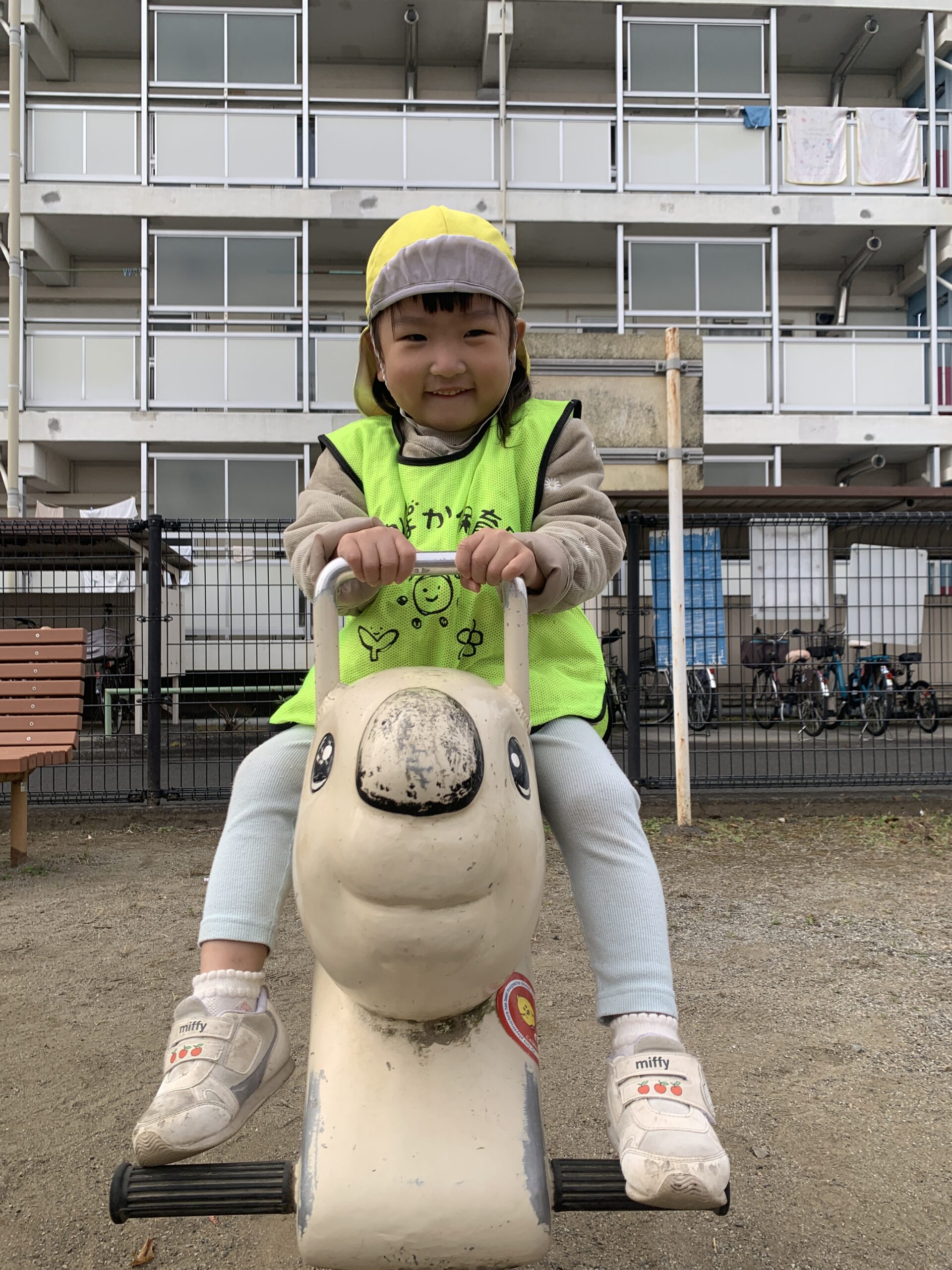 公園に着くと、1・2・4歳の子どもたちはスプリング遊具へ。「ゆっくり揺れてみようか?」と先生が声をかけると、「せんせい、みて!」と1歳がにこにこ。「私はこう!」と2歳が体を前に倒してリズムを作り、4歳は「止まるのもできるよ」とバランスを取りながらピタッ。先生が「上手、揺れの強さを自分で決められたね」と伝えると、「もう一回!」と笑顔が広がりました。無理なく楽しむため、遊具の順番と休憩のタイミングを丁寧に合わせ、個別対応保育で一人ひとりの様子を見守りました。