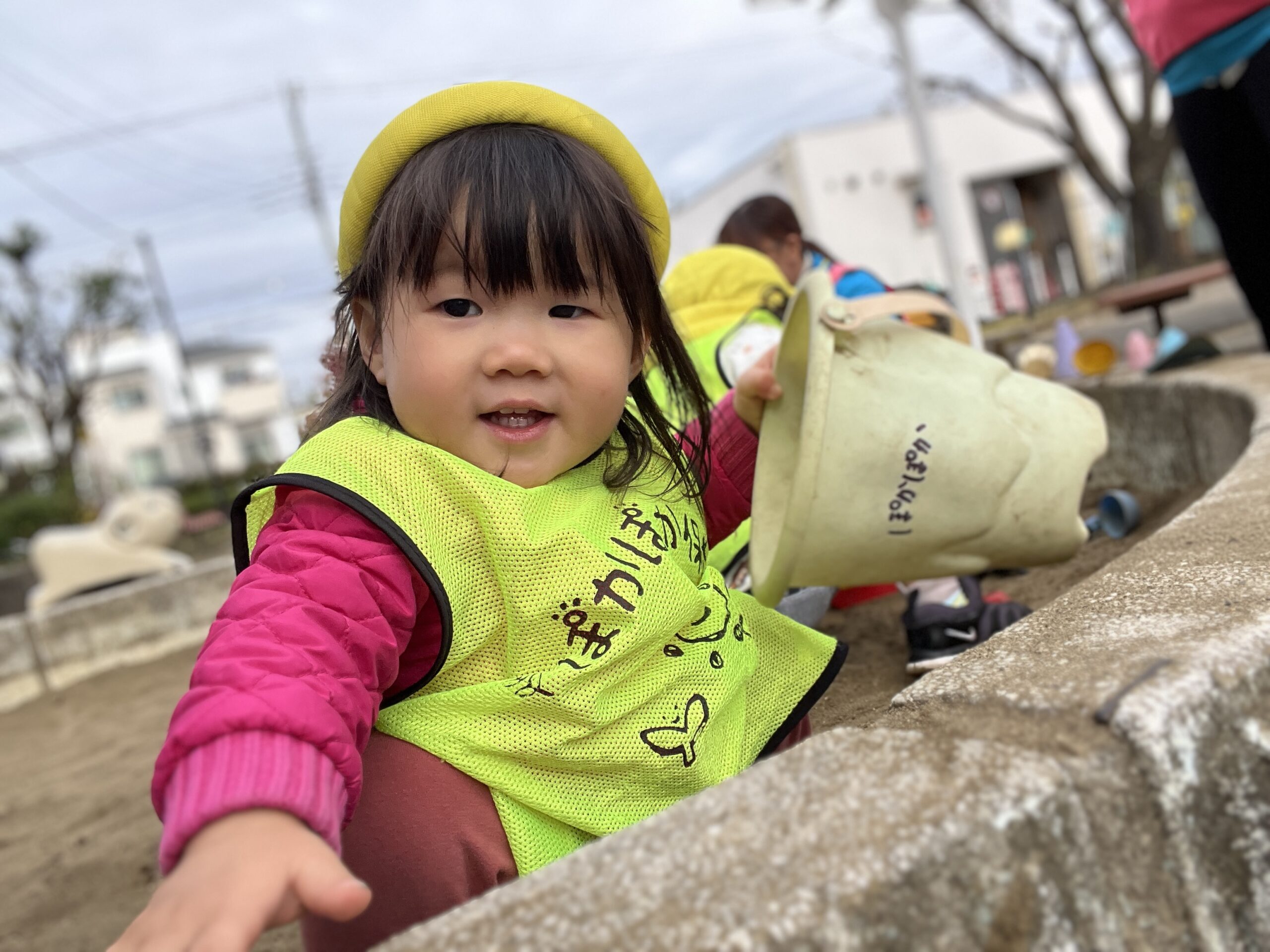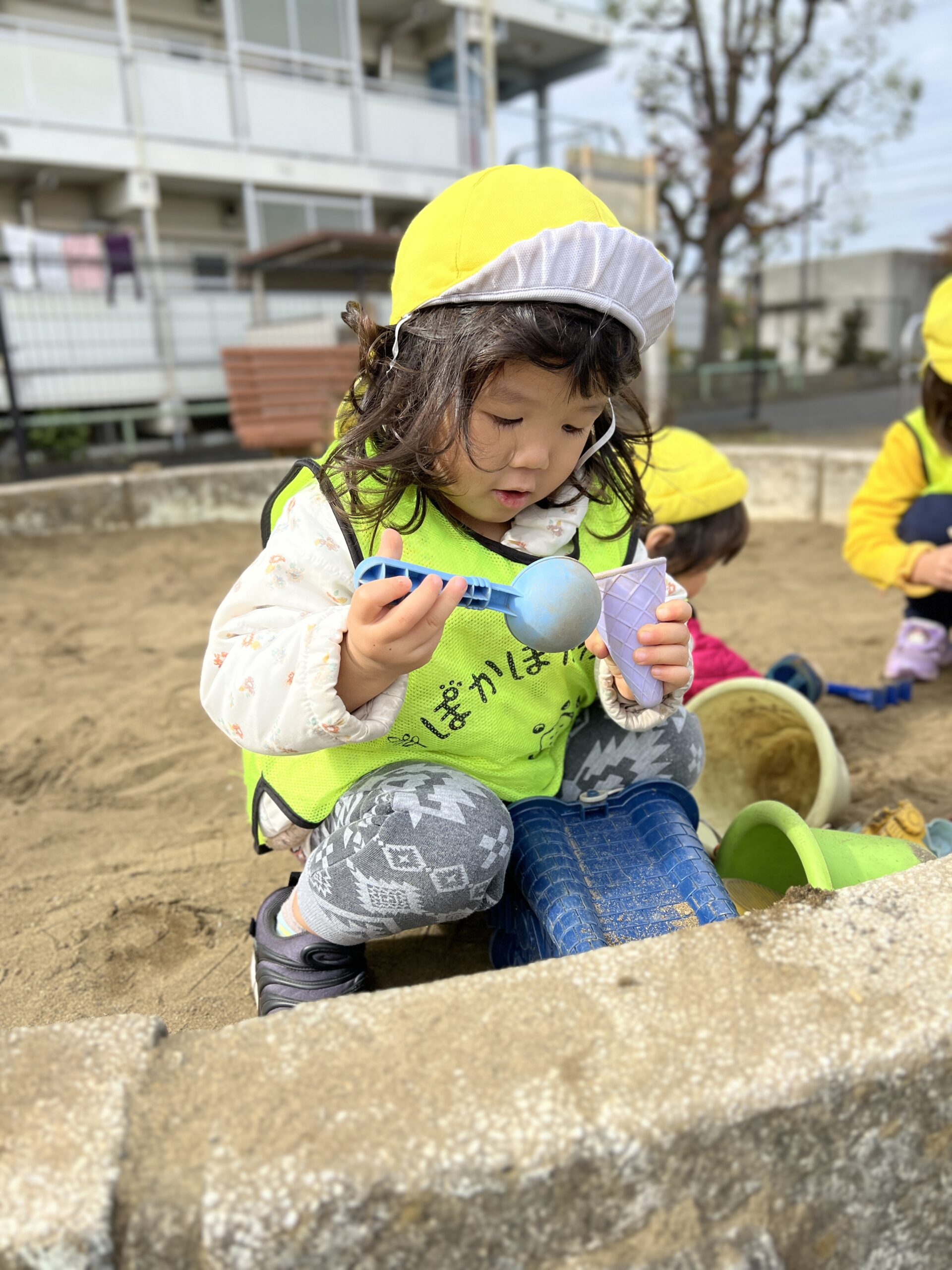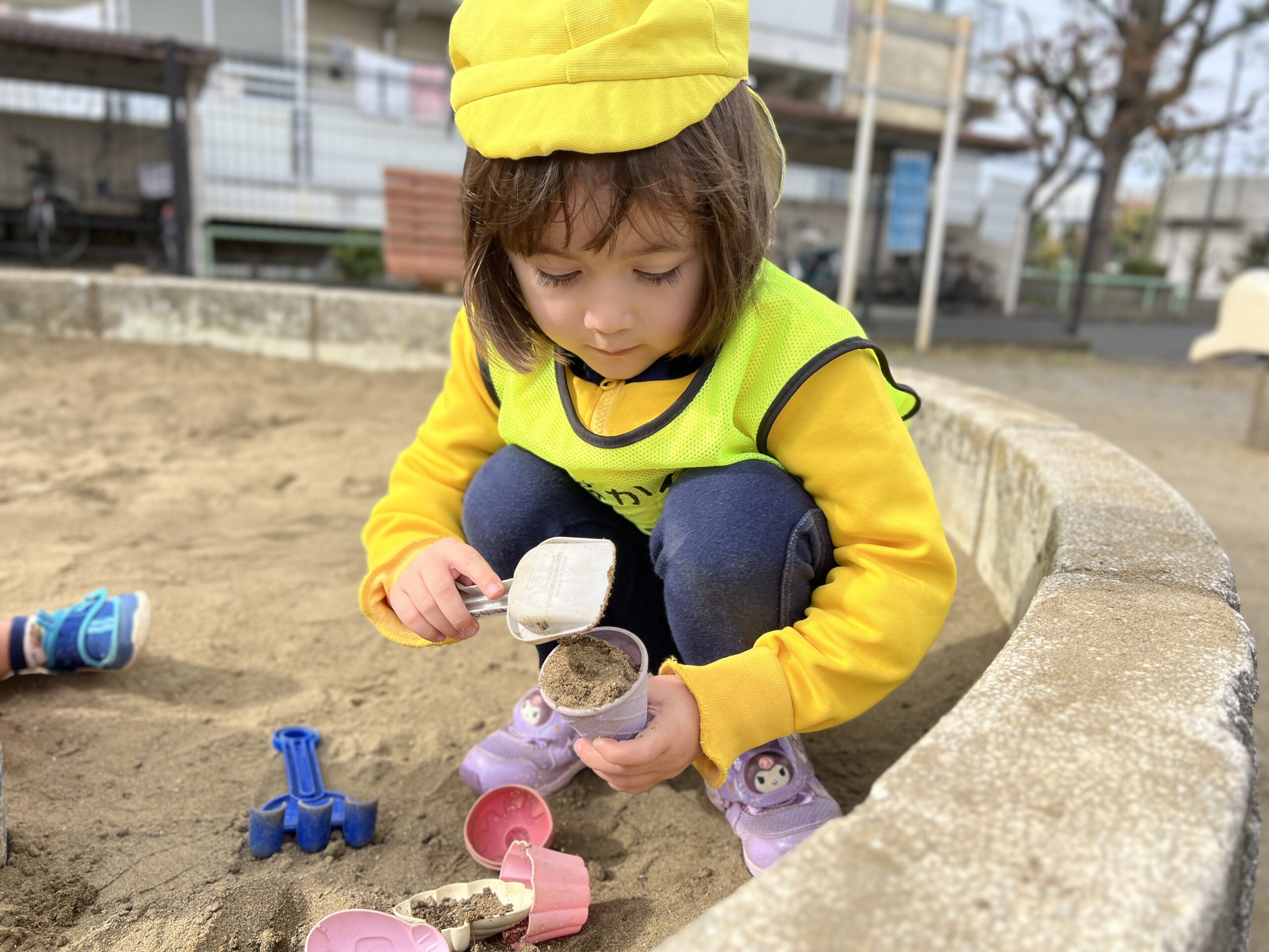 砂場では、1・2・4歳が一緒にじっくり遊びました。先生が「今日は何を作ろう?」と問いかけると、1歳が「アイス!」とカップを握り、作りだしました。ペース配分を意識し、止まって眺める時間も大切にしました。