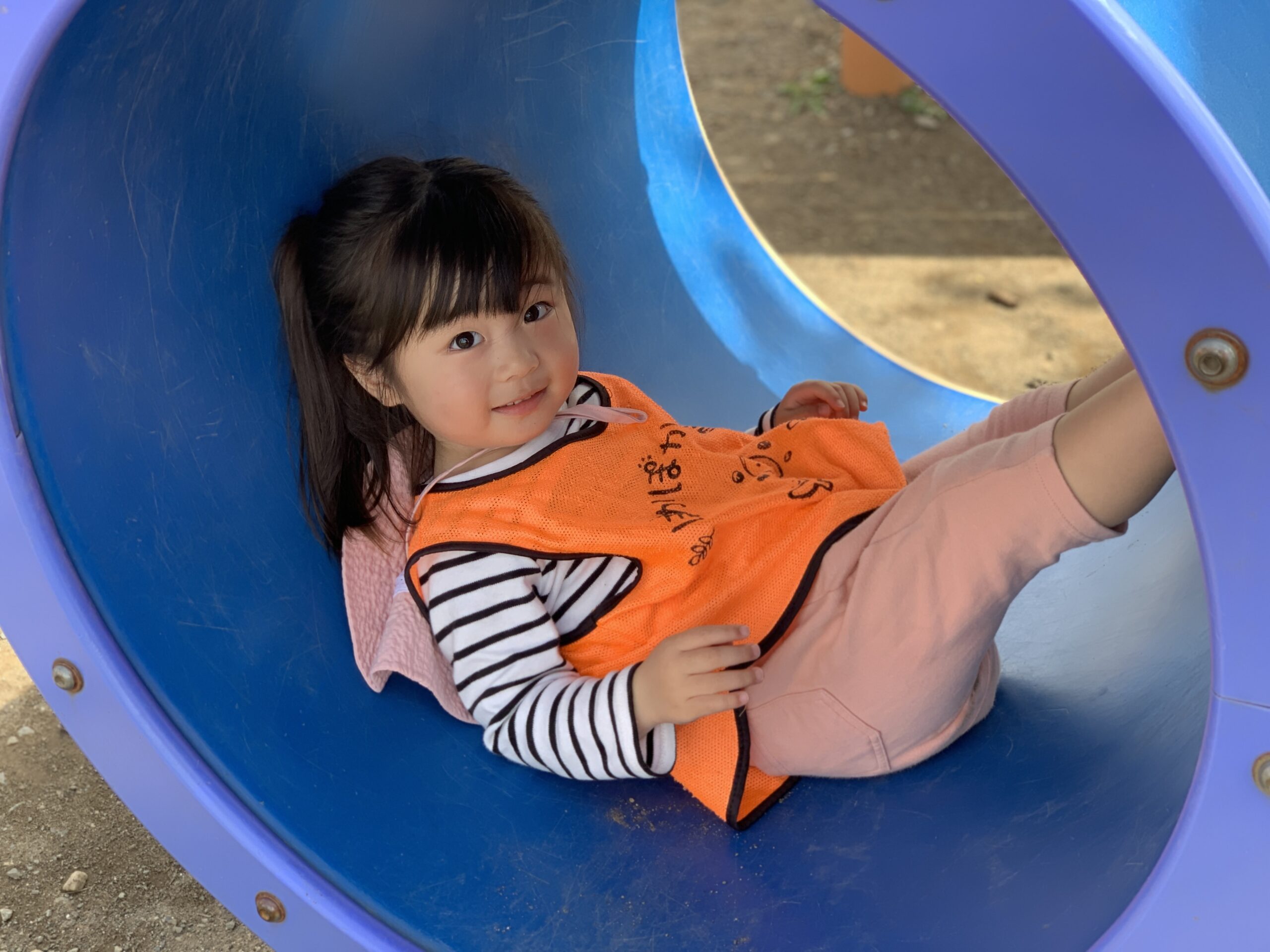 広場にあるアスレチックでは、子どもたちがのびのびと身体を動かし、楽しそうな声があちこちから響いてきました。鉄製のアスレチックのまるい輪っかの中に入って、「まるのなかすずしいよ〜!」と、満面の笑みで教えてくれた子もいました。