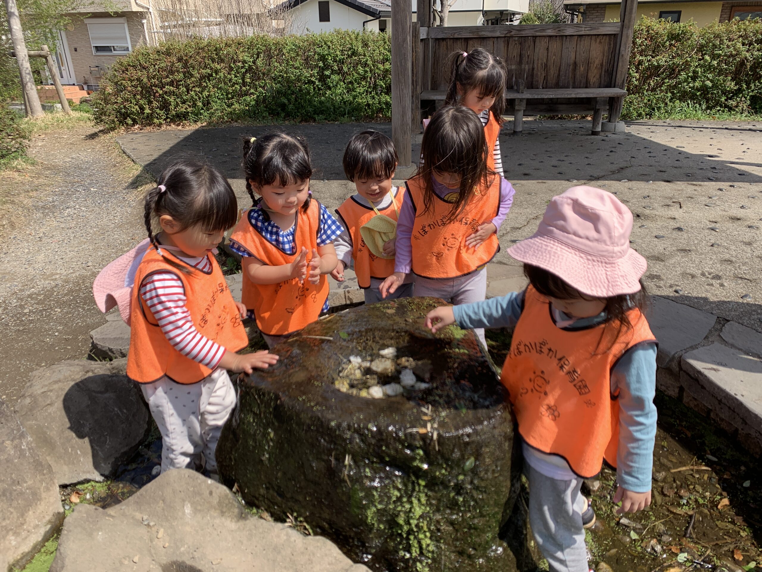 そしてなんと今日は、日差しが強かったので、広場で「少し早い水遊び」も体験!洋服がちょっぴり濡れてしまってもへっちゃらで、「つめた〜い!」と笑いながら手をぴちゃぴちゃ。思いがけない水遊びに、まさかの大盛り上がり。こんな春先から水遊びが始まるなんて…私たちもびっくりです(笑)