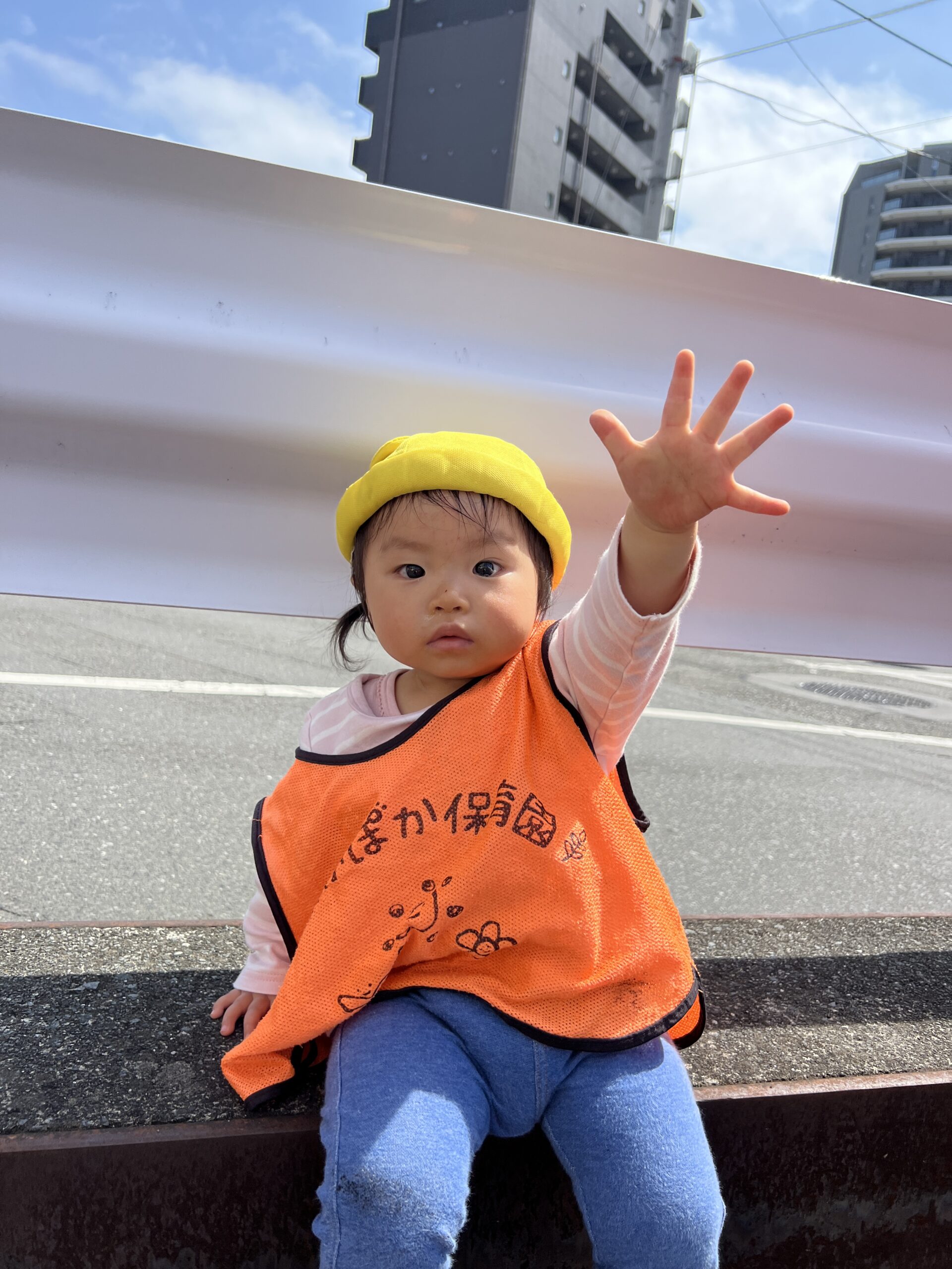 まだ歩き始めたばかりの0歳さんや、1歳の子どもたちは、少しだけ駅の方へお散歩へ。するとちょうど電車がホームに入ってきて、「ばいばーい!」と手を振る姿が。