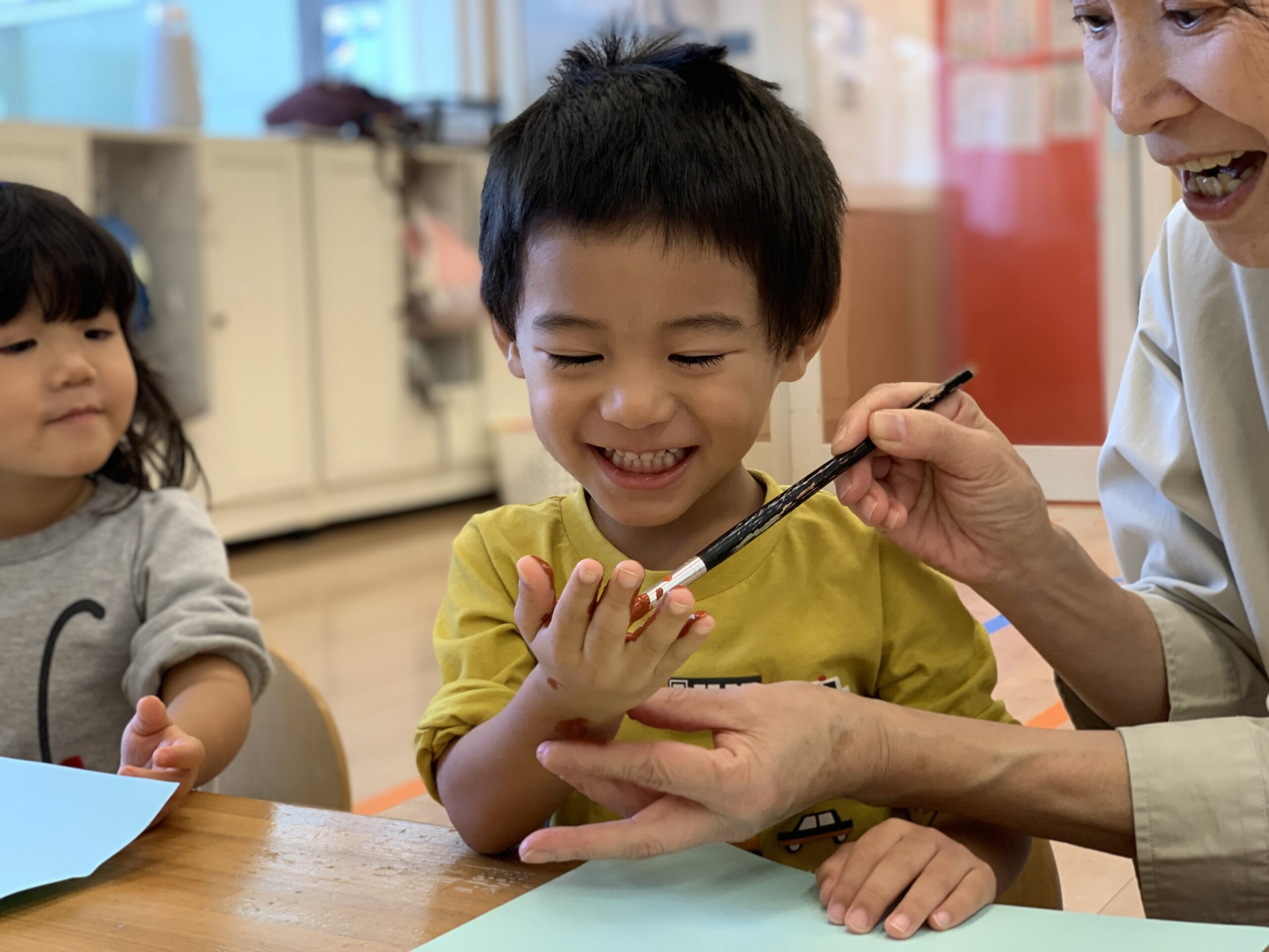 一人ひとりの手のひらに絵の具を塗っていくと、反応は様々です!
