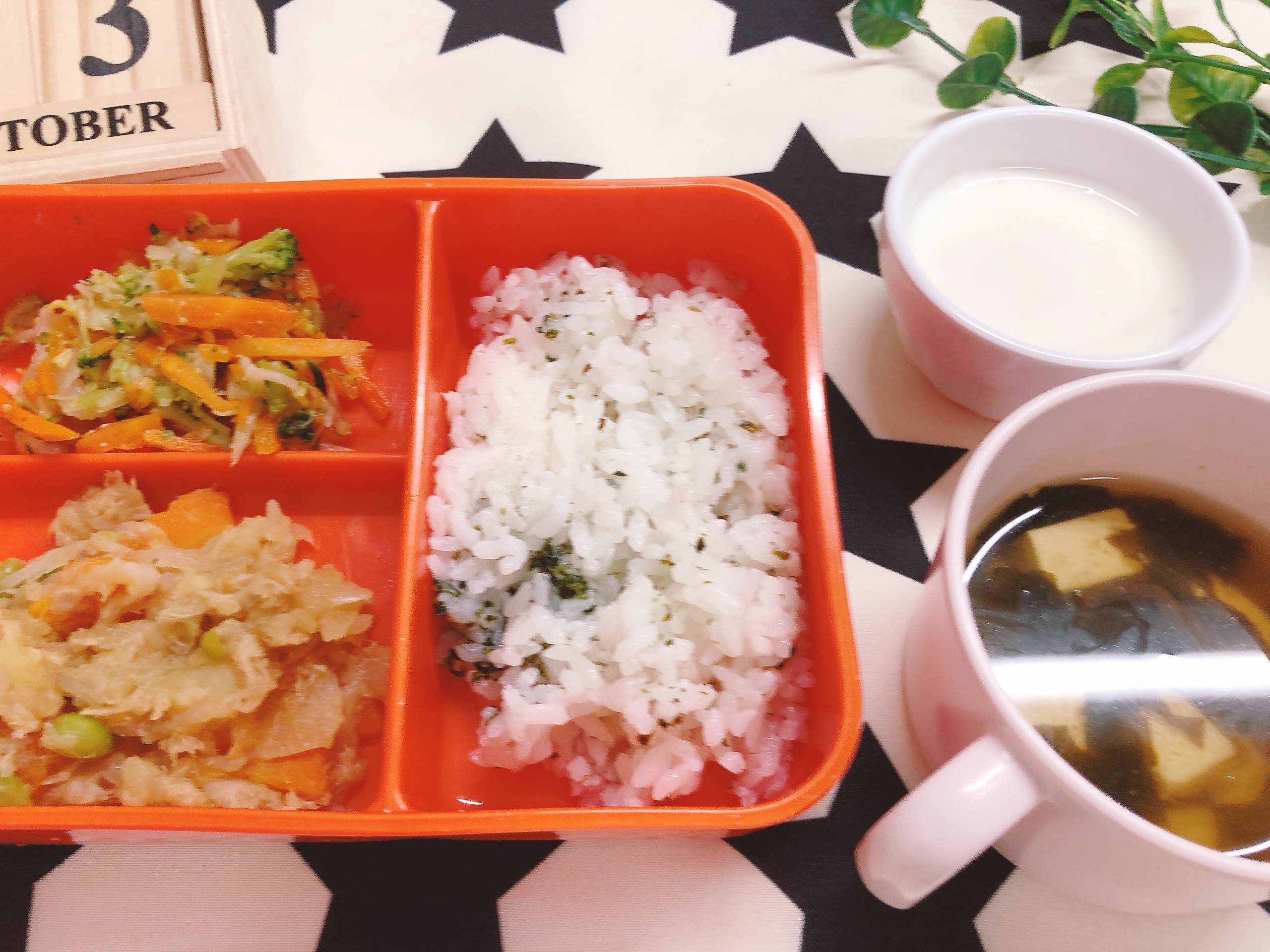 メニュー名:青のりご飯、すまし汁、ツナじゃが、ブロッコリーのみそ和え、ヨーグルト